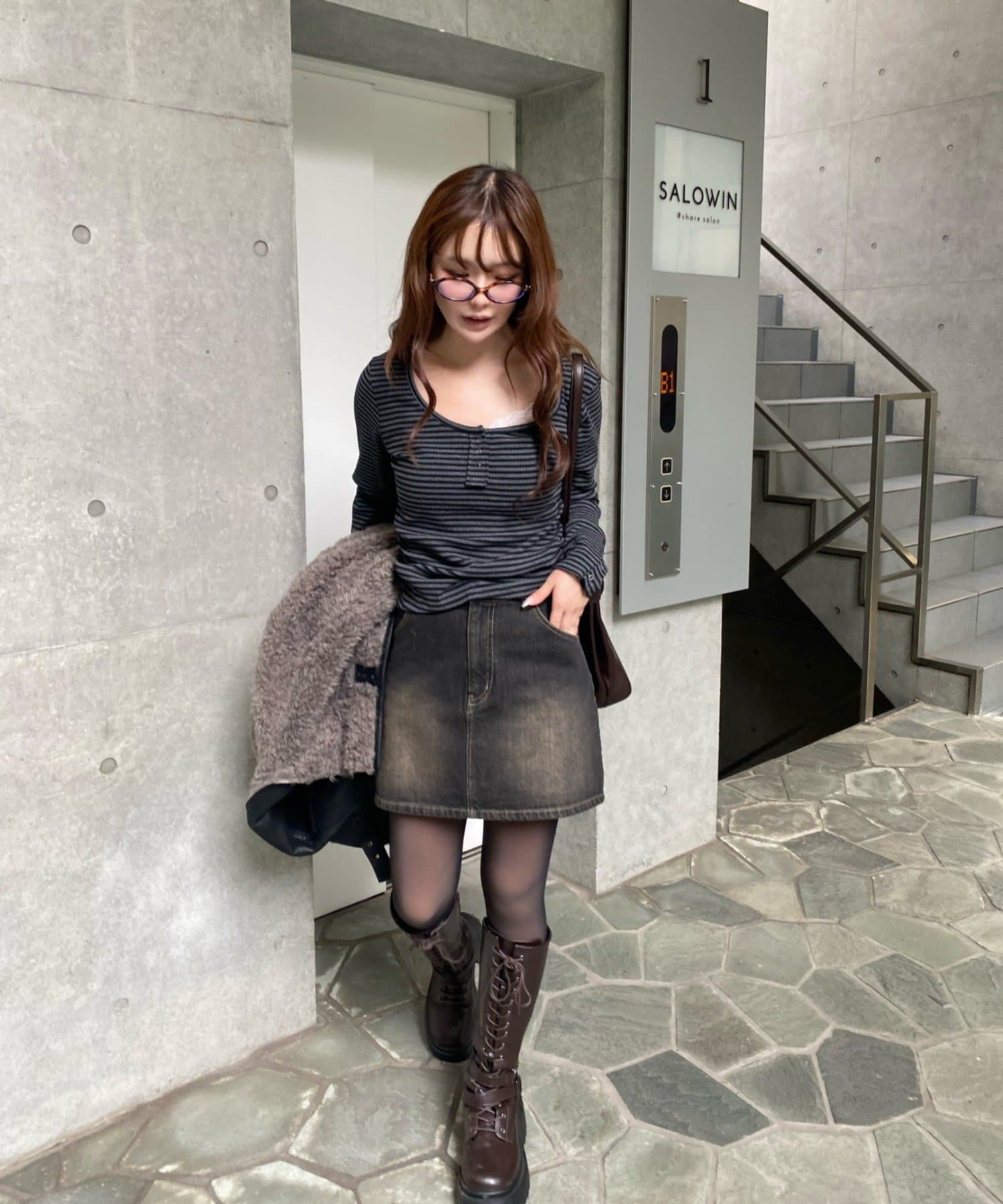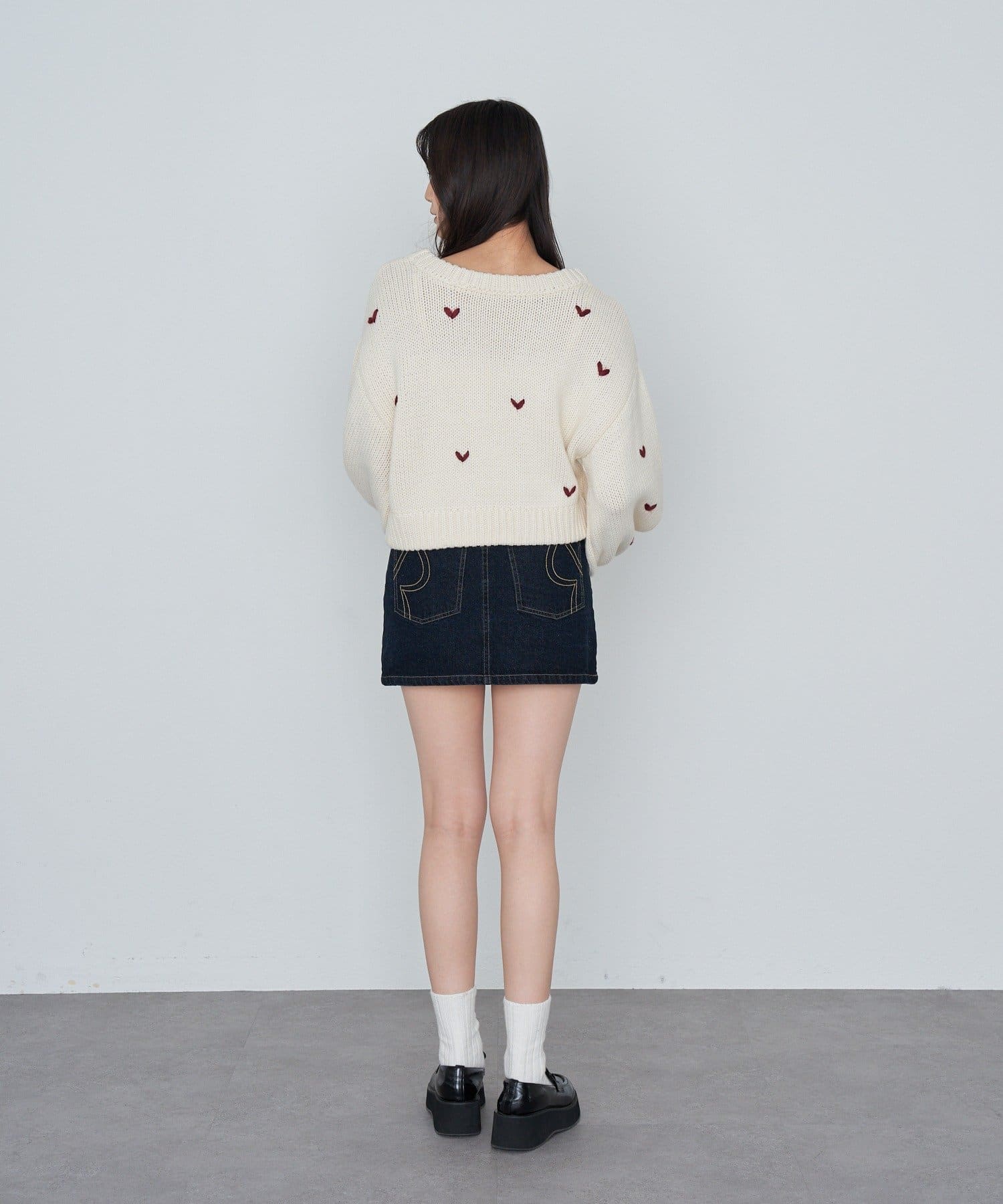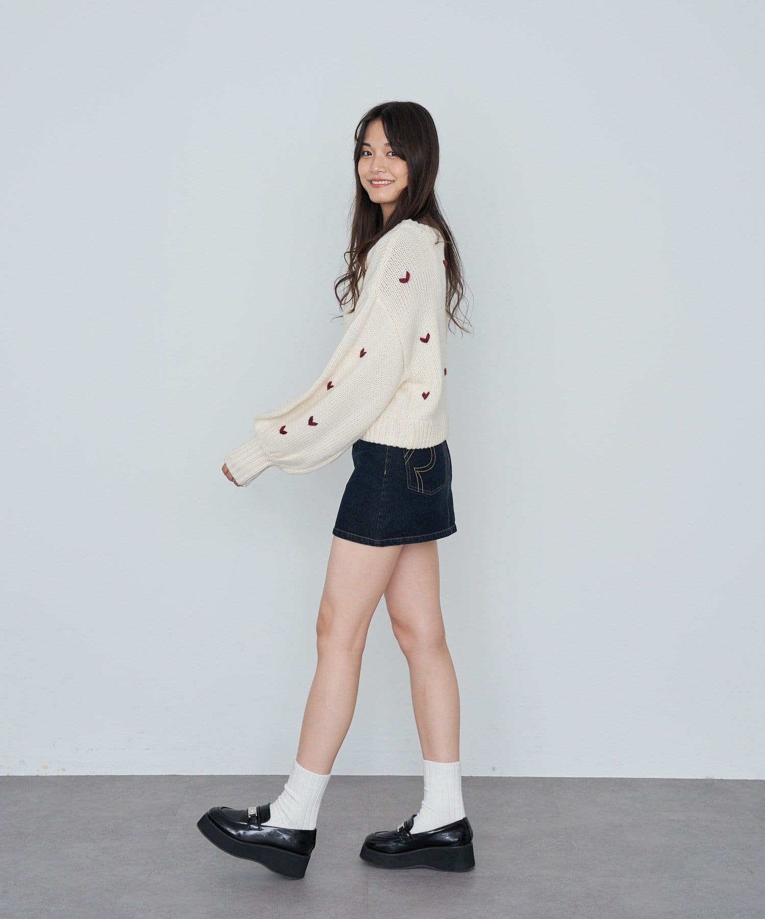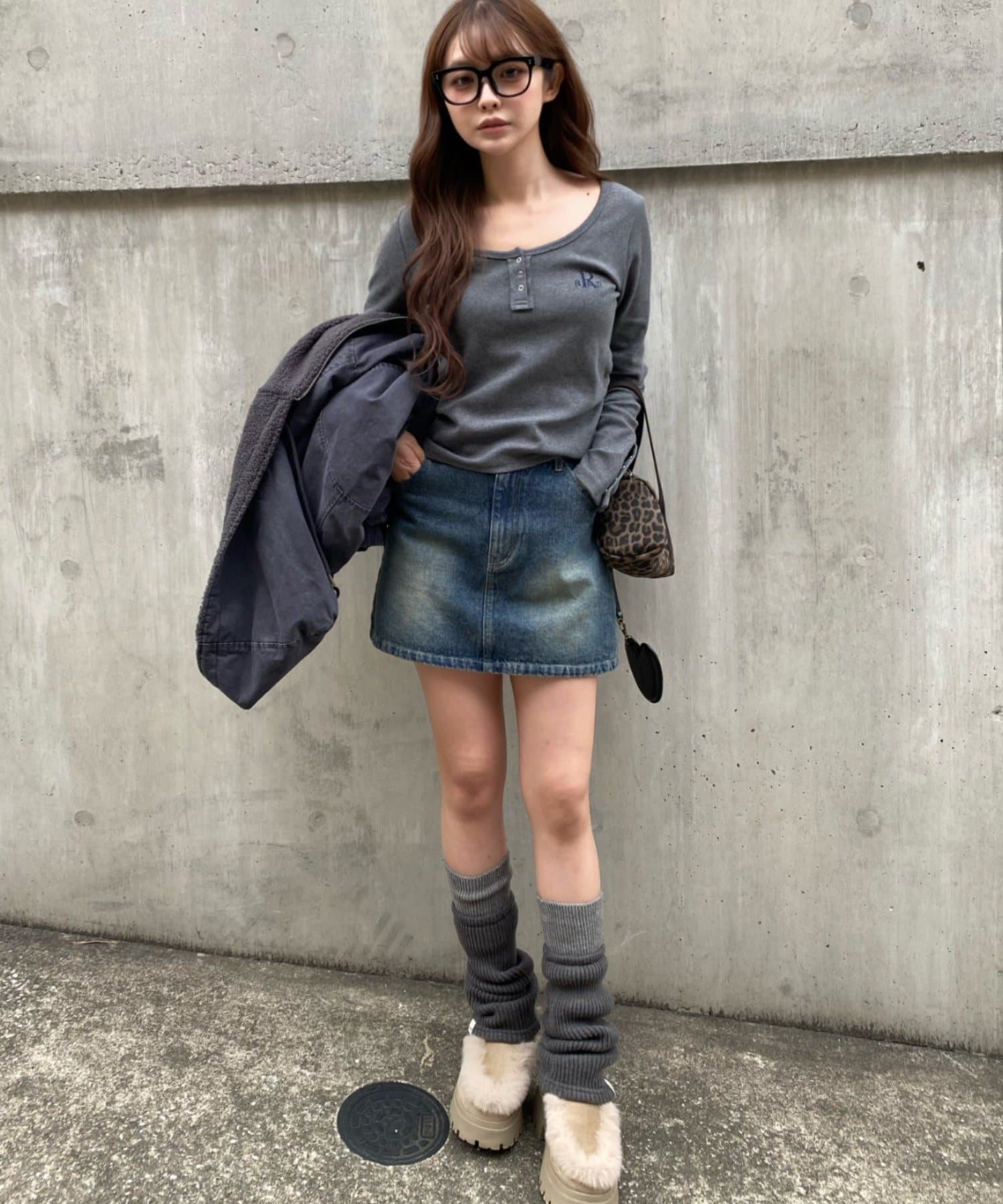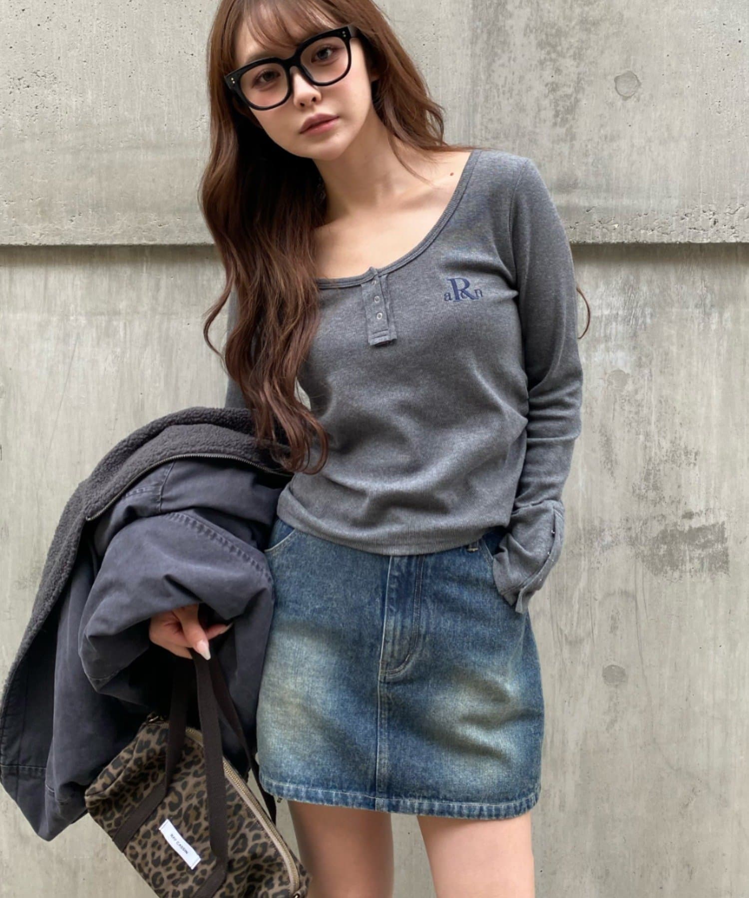 ・幼く見えやすいデニムスカートですが、濃い目のカラーなら大人っぽく着られます。