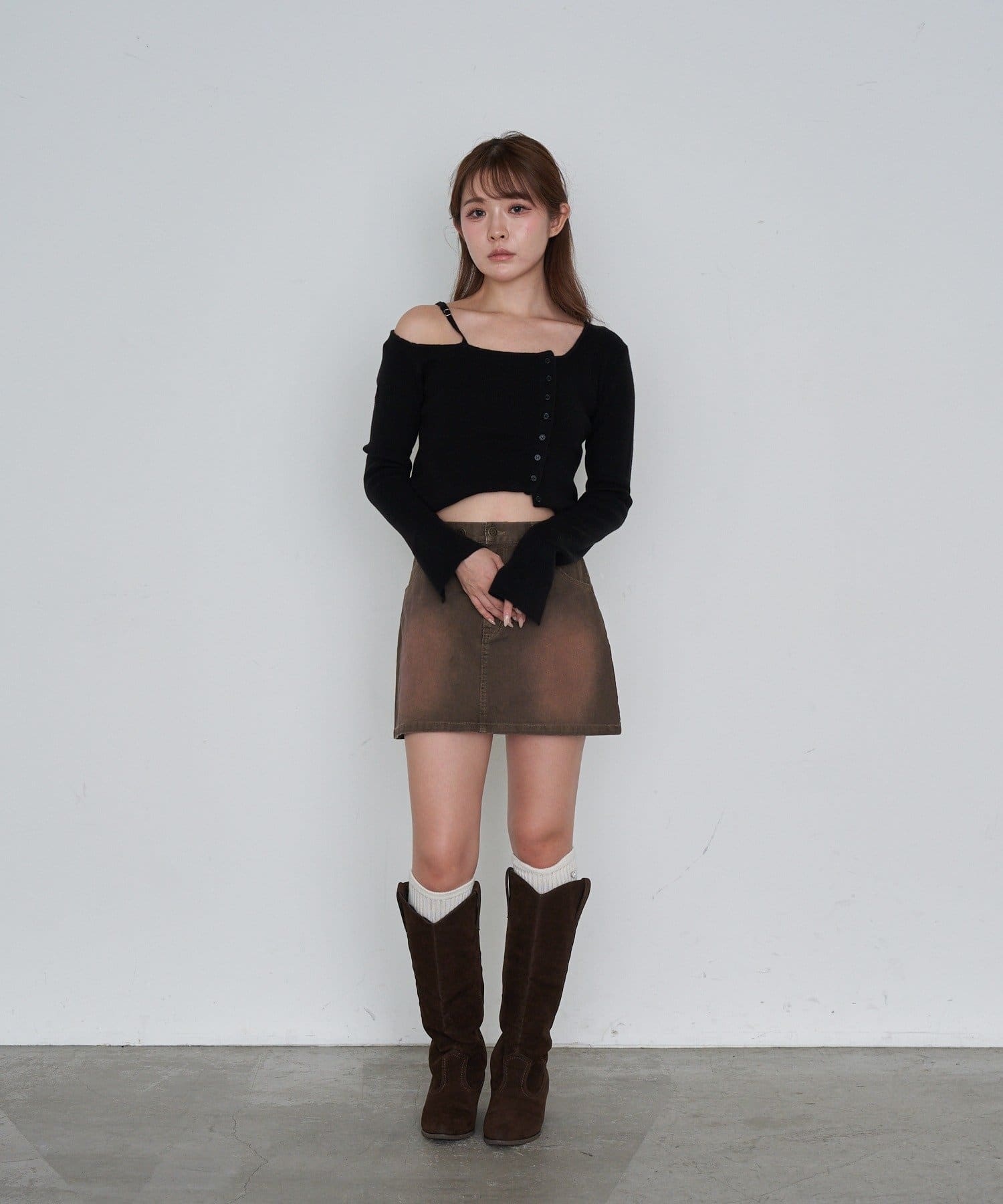 ・幼く見えやすいデニムスカートですが、濃い目のカラーなら大人っぽく着られます。