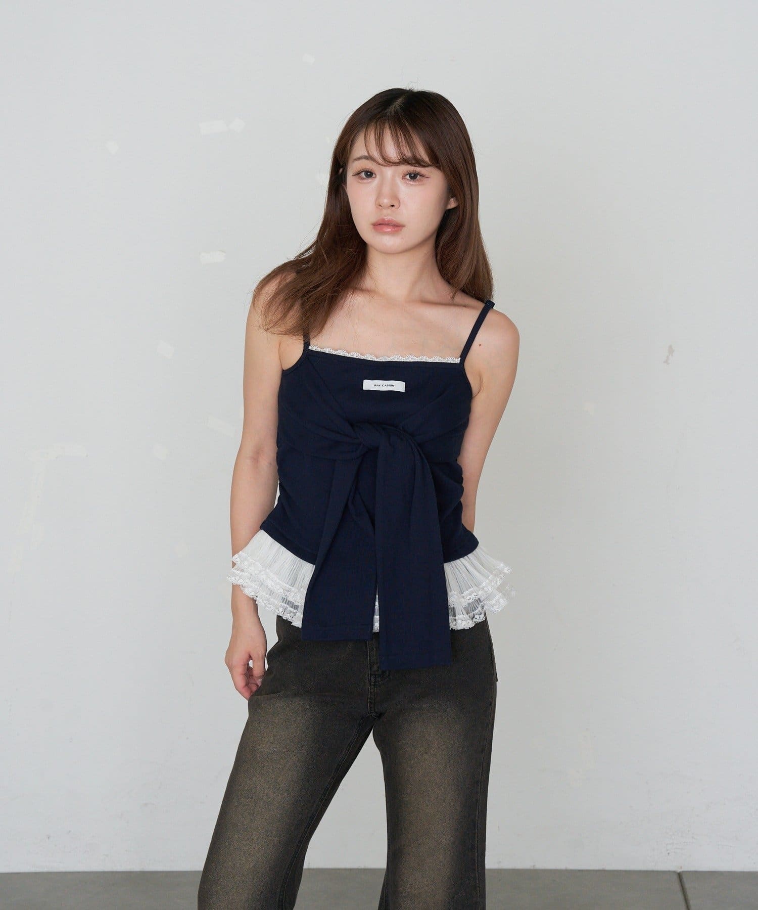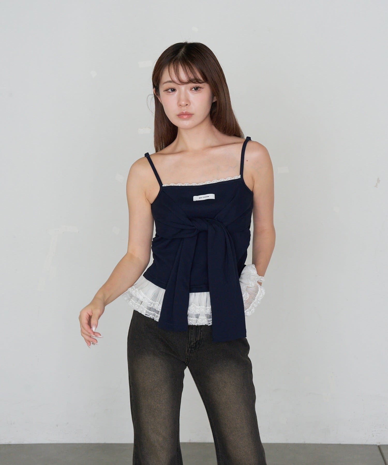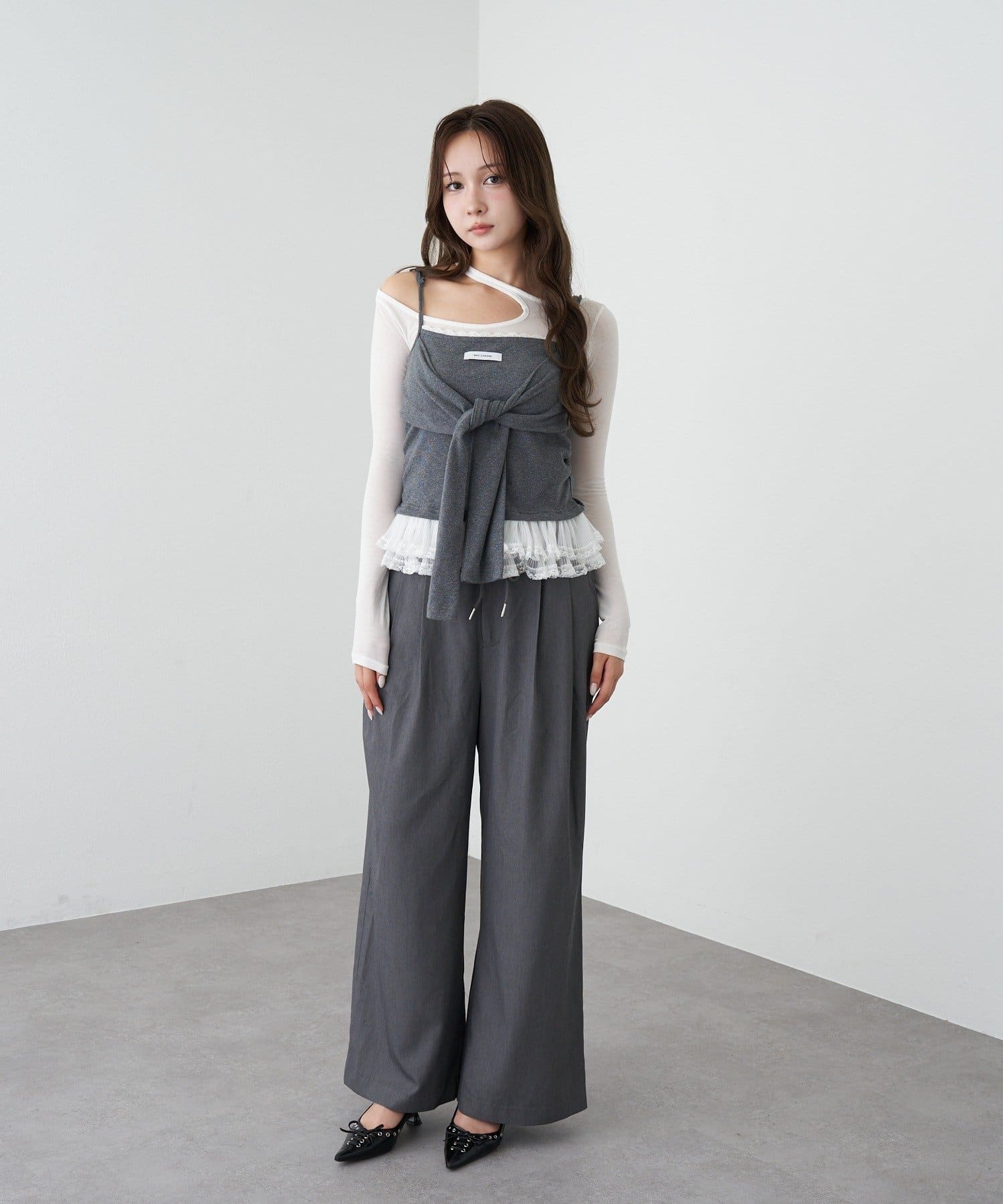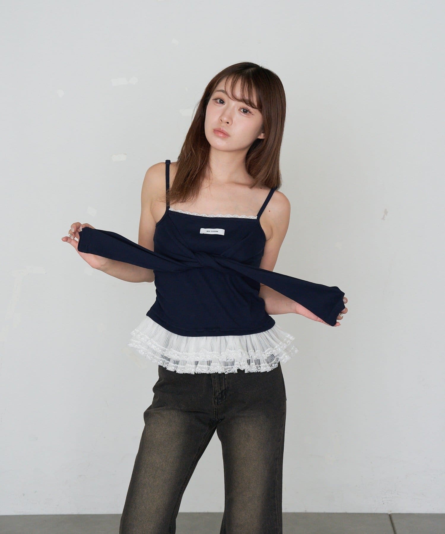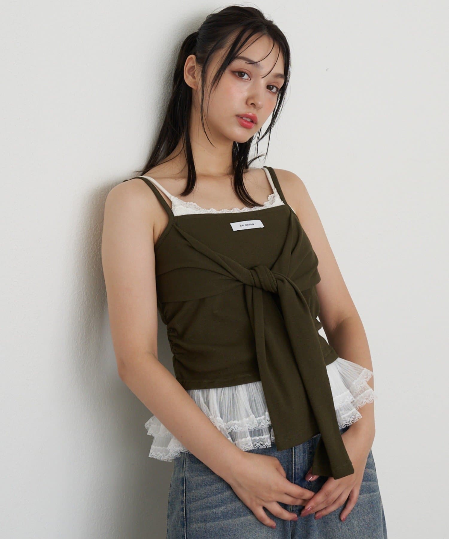 レースキャミと重ねて胸元からもレースが見えるように着るのがかわいいです🤍