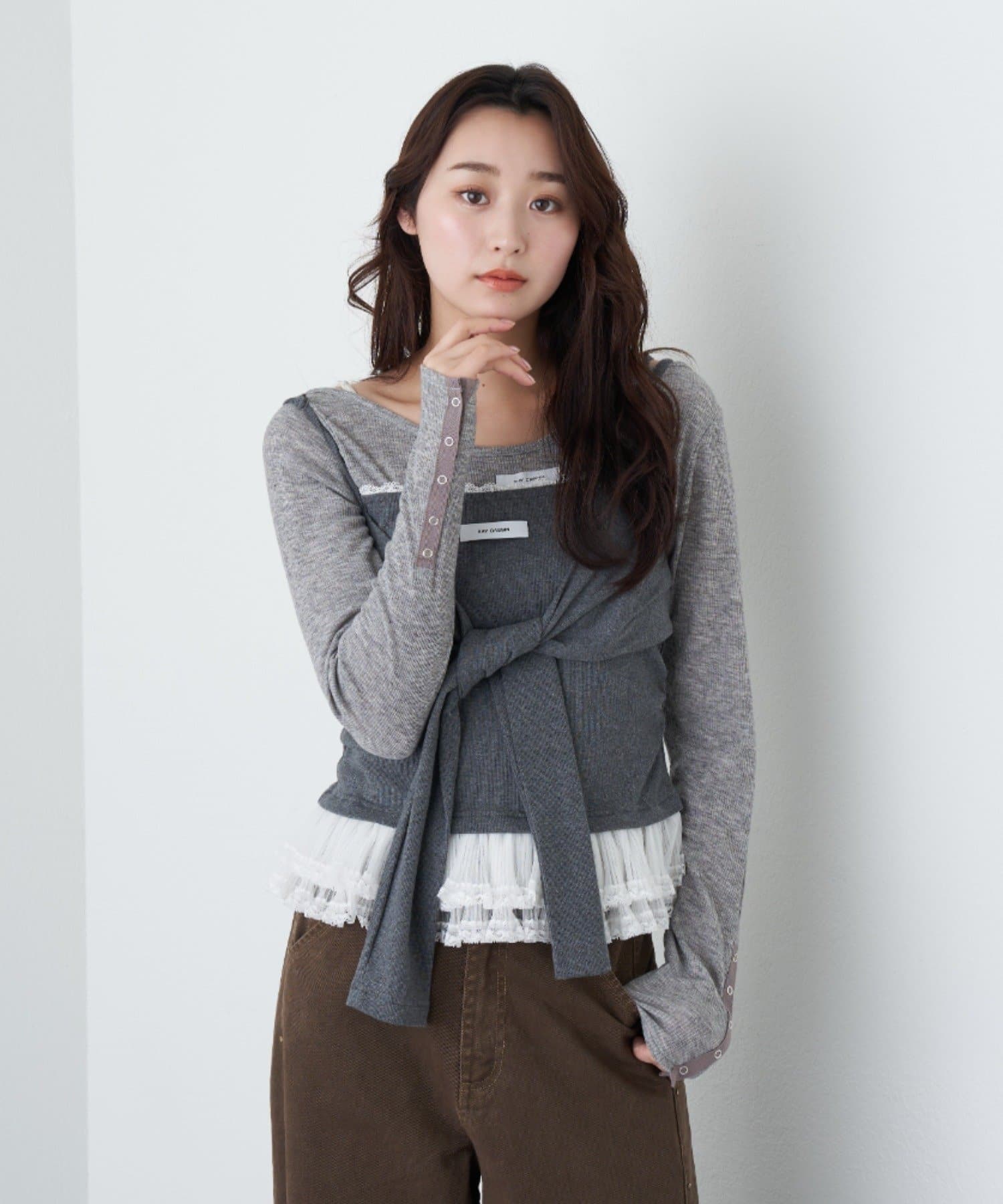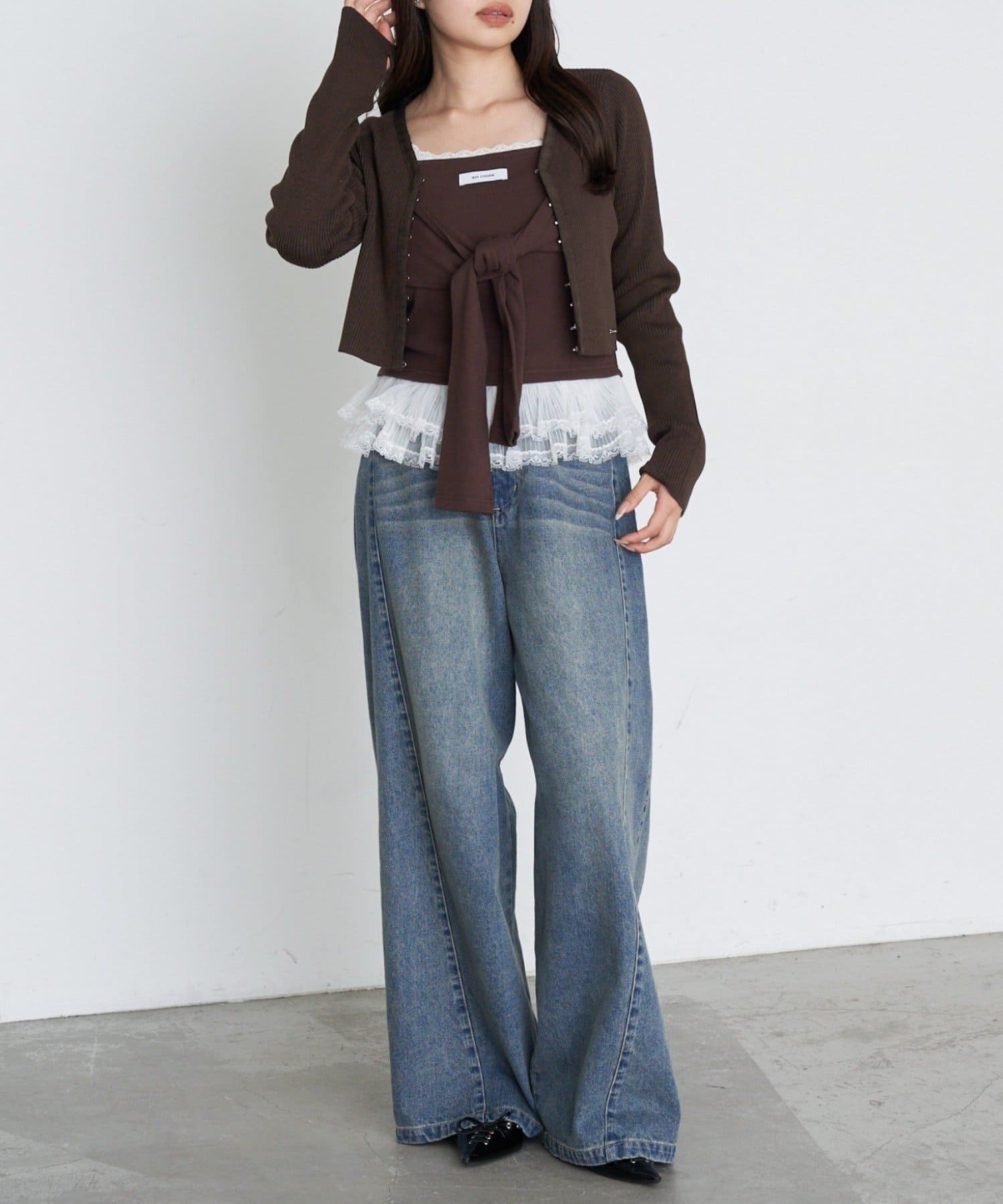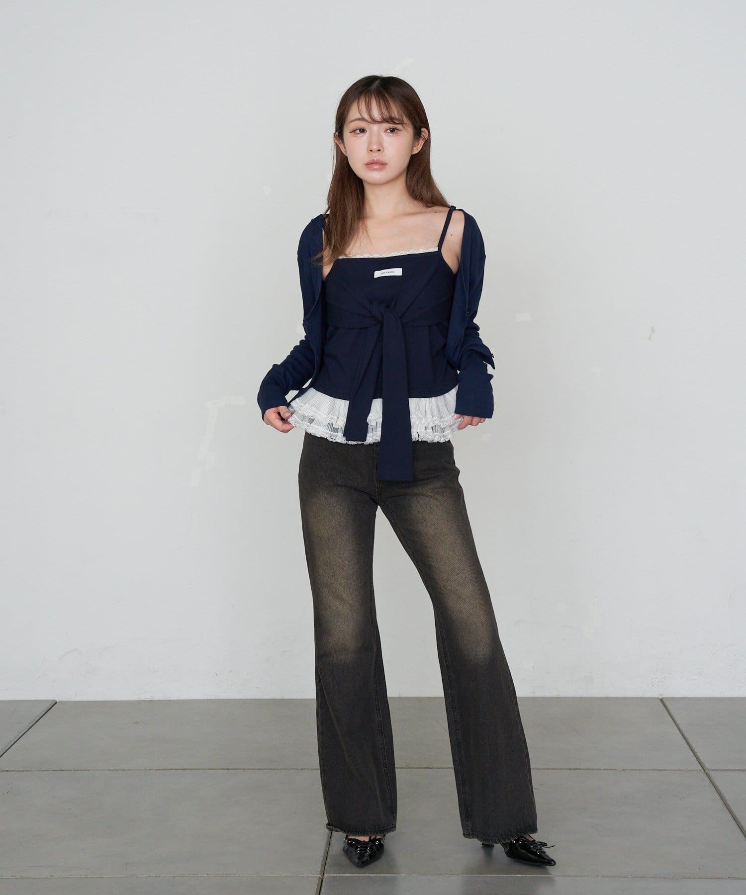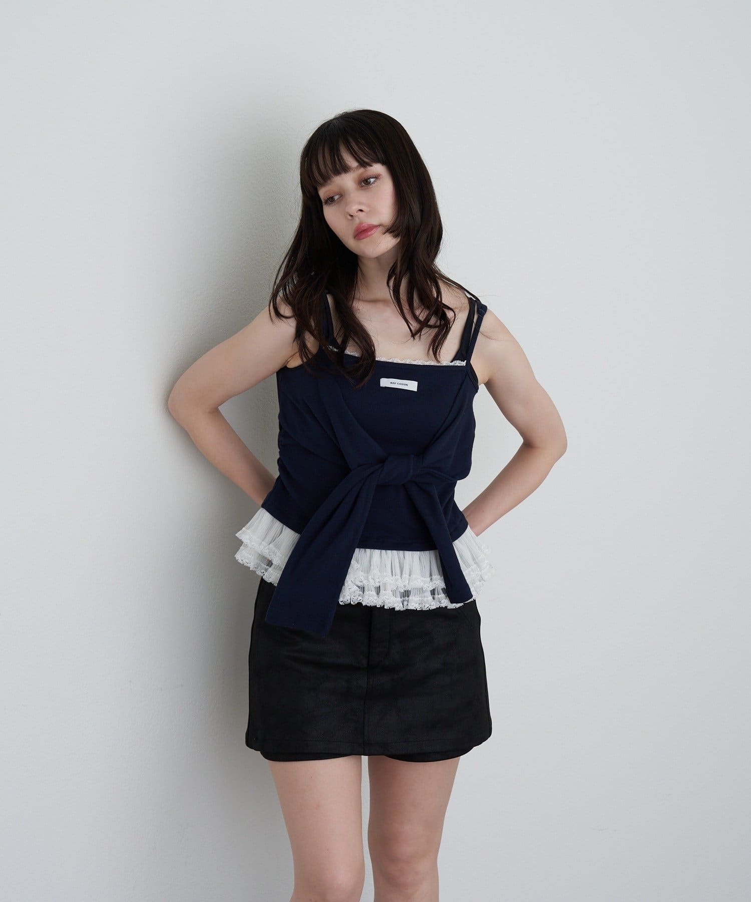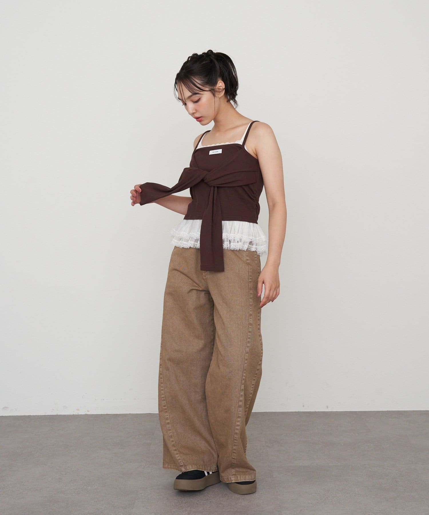 レースキャミと重ねて胸元からもレースが見えるように着るのがかわいいです🤍