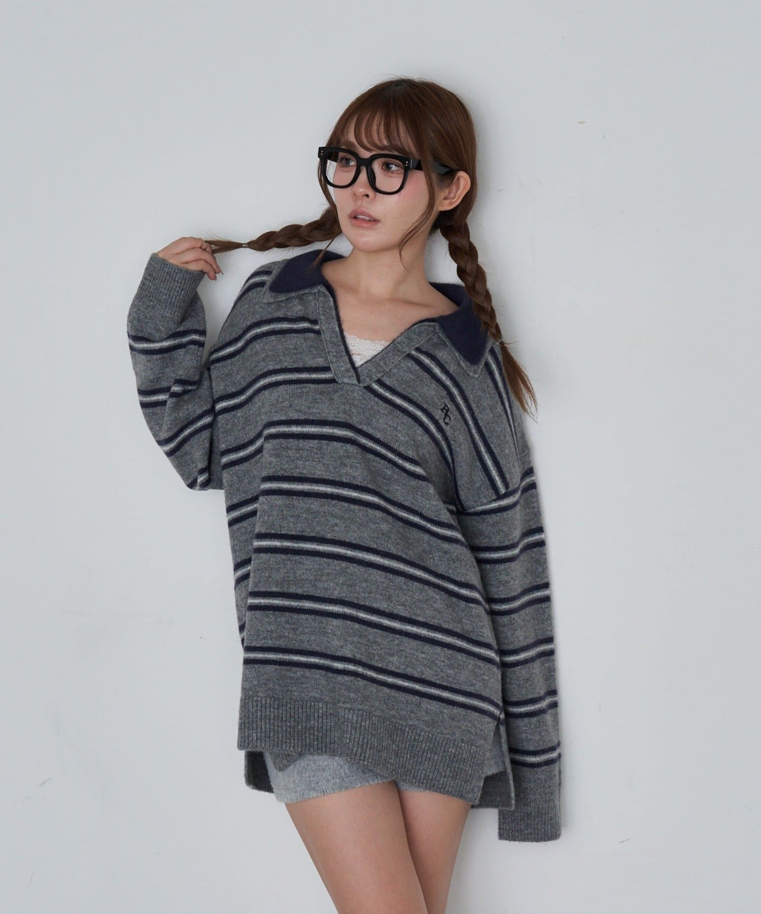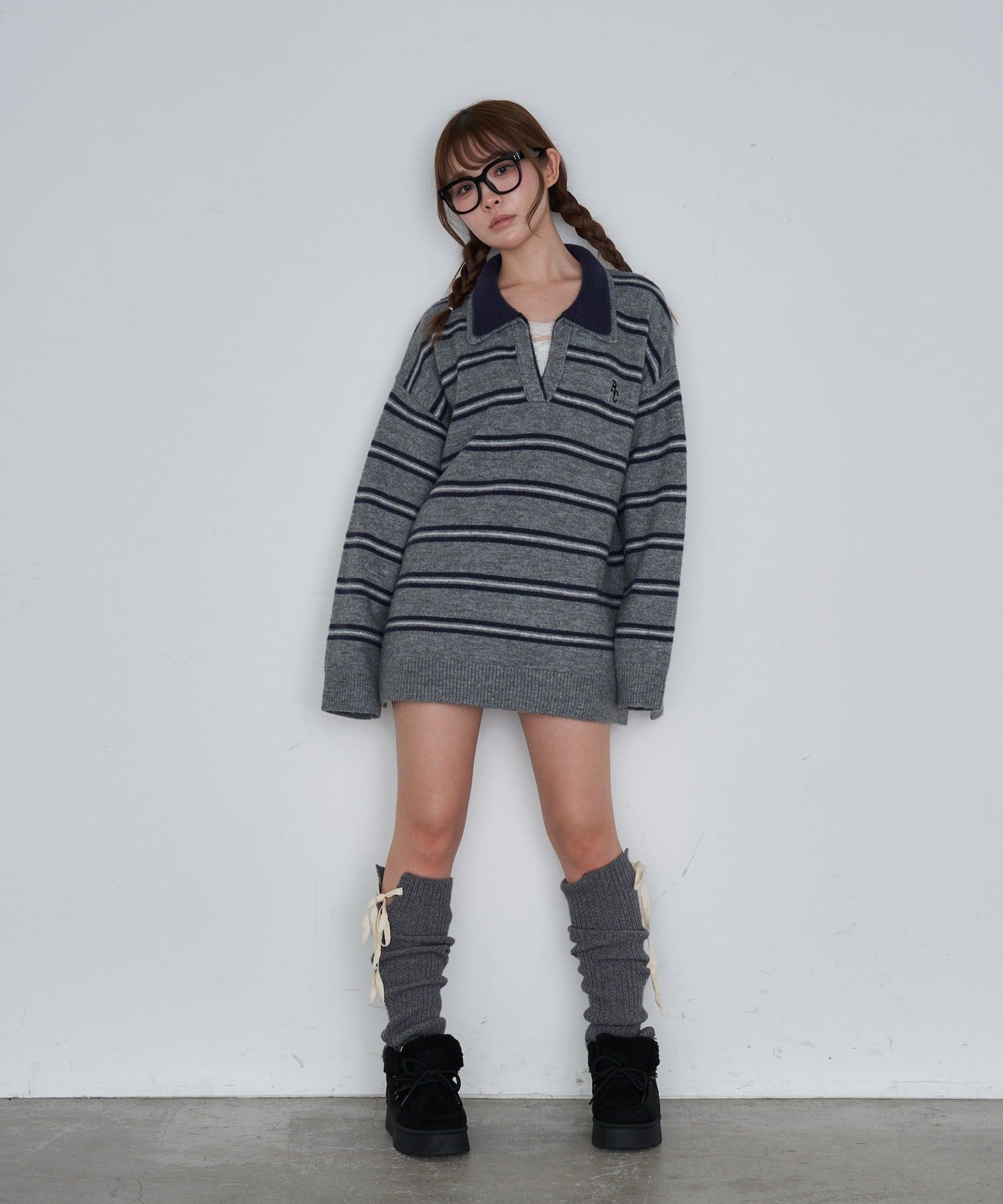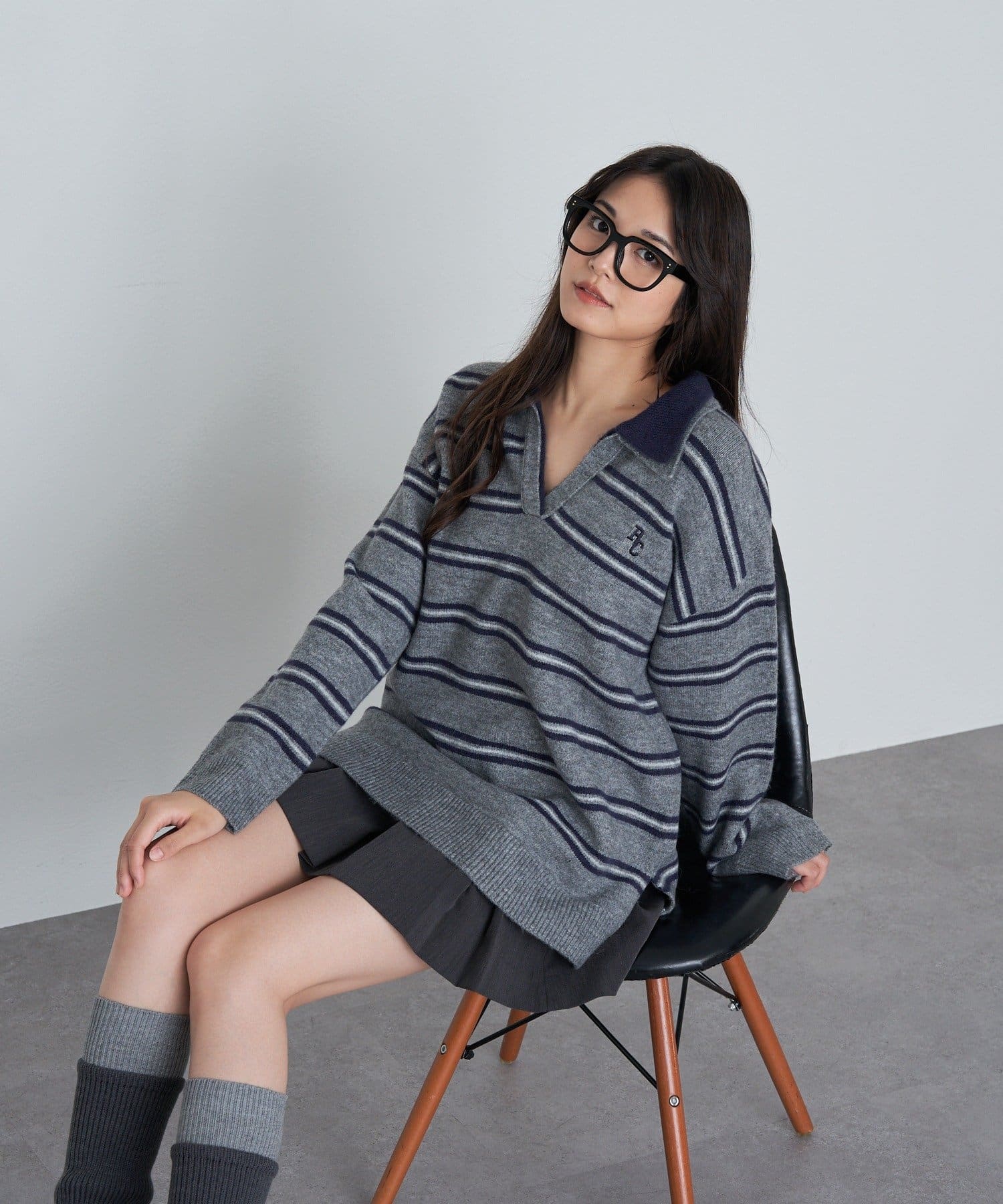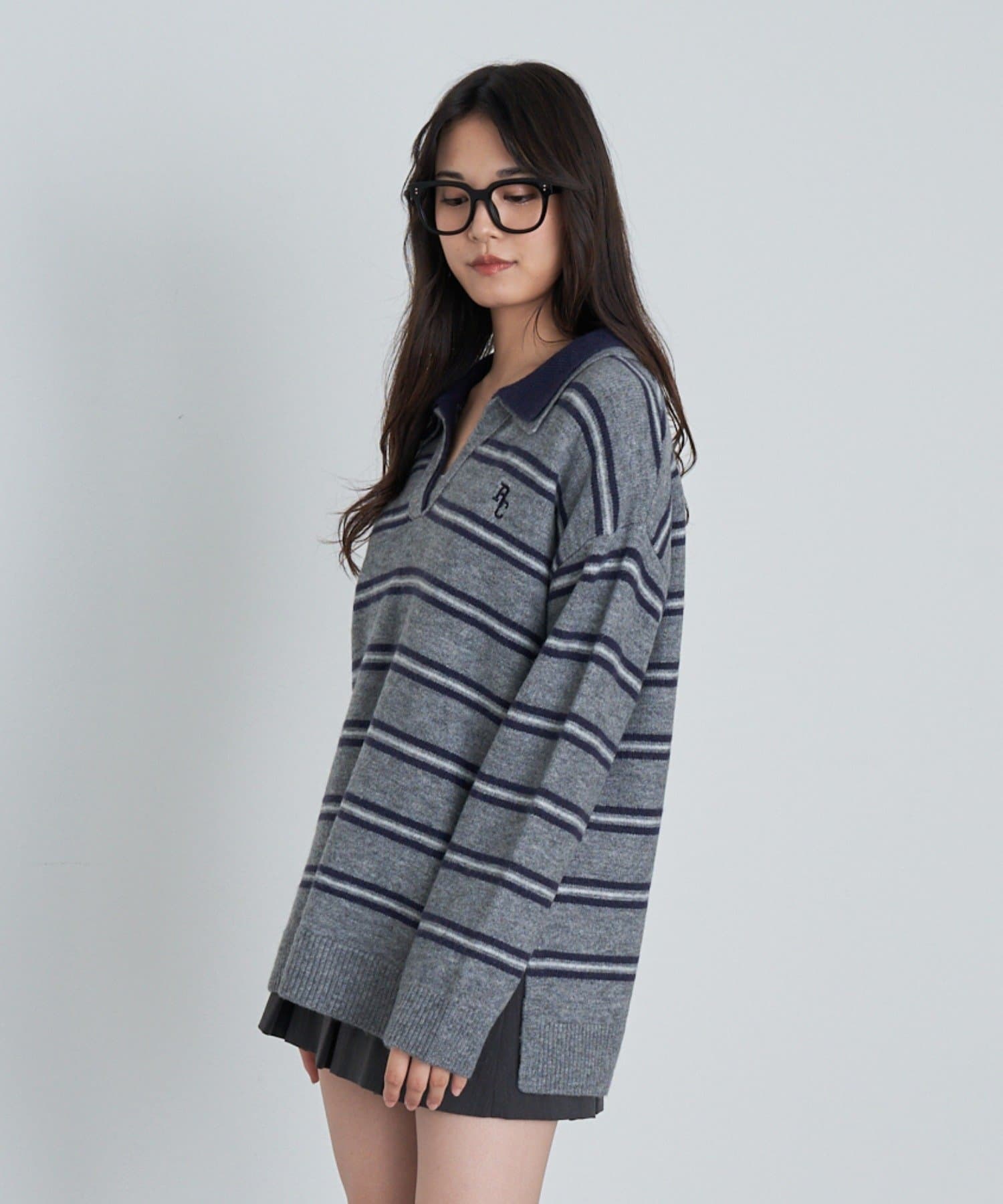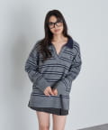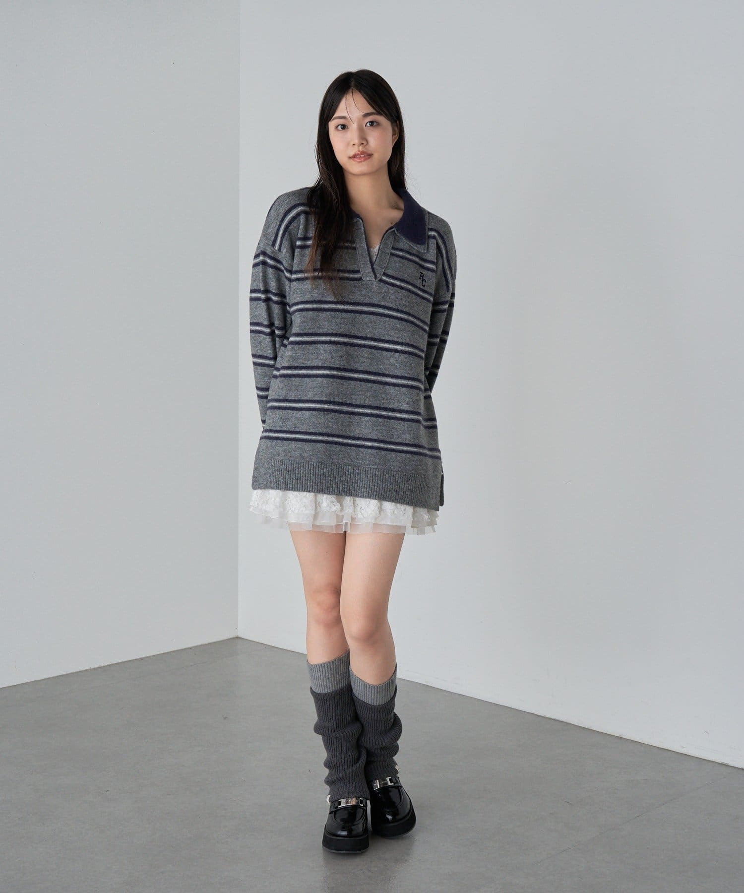 ボーダースキッパーポロ刺繍ニット