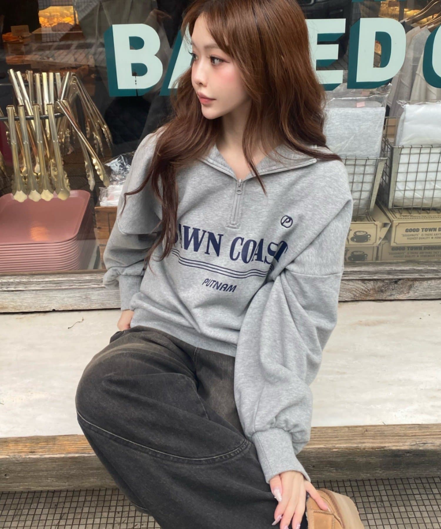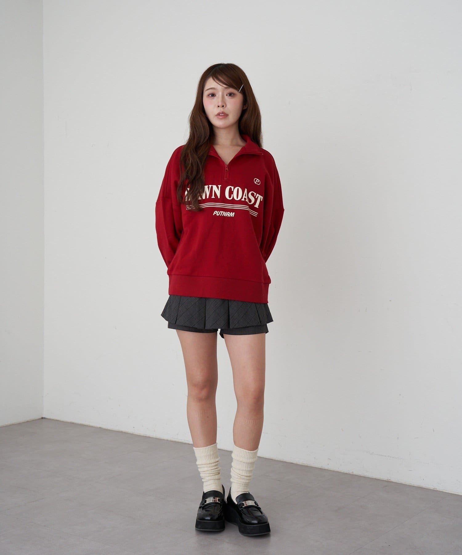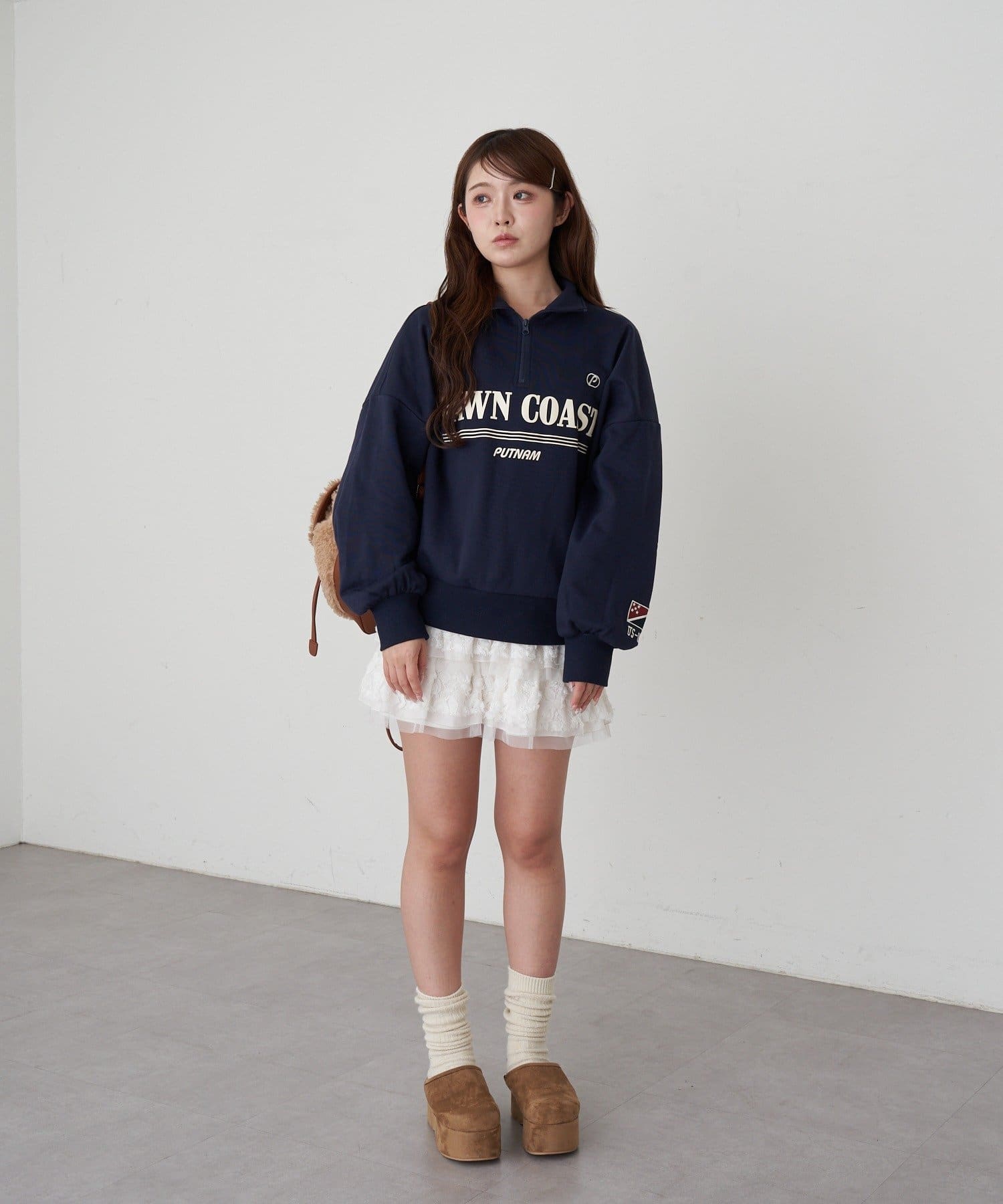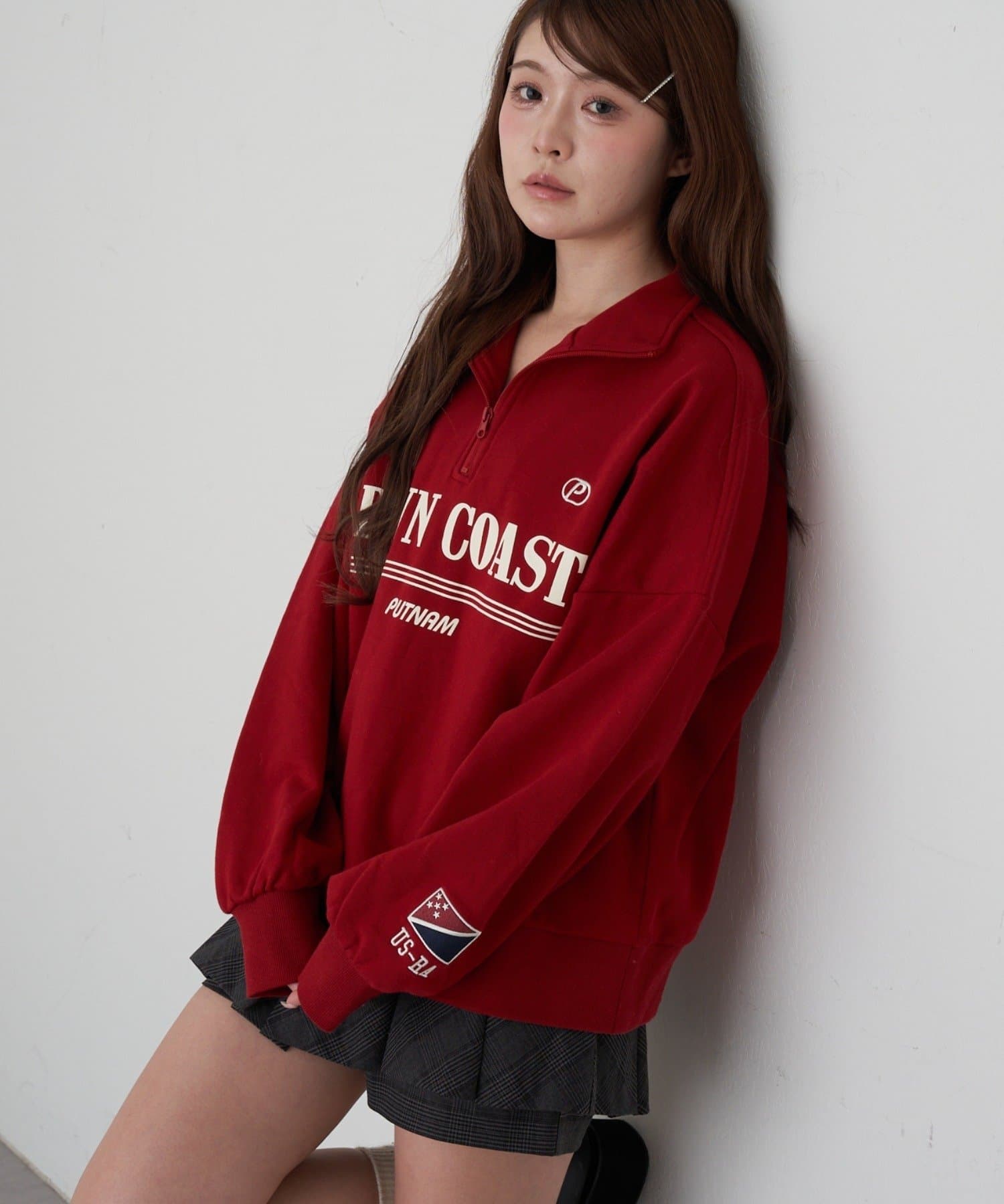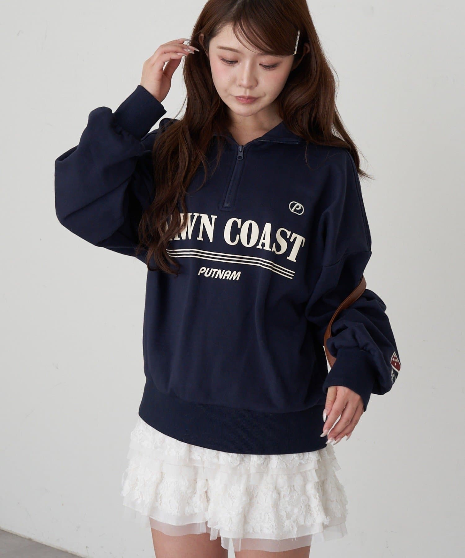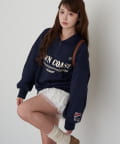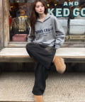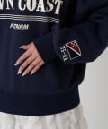 ・メンズっぽさのあるロゴですが、首元を見せることで女性らしく着られる1着です。