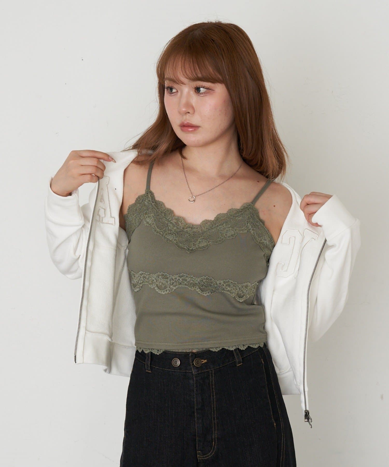 ・Vネックのニットやカーディガンと合わせてレースをチラ見せも◎