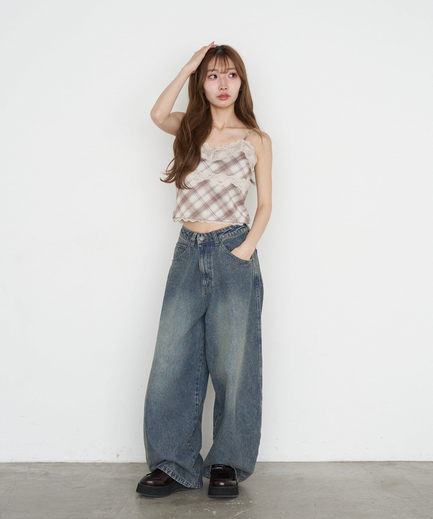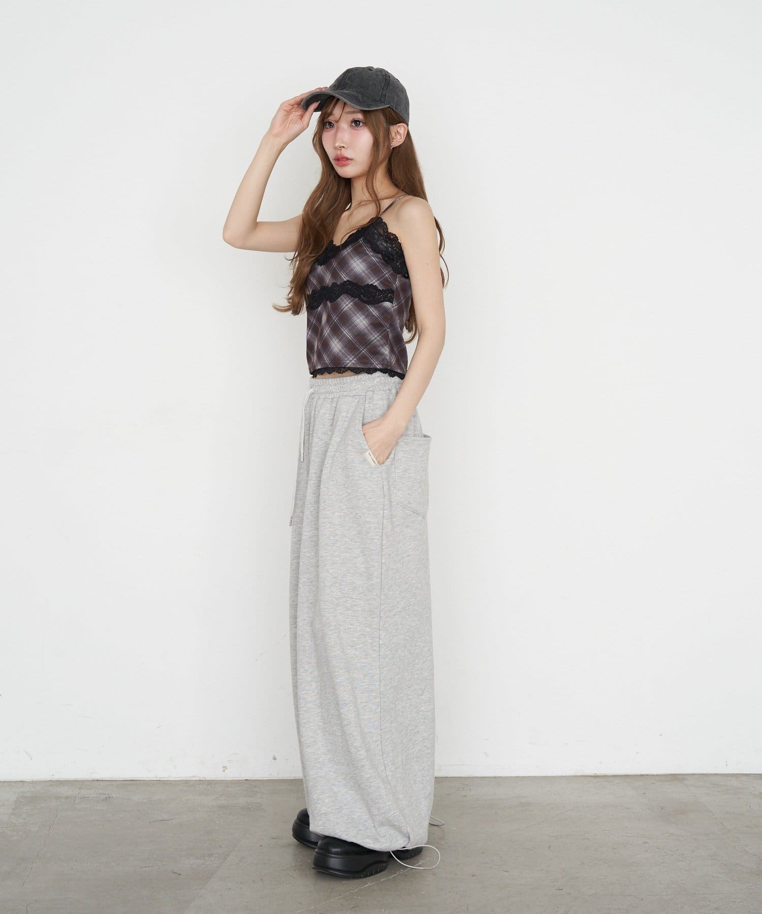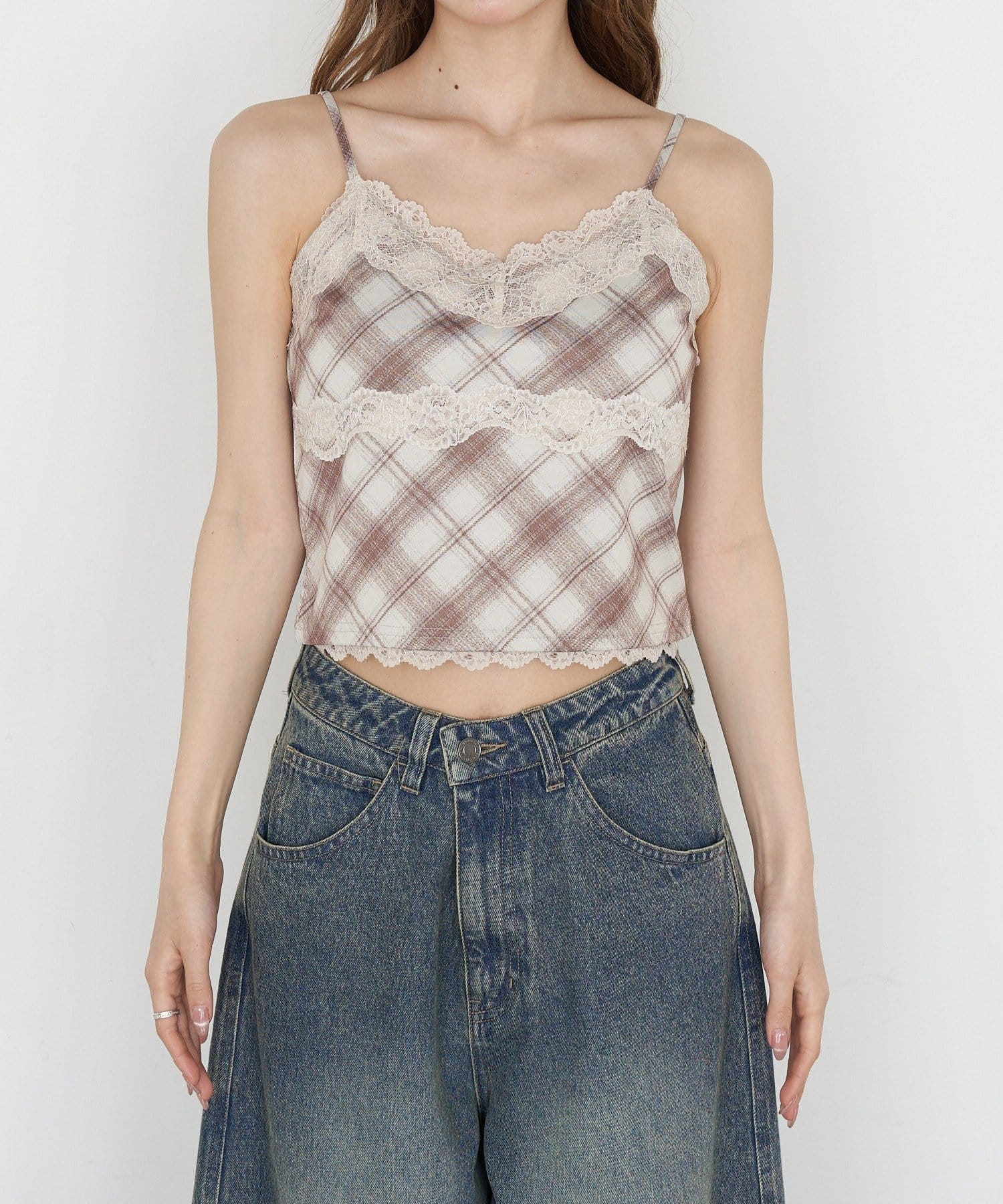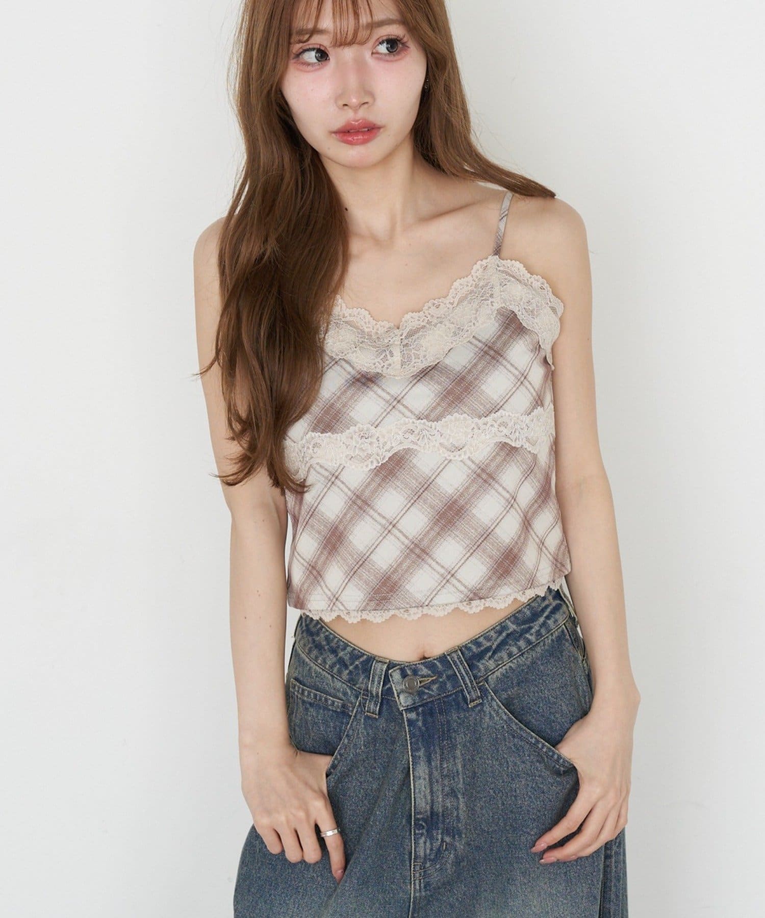 【7色展開 ・無地 / チェック】パット付レースキャミ