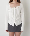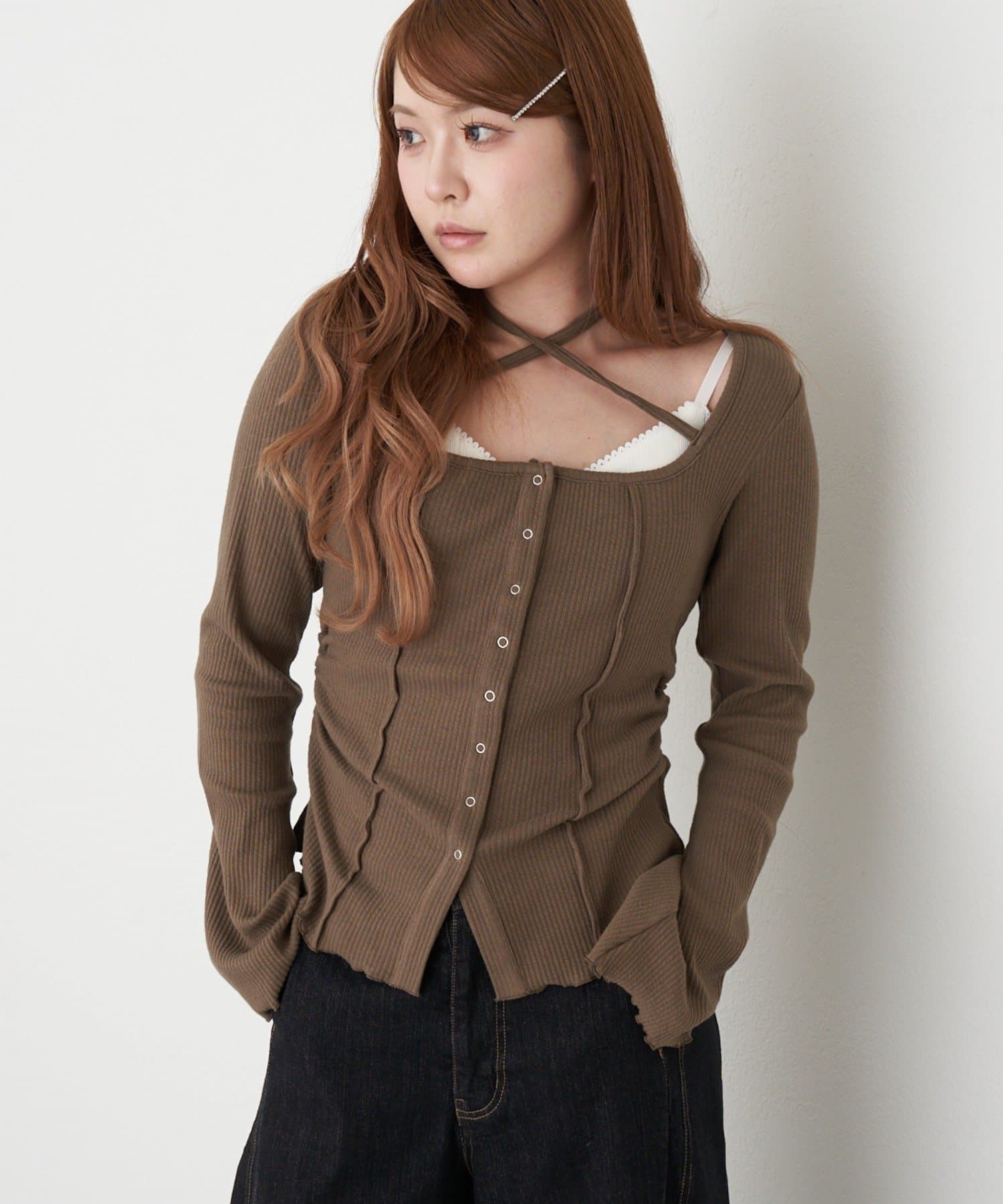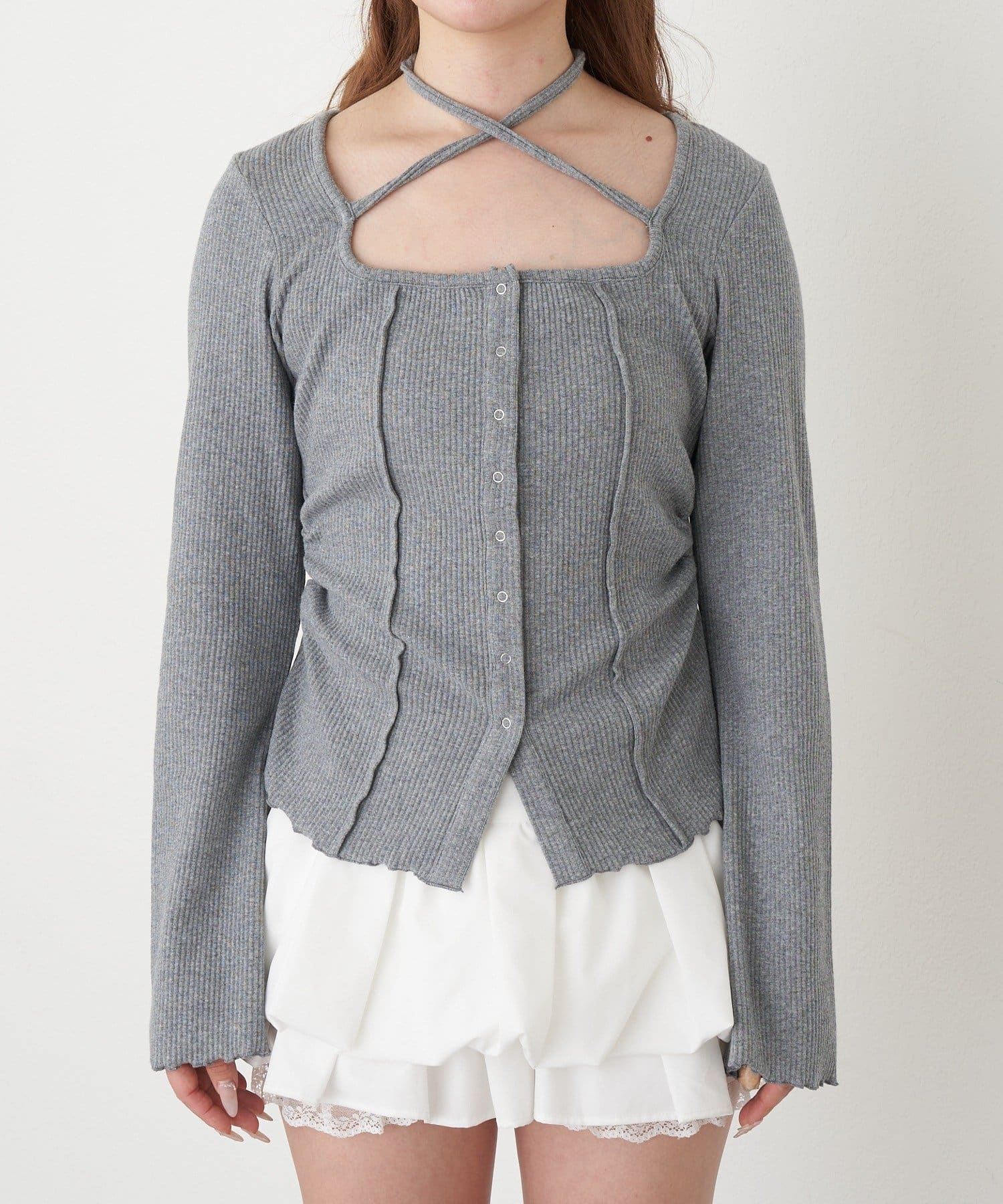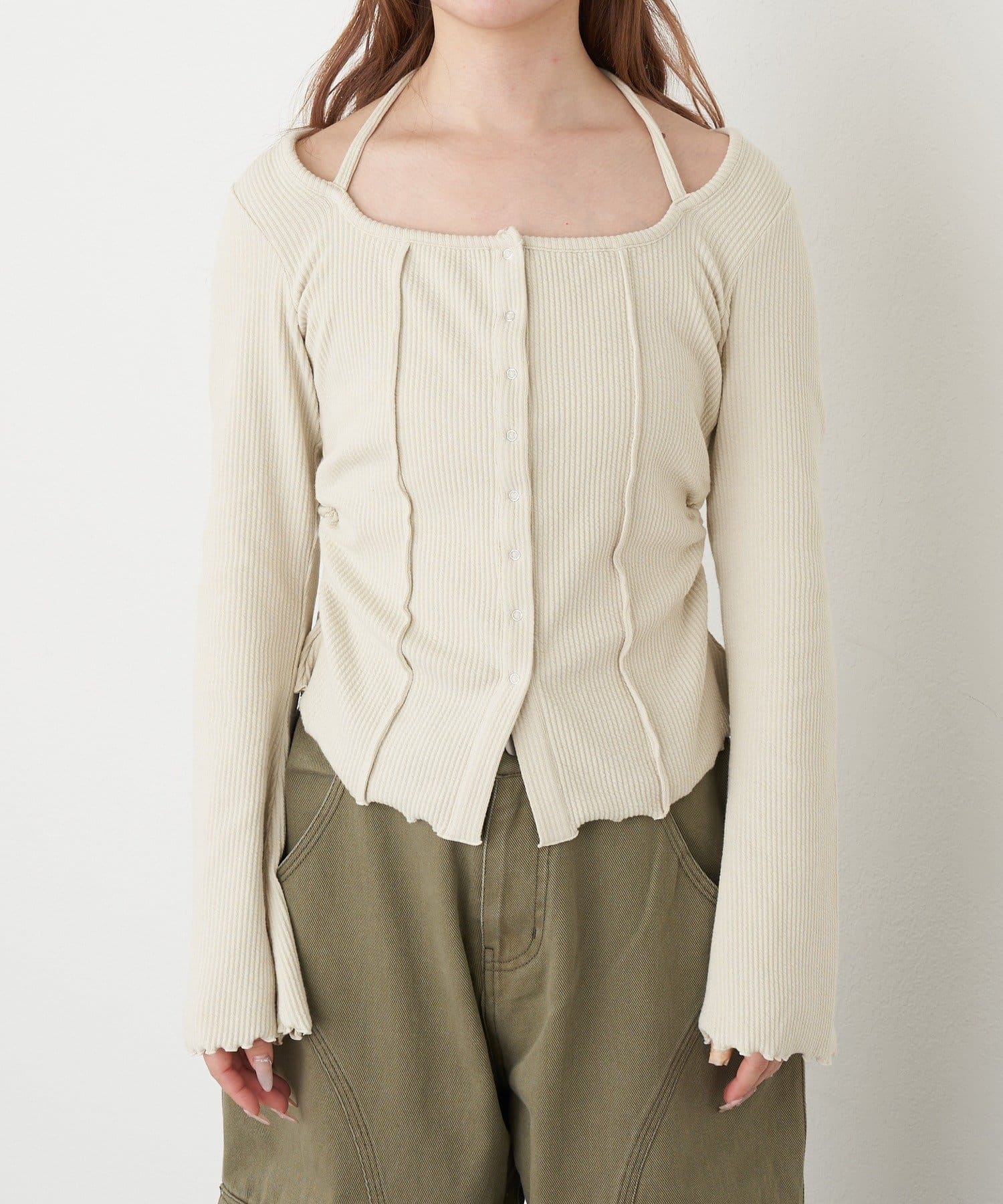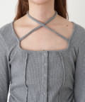 釦開き袖フレアクロス紐ロンT