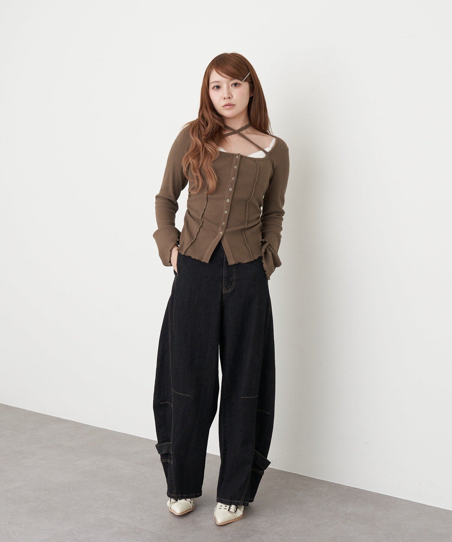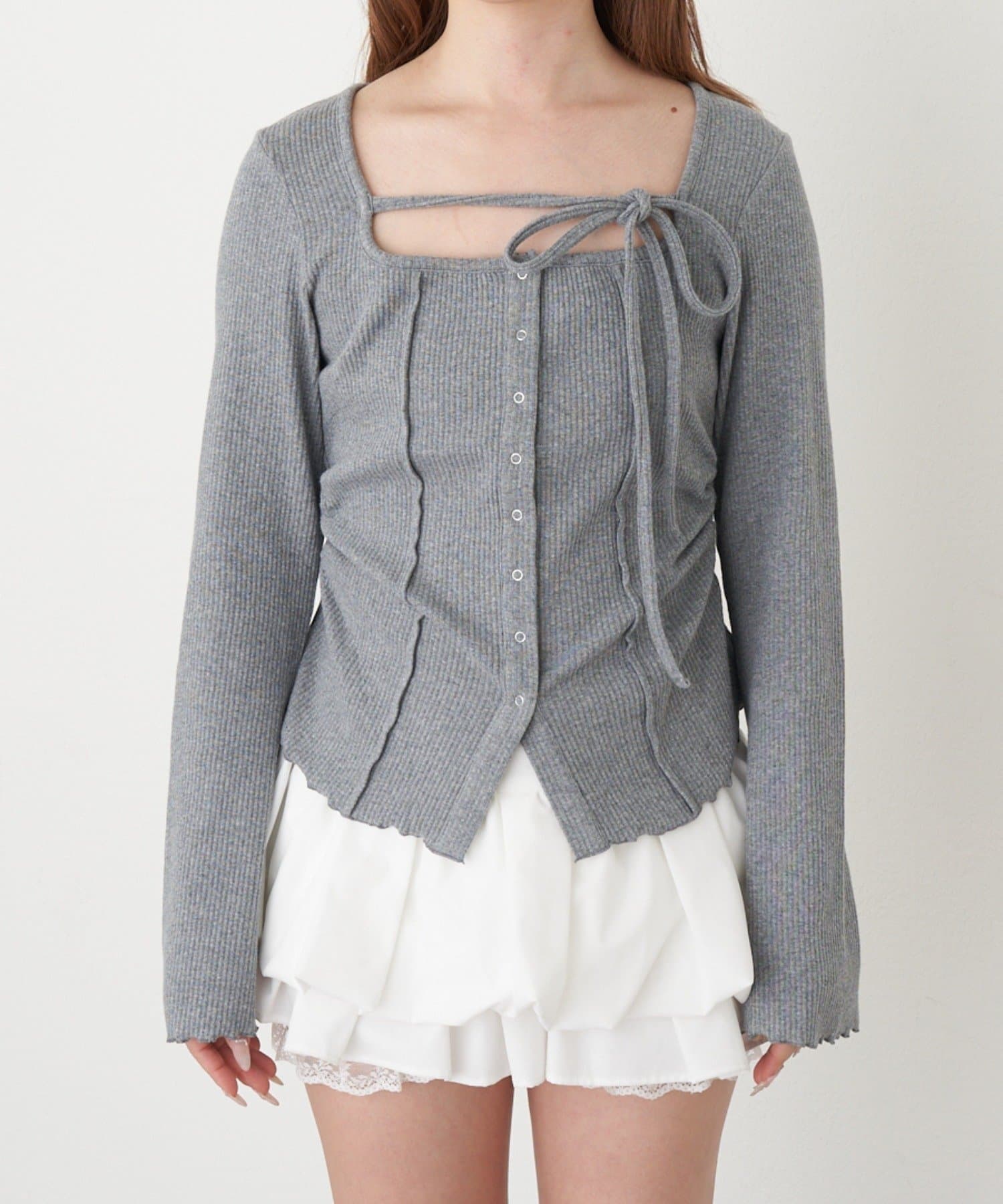 ・首元の紐がアレンジ可能なので、気分に合わせて着ていただけます。