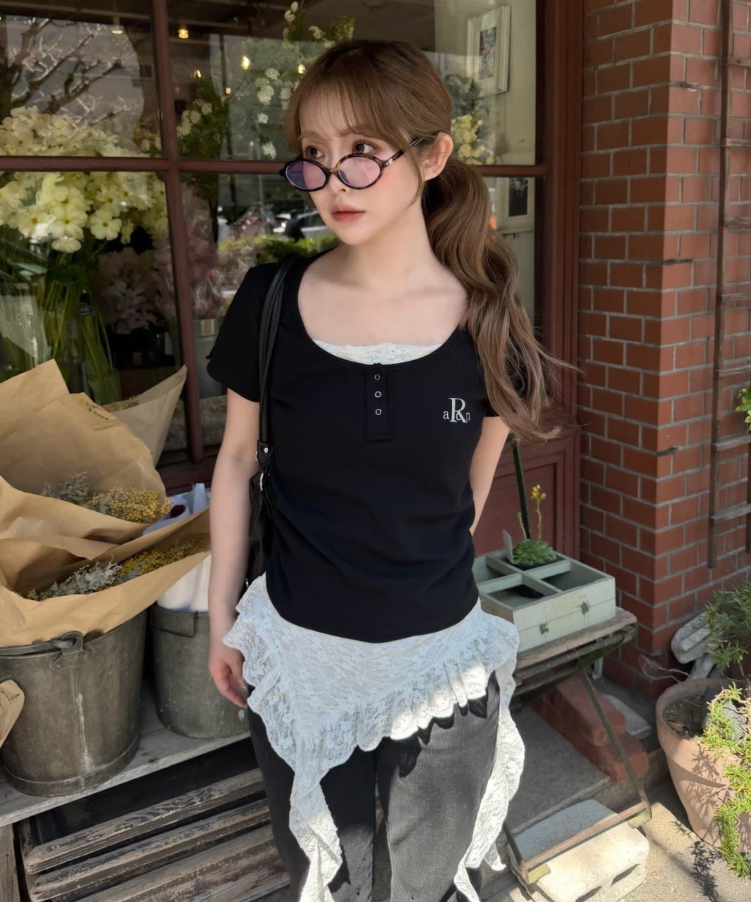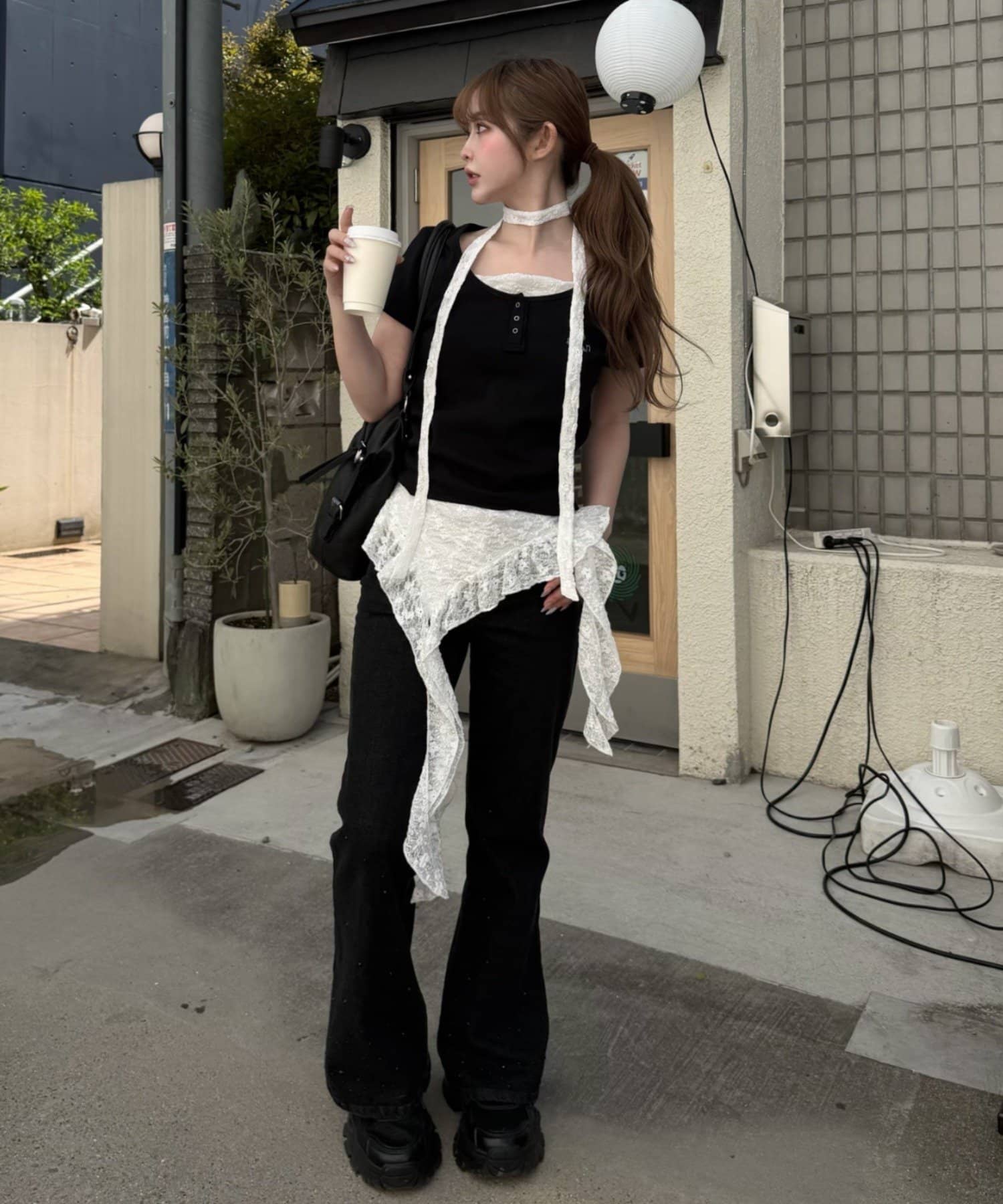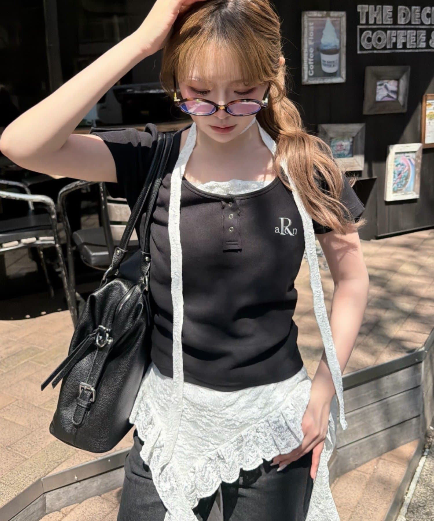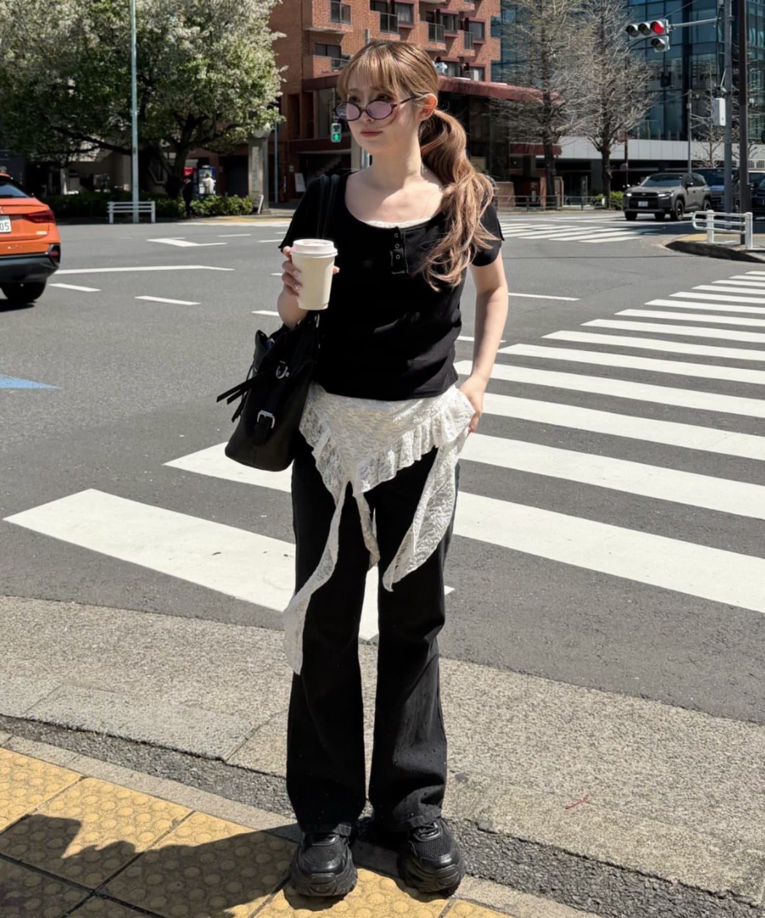 ・レースや花柄のキャミソールをレイヤードすることで、トレンド感のあるスタイリングが完成。