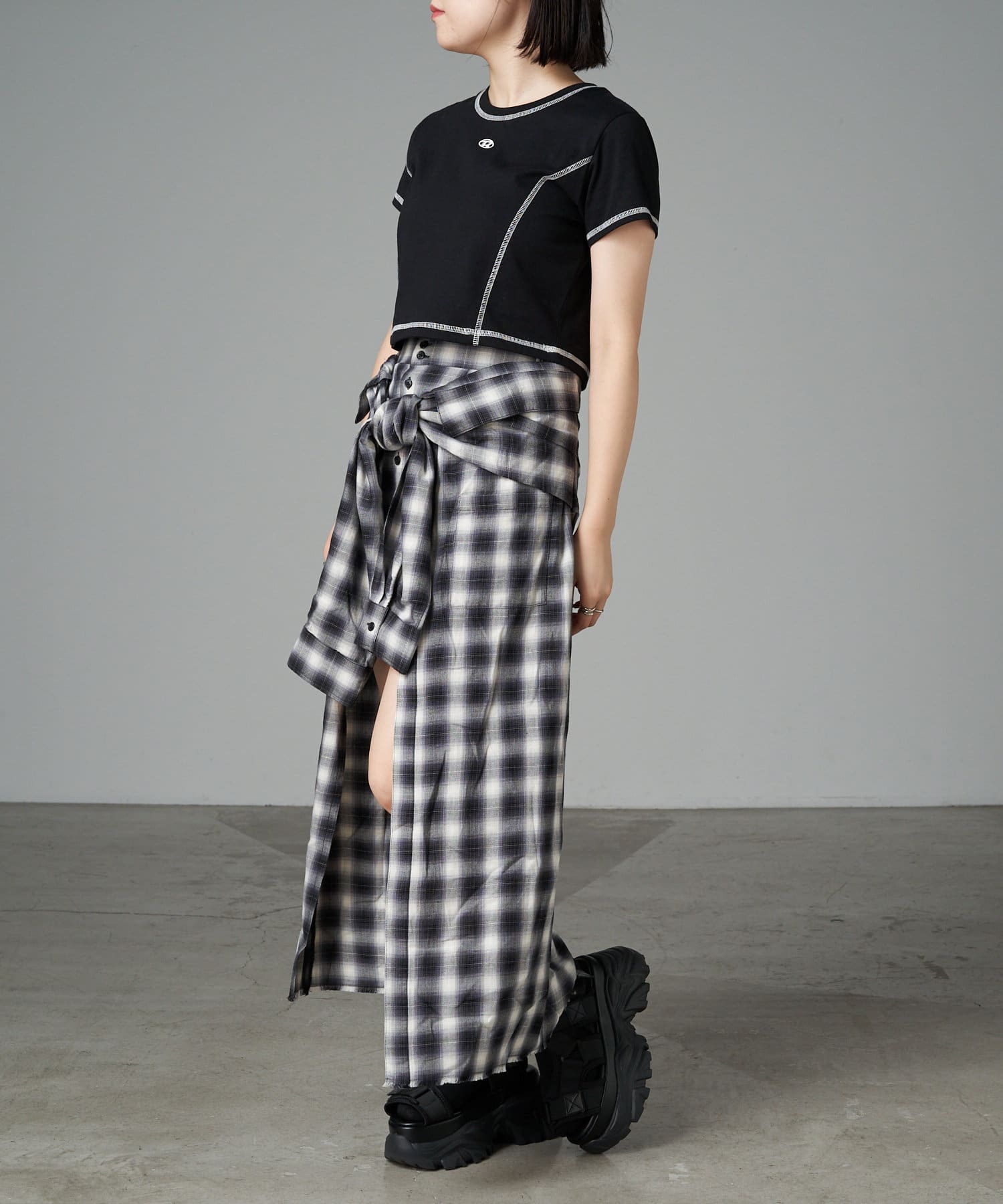タイトなシルエットのスカートのため、コンパクトTシャツからオーバーサイズの