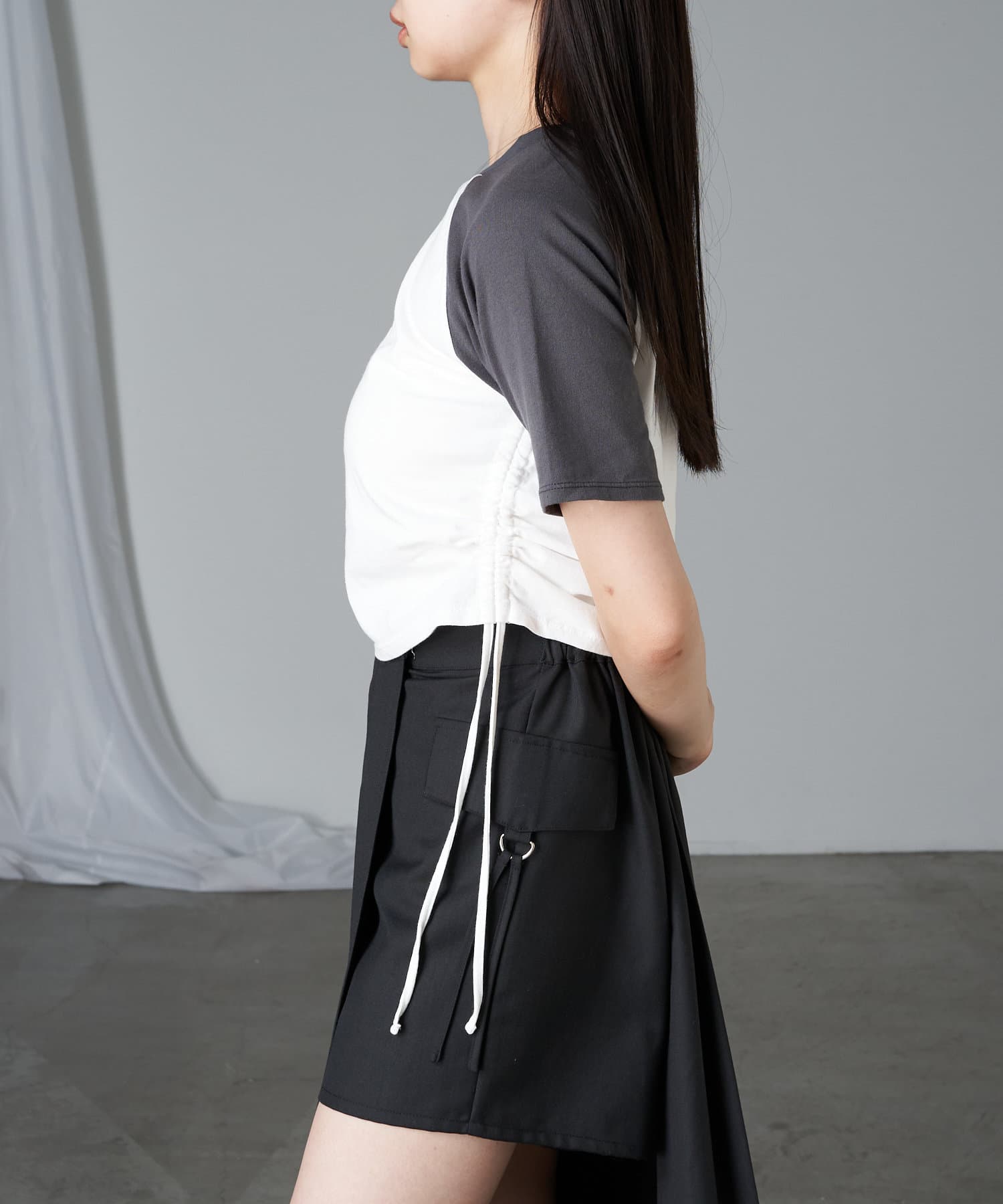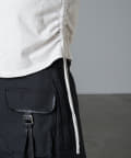 サイドのウエスト部分にギャザーがついているため、調節可能○