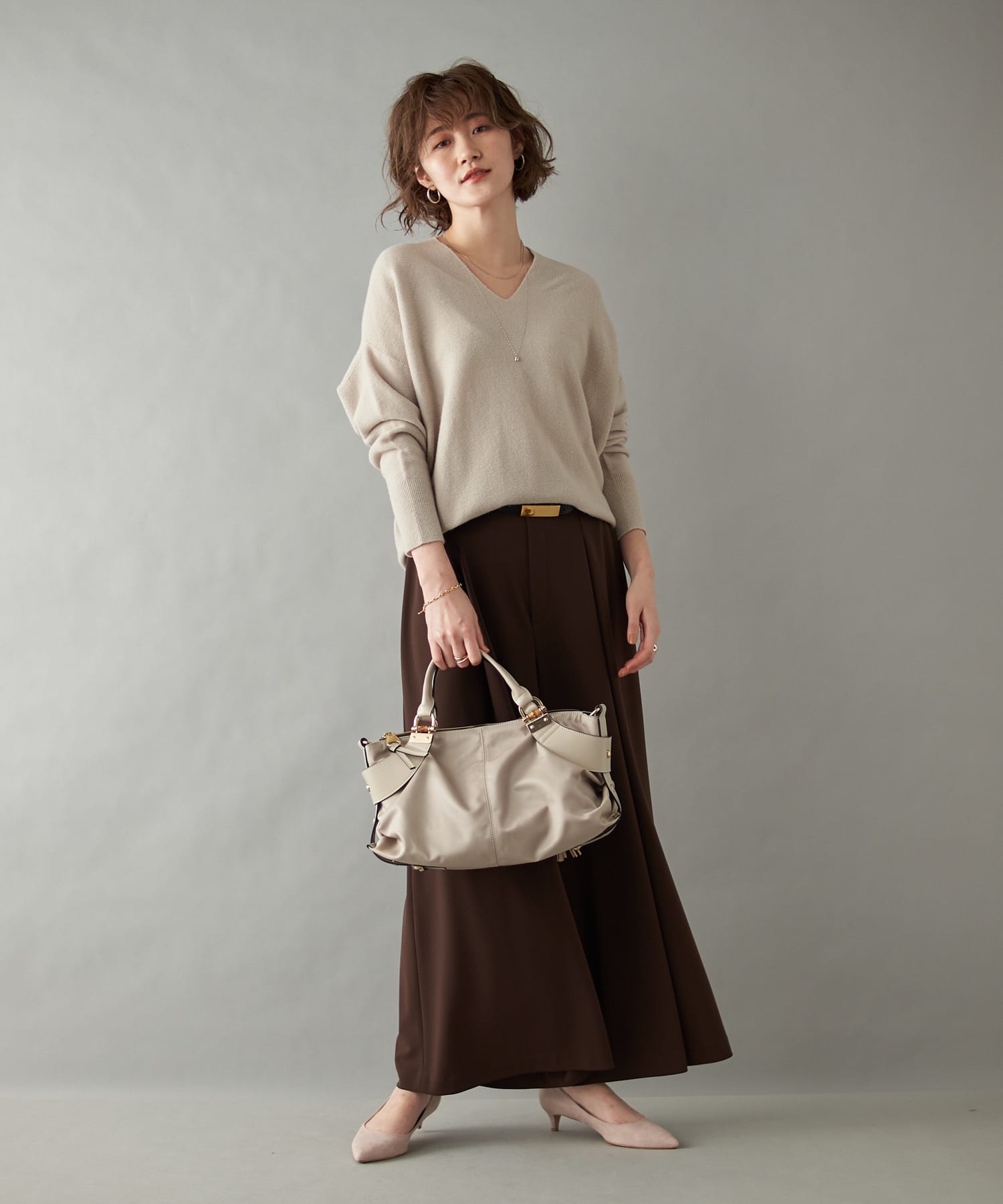 素材感:柔らかで優しい肌触りです。軽いですが、しっかりとした素材感でキレイめなコーディネートにも合わせられそうです。