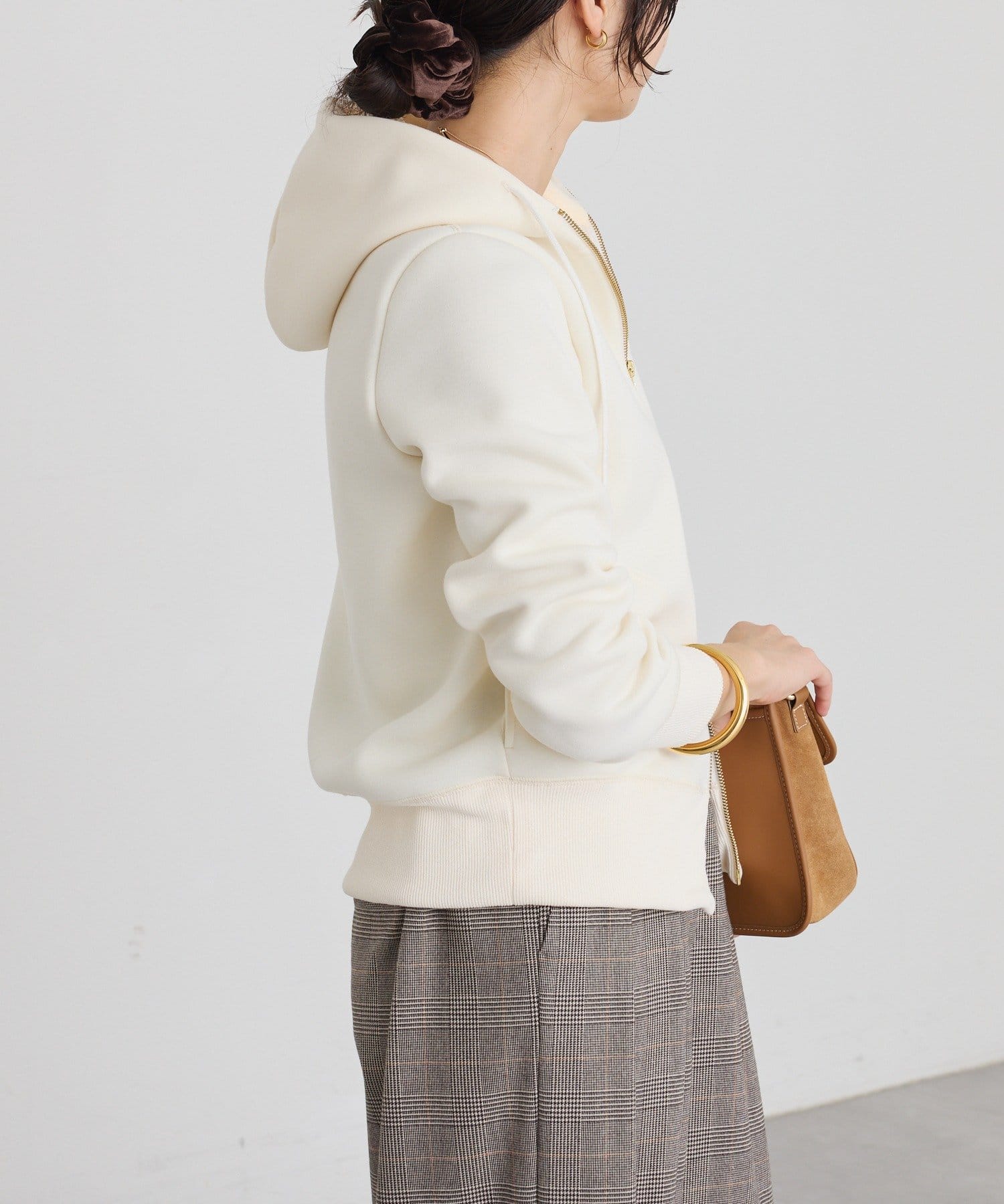 ⇒こちらのパーカーは大人が取り入れやすいデザインが魅力。ハリのある素材感とコンパクトなデザインで、カジュアルダウンしすぎることなく女性らしい雰囲気が残ります。立体感のあるフードで小顔効果も◎苦手な方にもトライしやすいアイテムとなっております。