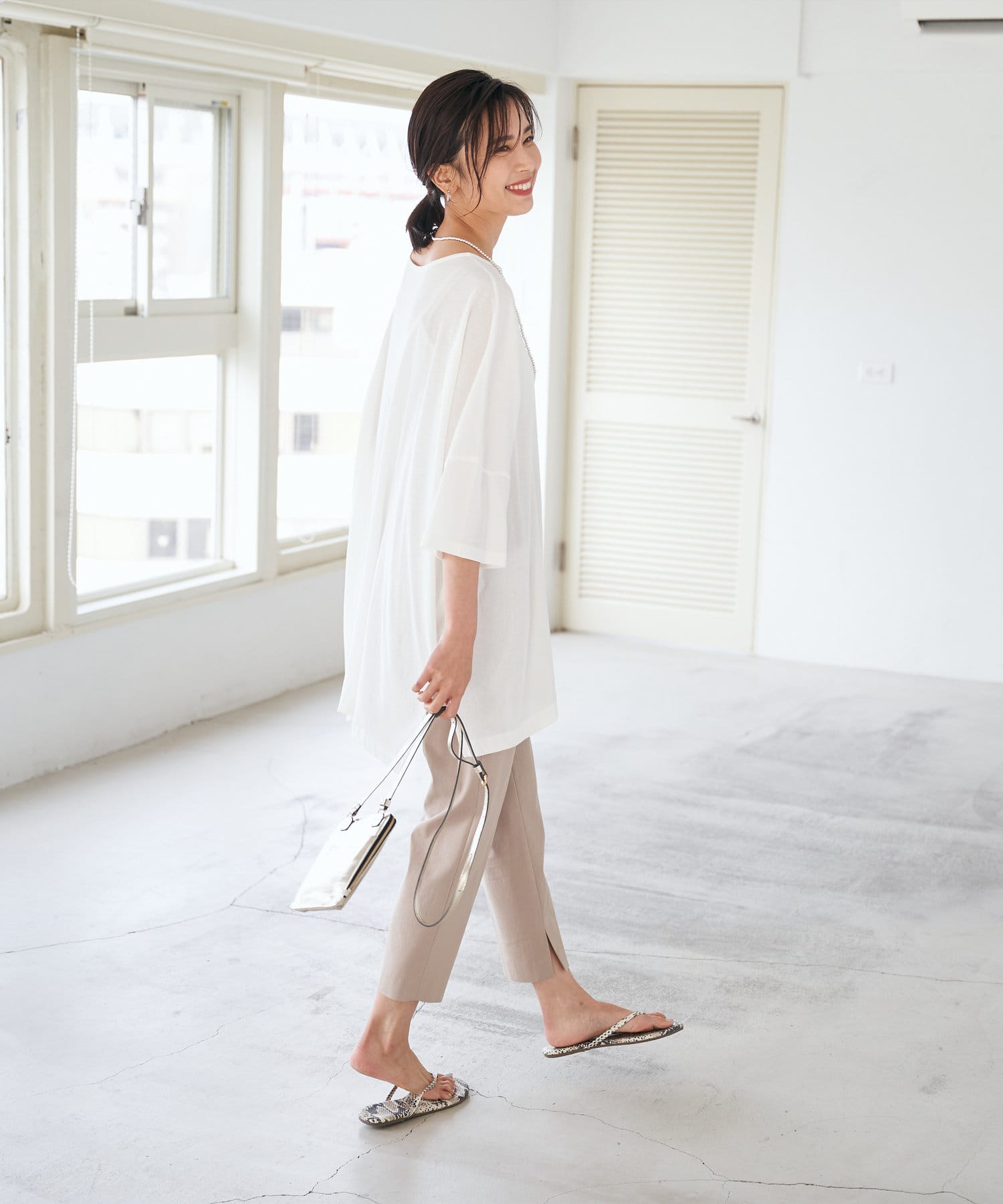 細めのトングが大人っぽく、上品な質感がビーチサンダルを都会的な印象にアップデート。フラットで抜け感のあるアイテムなので、大人のカジュアルスタイリングには欠かせないアイテムです。
