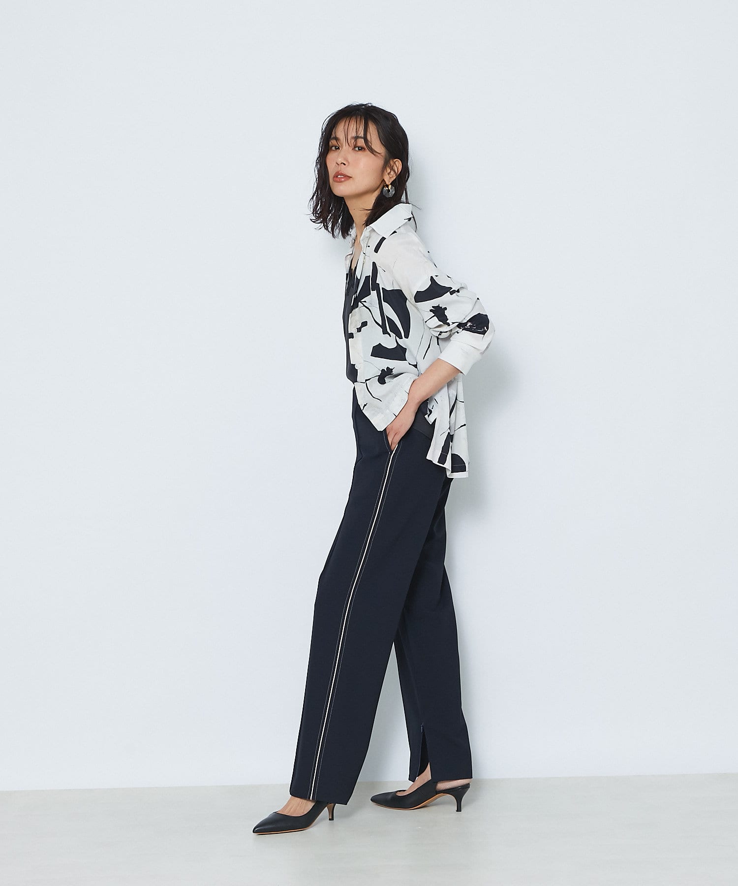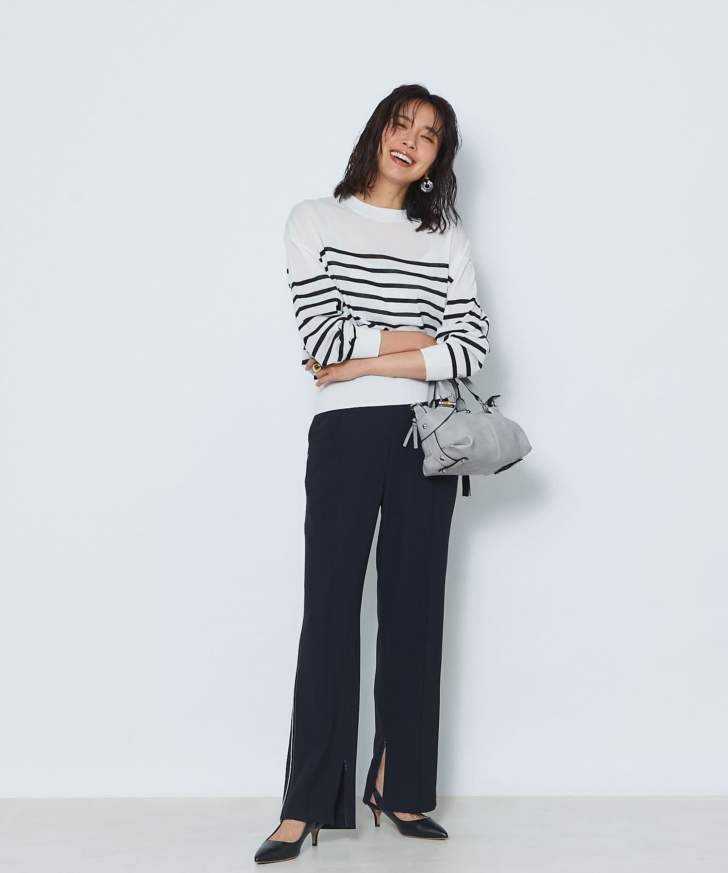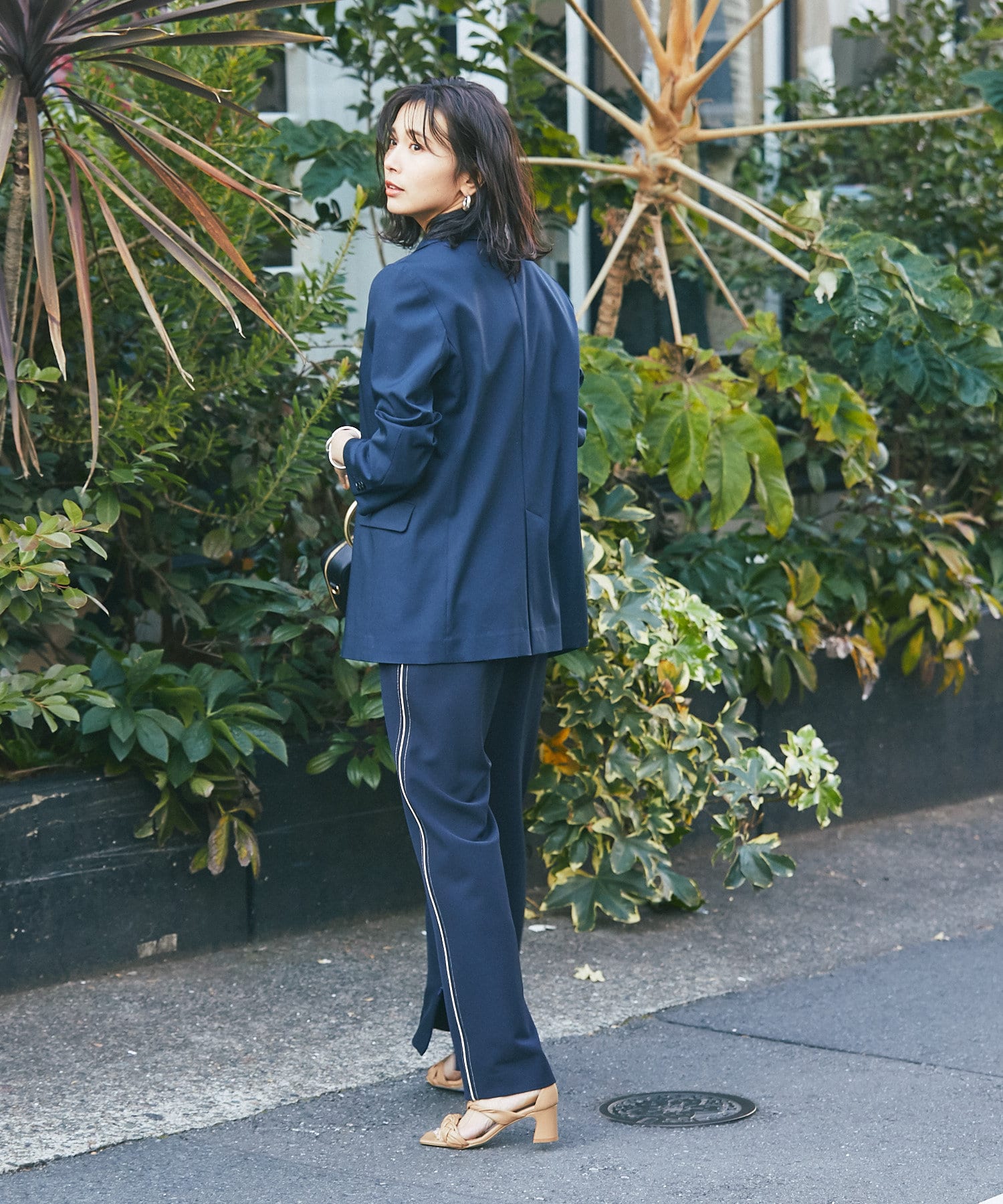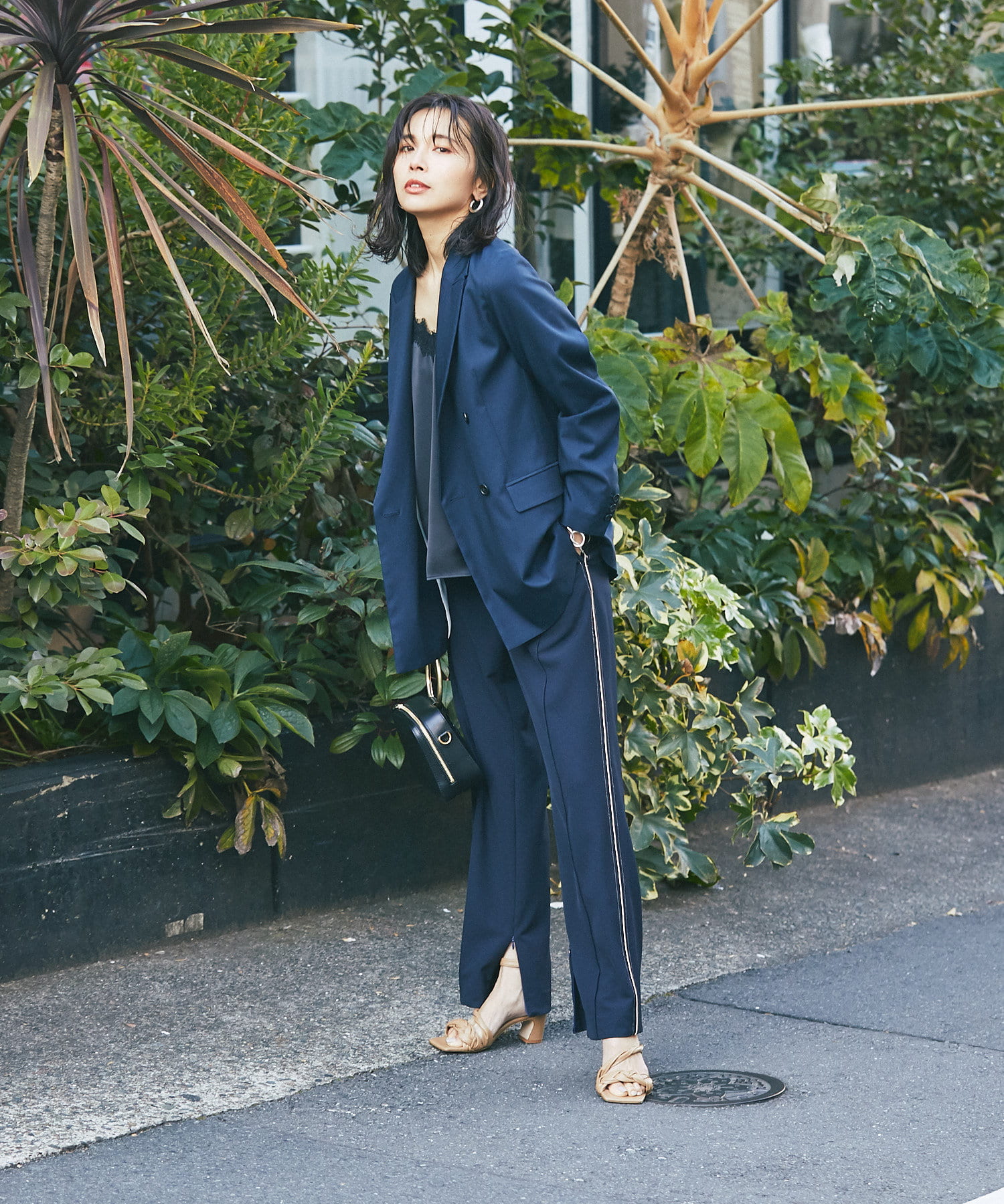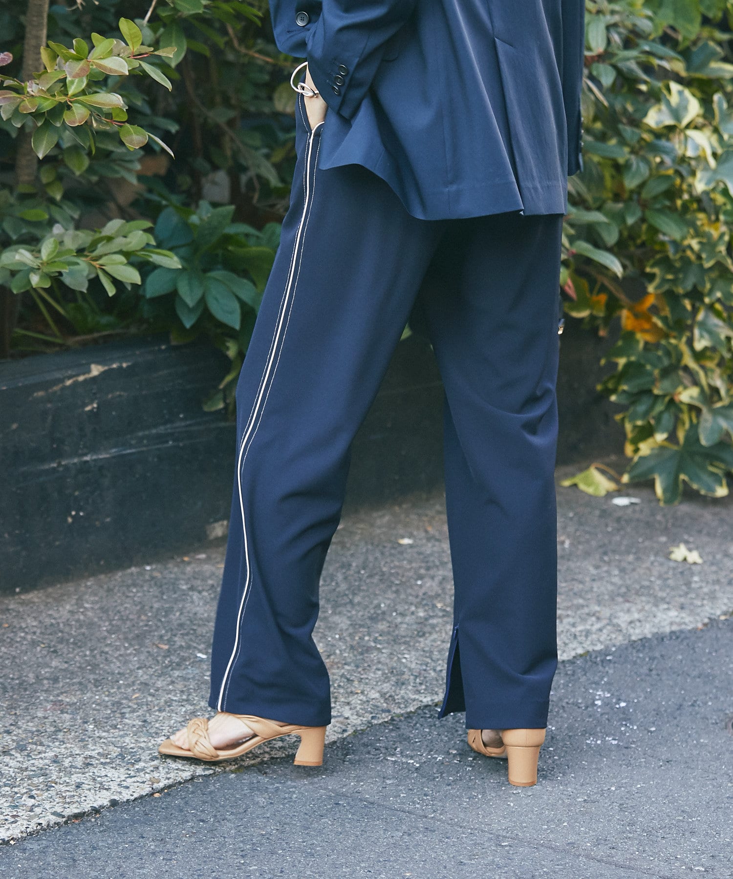 パンツは美脚見えが叶うリラックスパンツ。サイドラインがアクセントに。