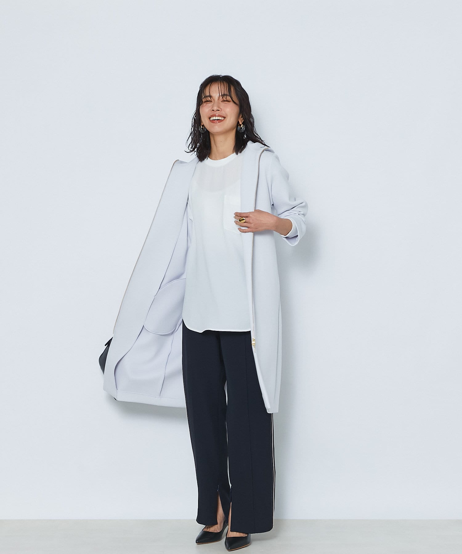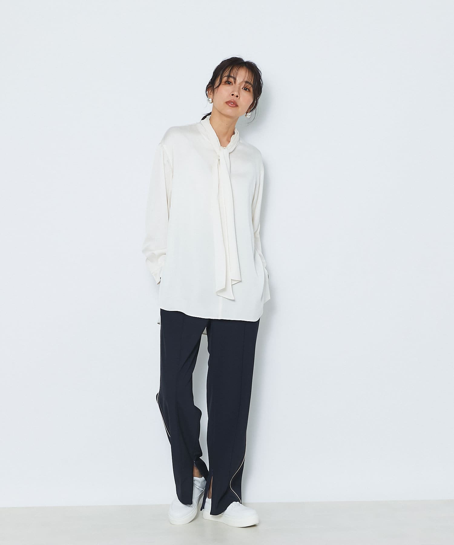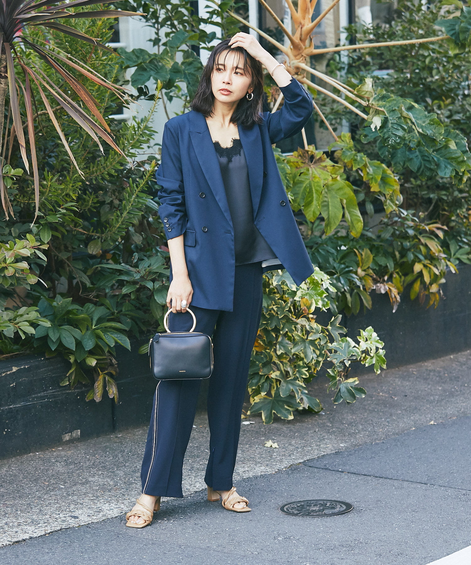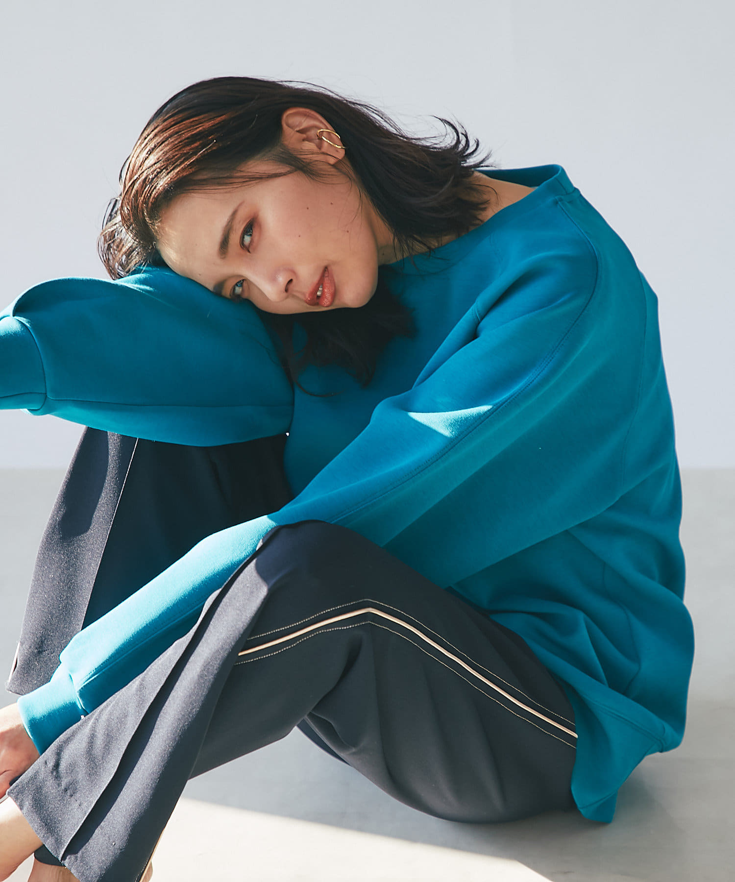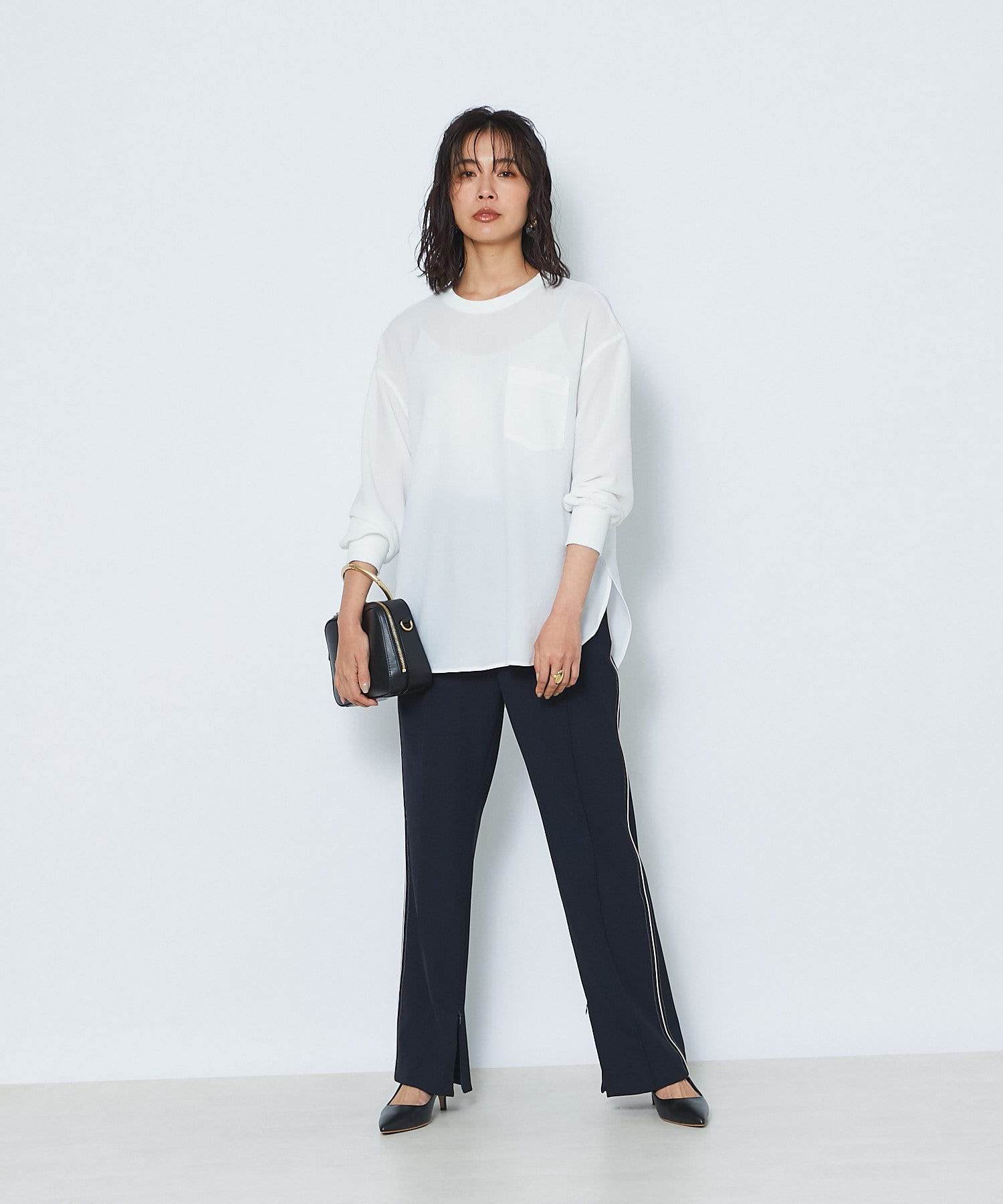 パンツは美脚見えが叶うリラックスパンツ。サイドラインがアクセントに。