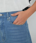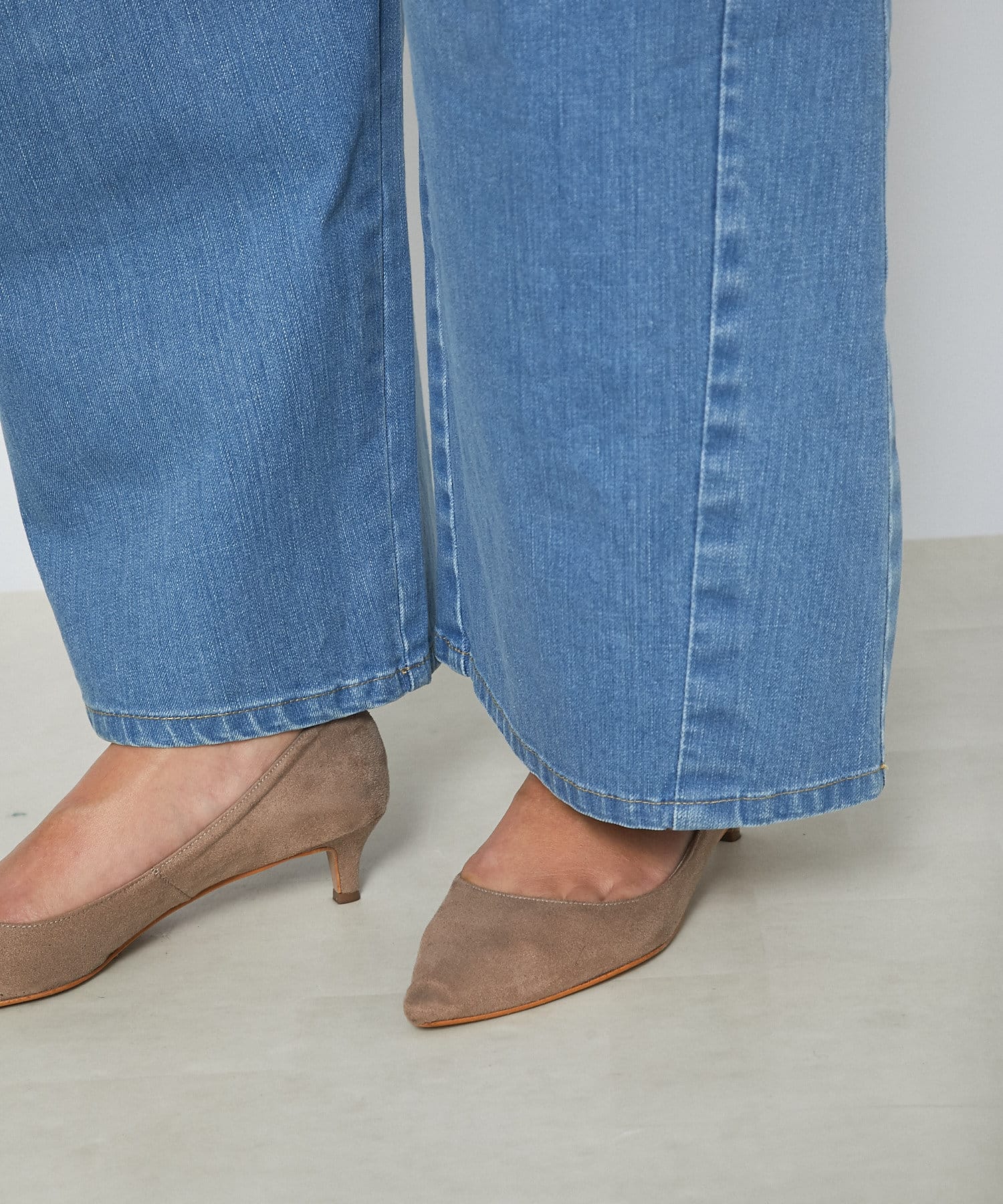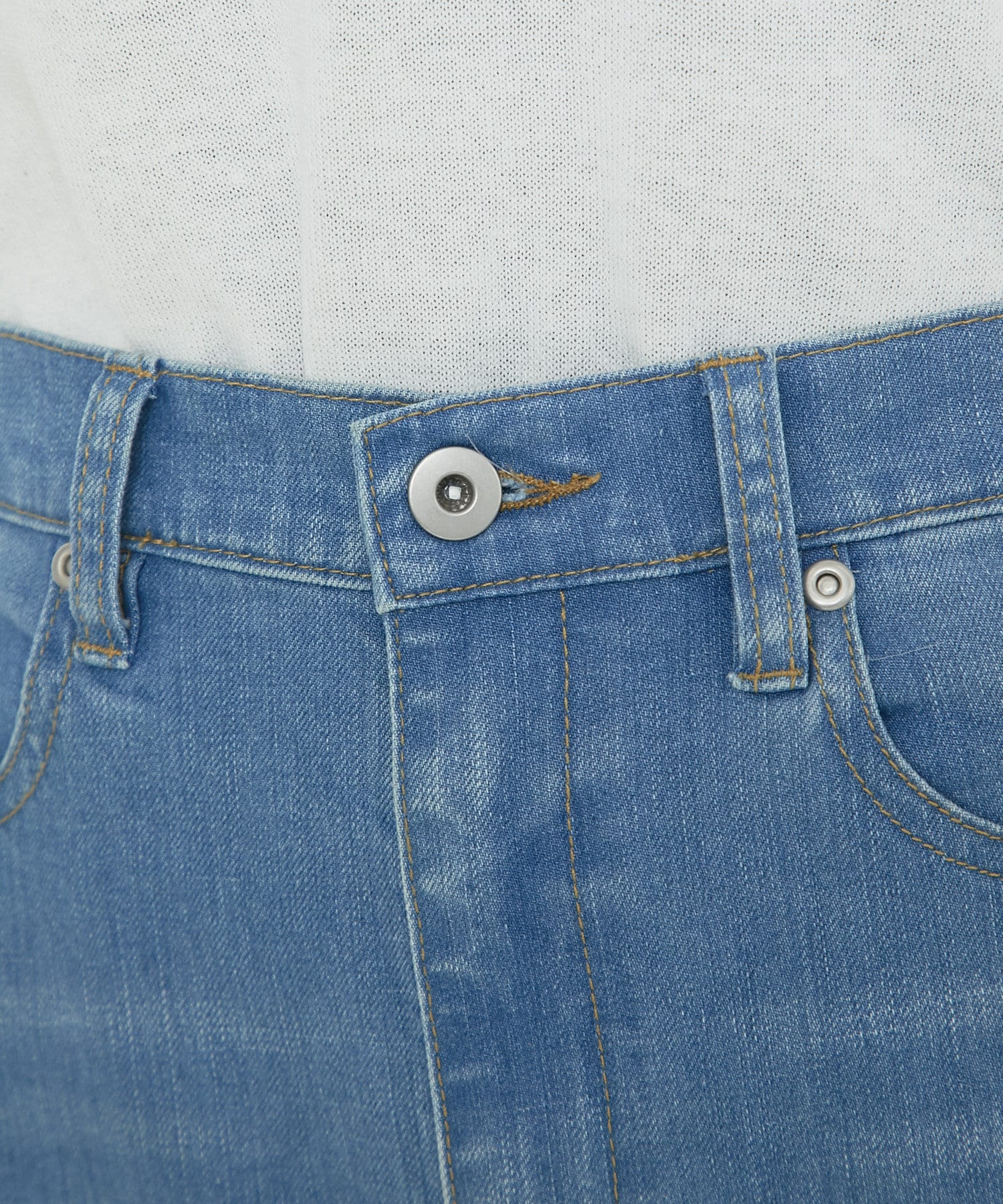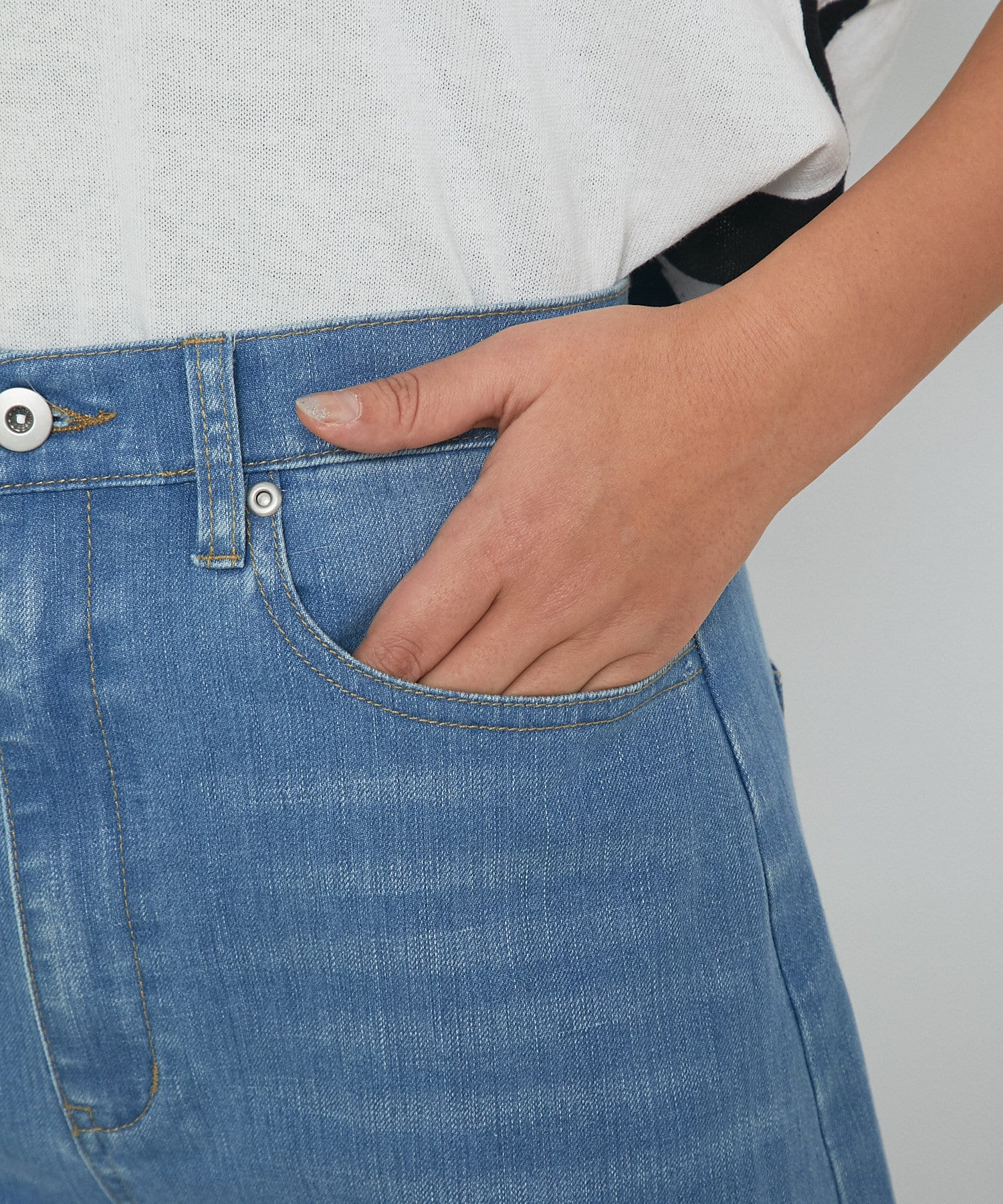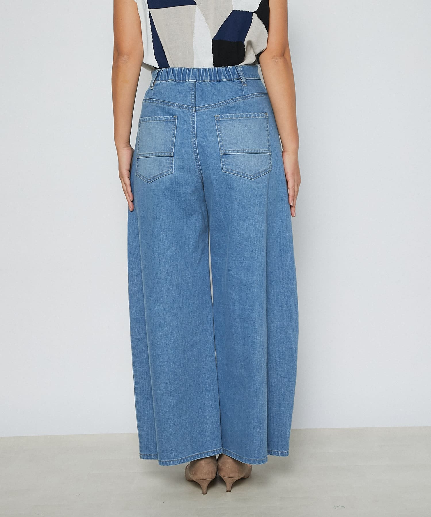 カーブデザインがトレンドライクな着回し抜群デニムです。ウエストゴム仕様なので窮屈感もなく着用いただける着心地良いデニムです。