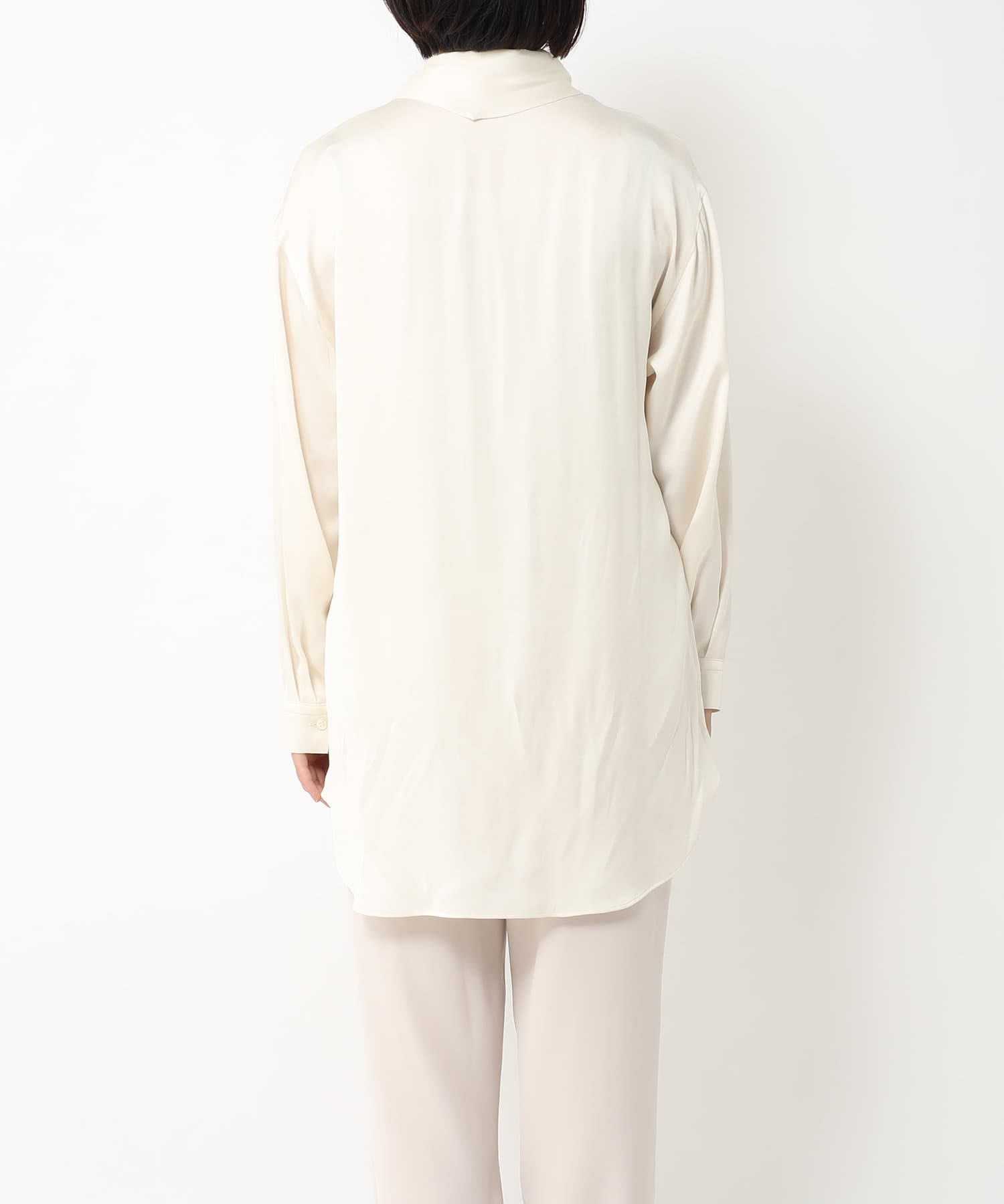 ボウタイ以外のディテールを抑えたミニマムなデザインに、サテンの艶とドレープ感で女性らしさをプラスした1着。