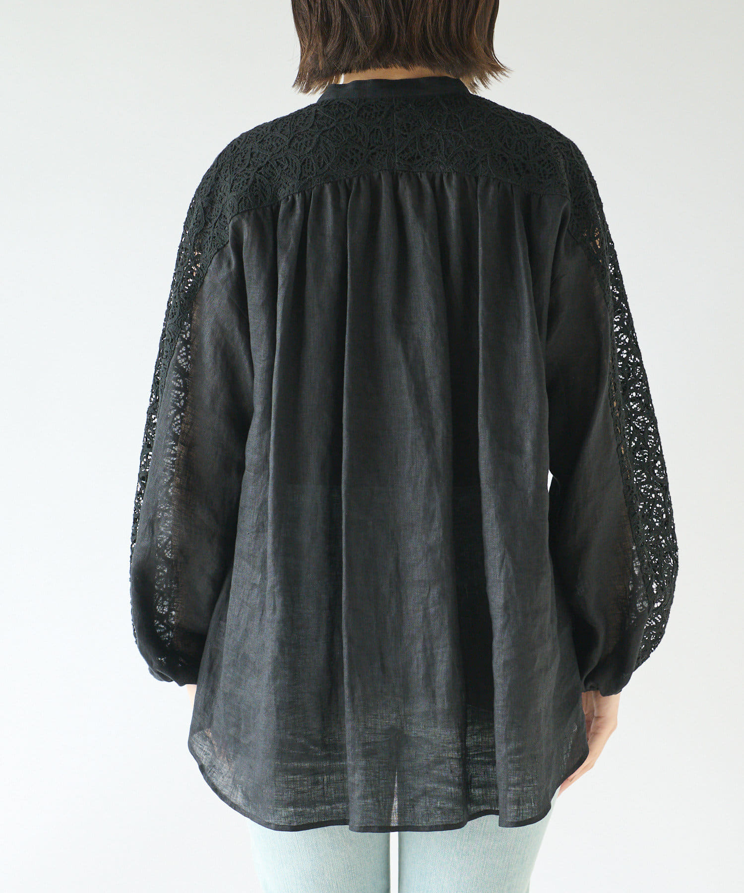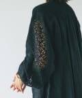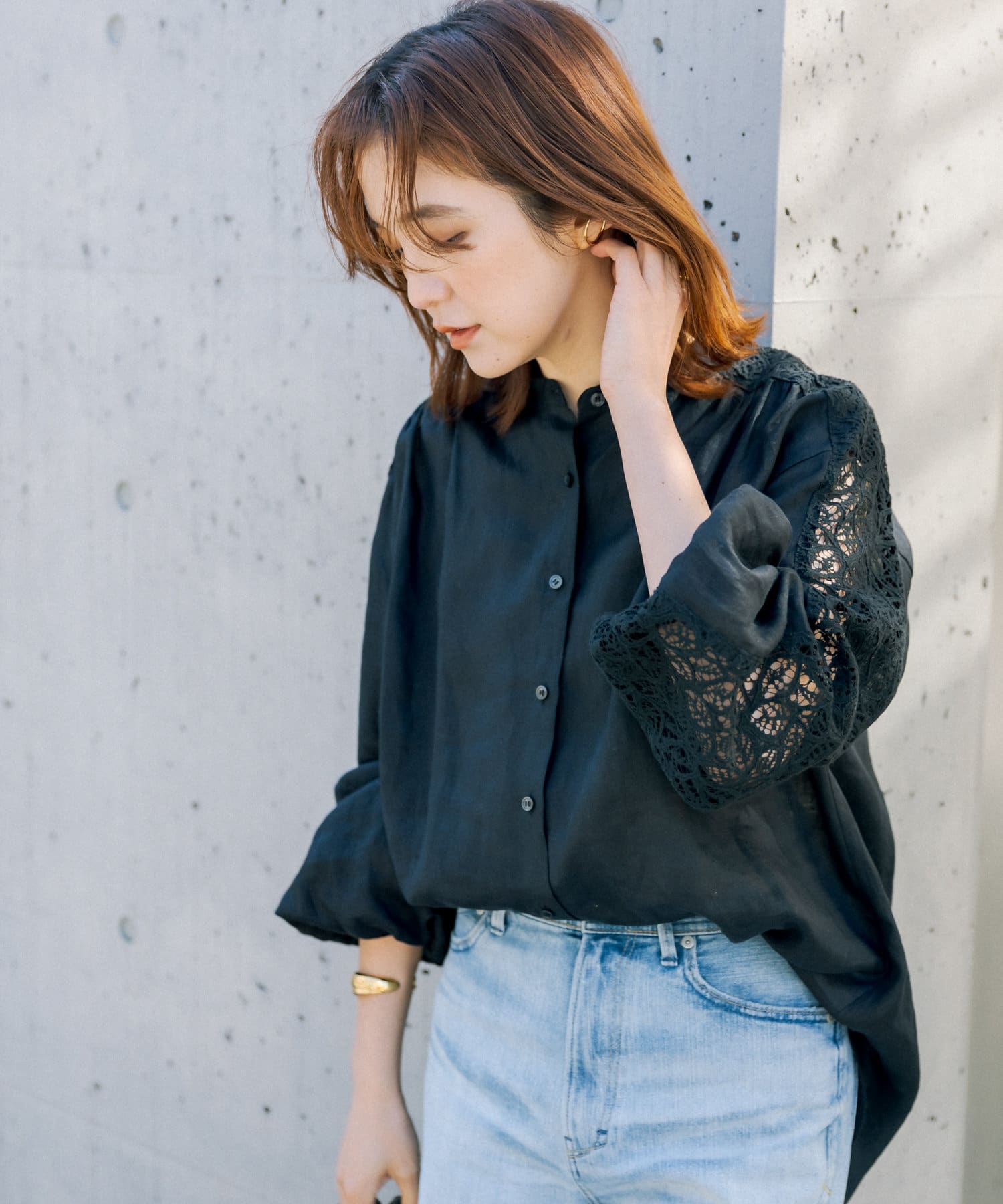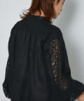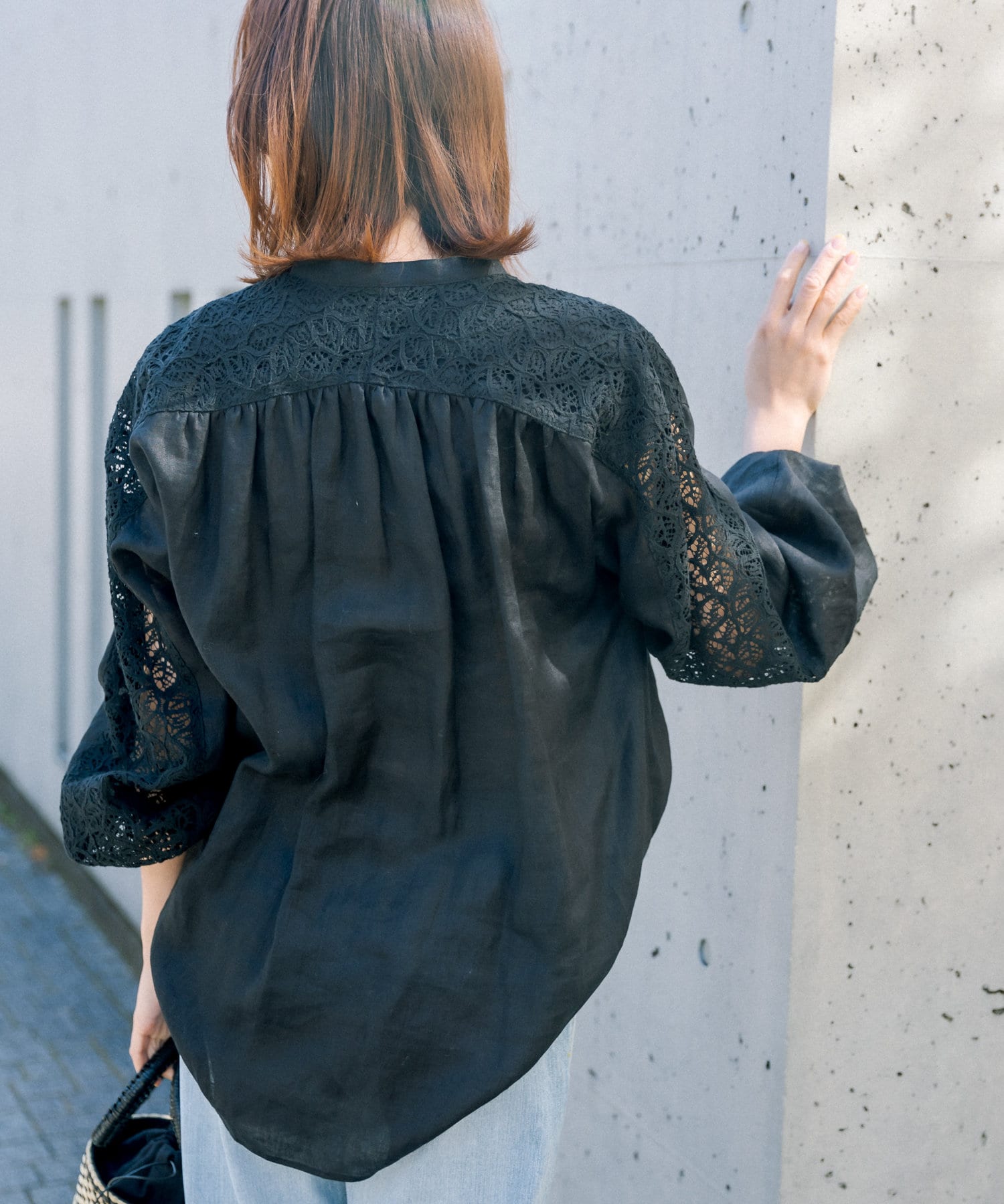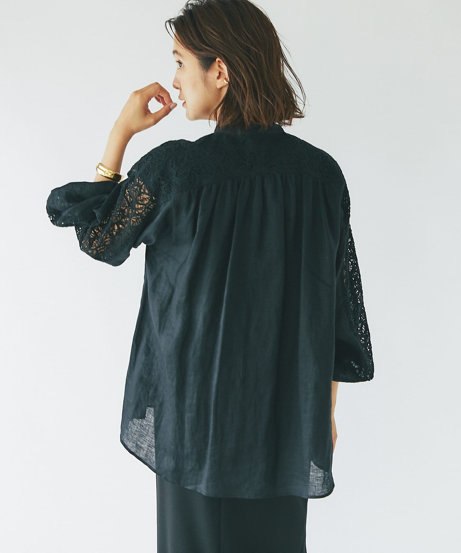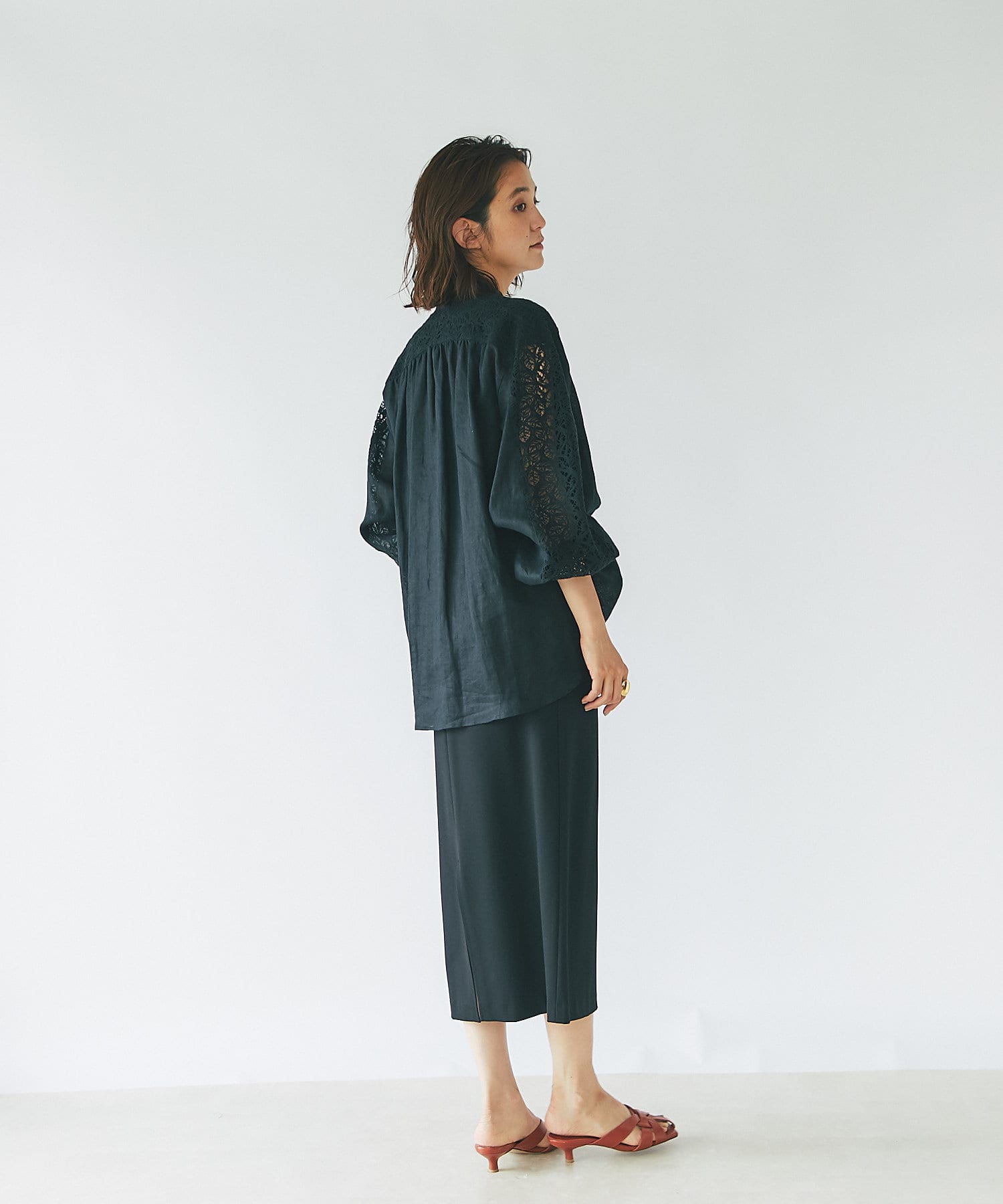肩から袖にレースを切り替えにしたギャザーブラウス。甘さを抑えた上品なリーフ柄のレースとリネンのコンビネーションが春らしい1着。肩のレース部分はリネンの裏打ちを施してあり、インナーを気にせず着用いただけるのがポイント。前あきデザインで着こなしのアレンジもしやすい一枚。