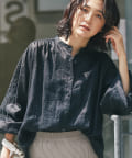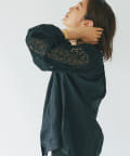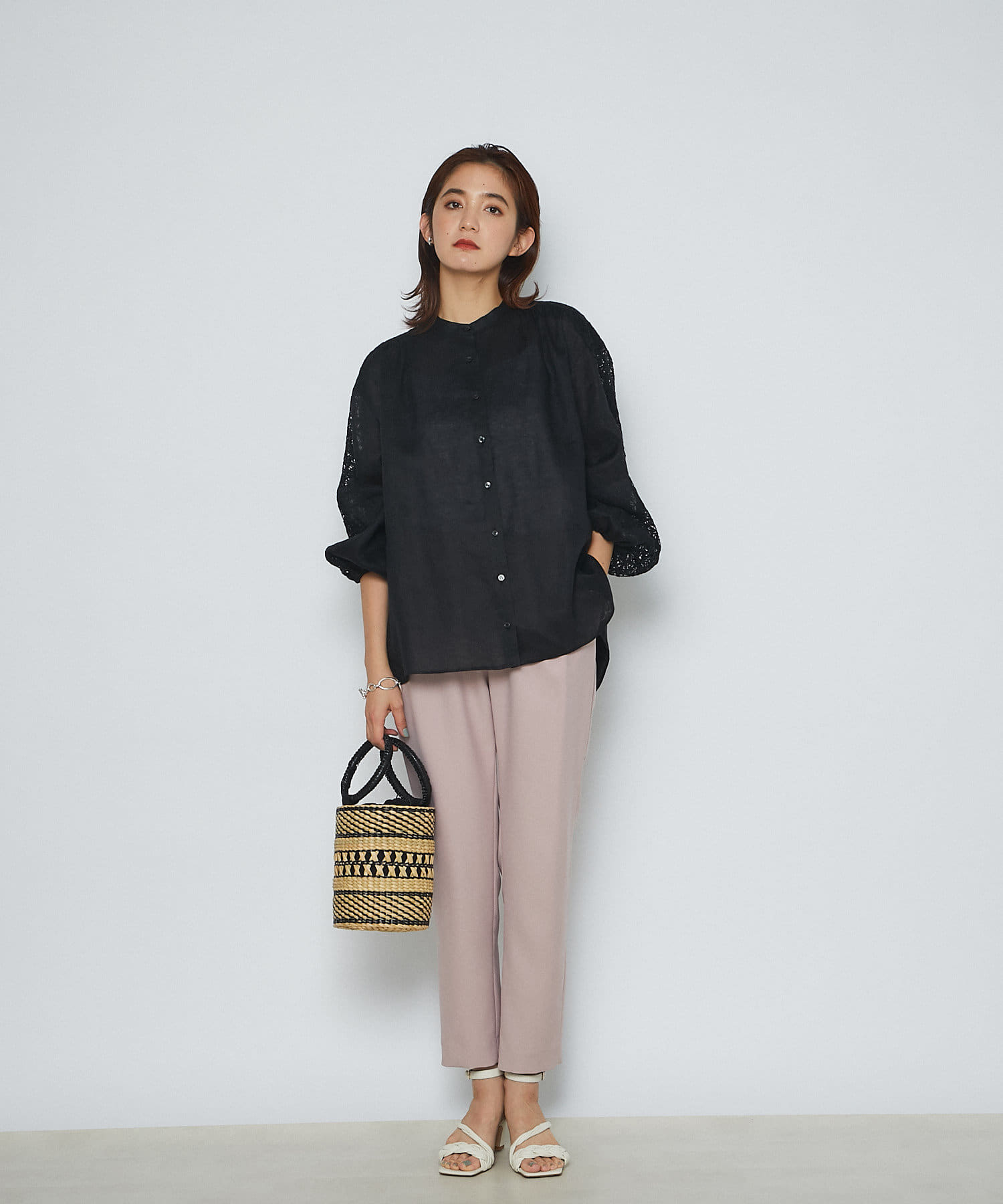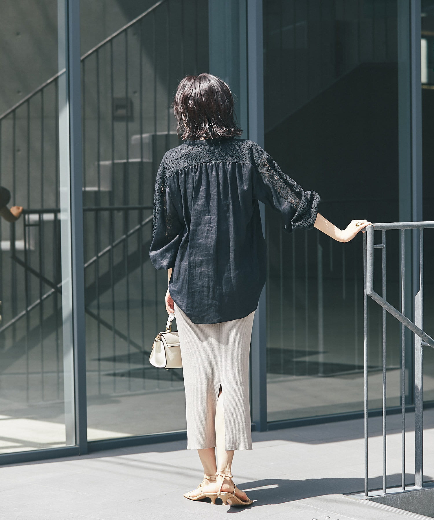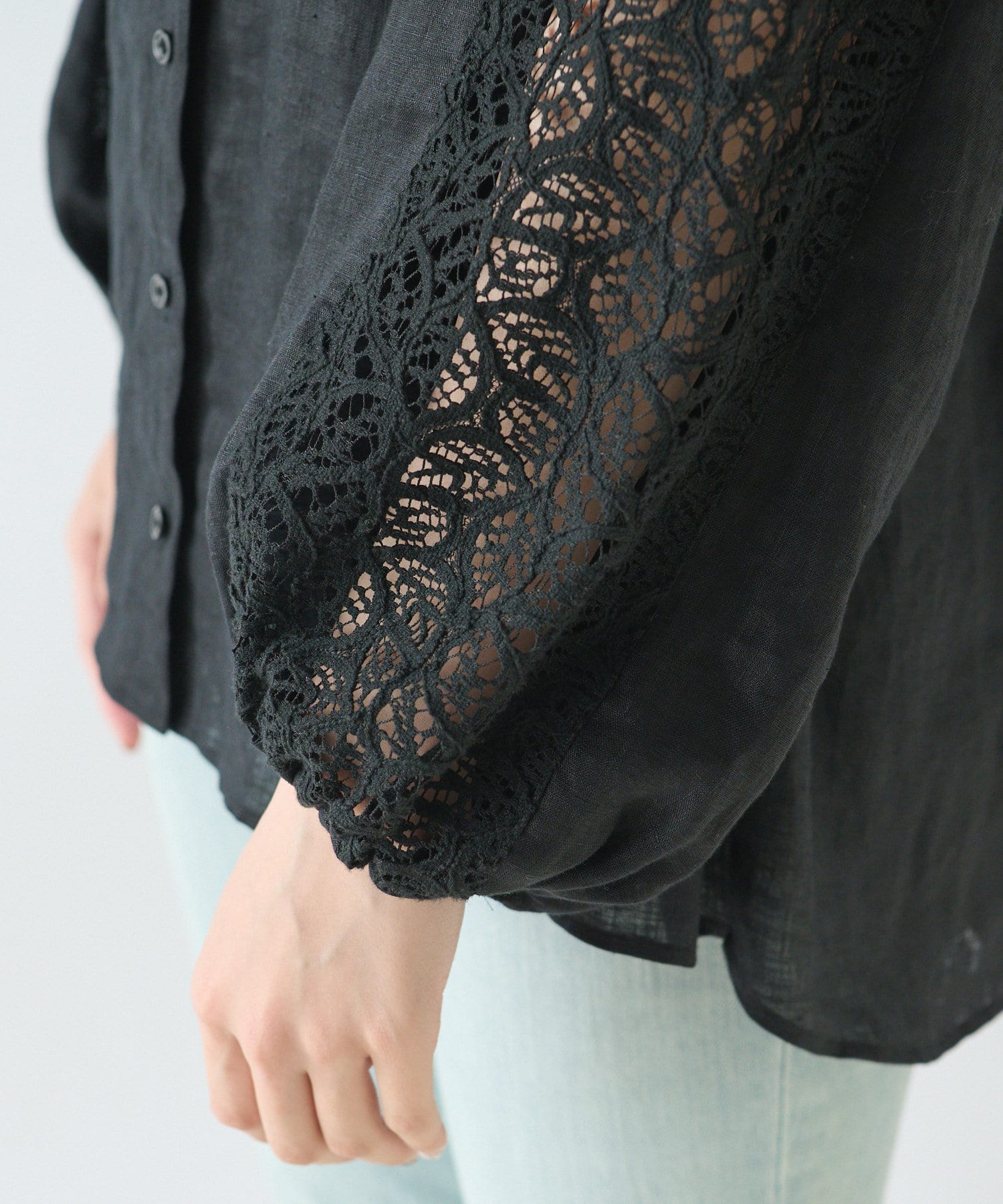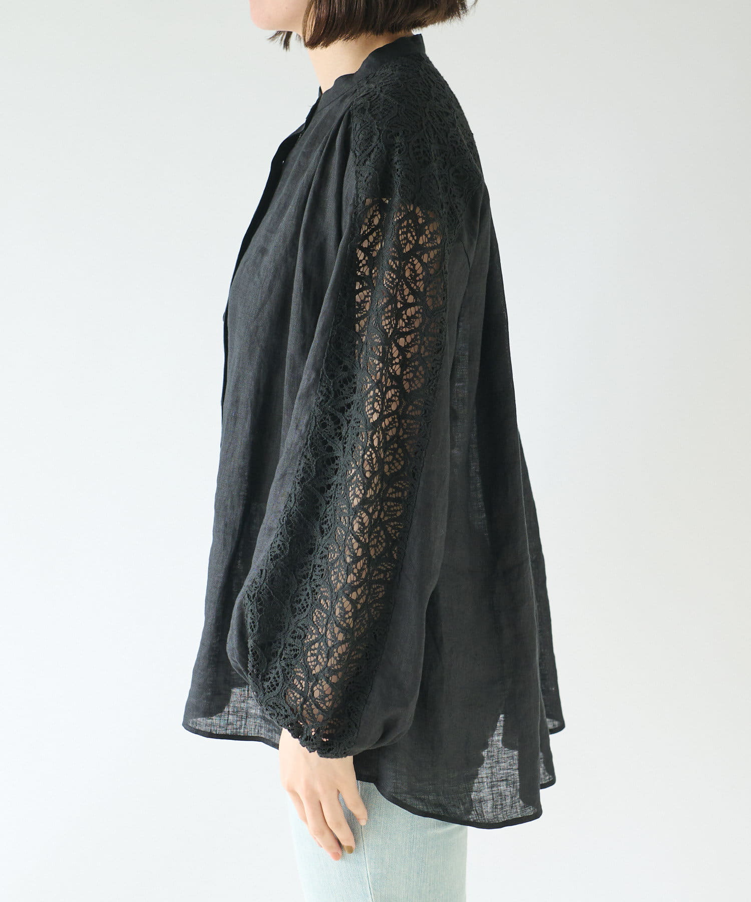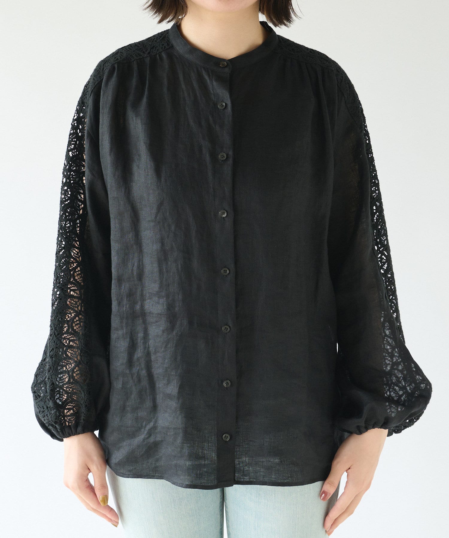 肩から袖にレースを切り替えにしたギャザーブラウス。甘さを抑えた上品なリーフ柄のレースとリネンのコンビネーションが春らしい1着。肩のレース部分はリネンの裏打ちを施してあり、インナーを気にせず着用いただけるのがポイント。前あきデザインで着こなしのアレンジもしやすい一枚。