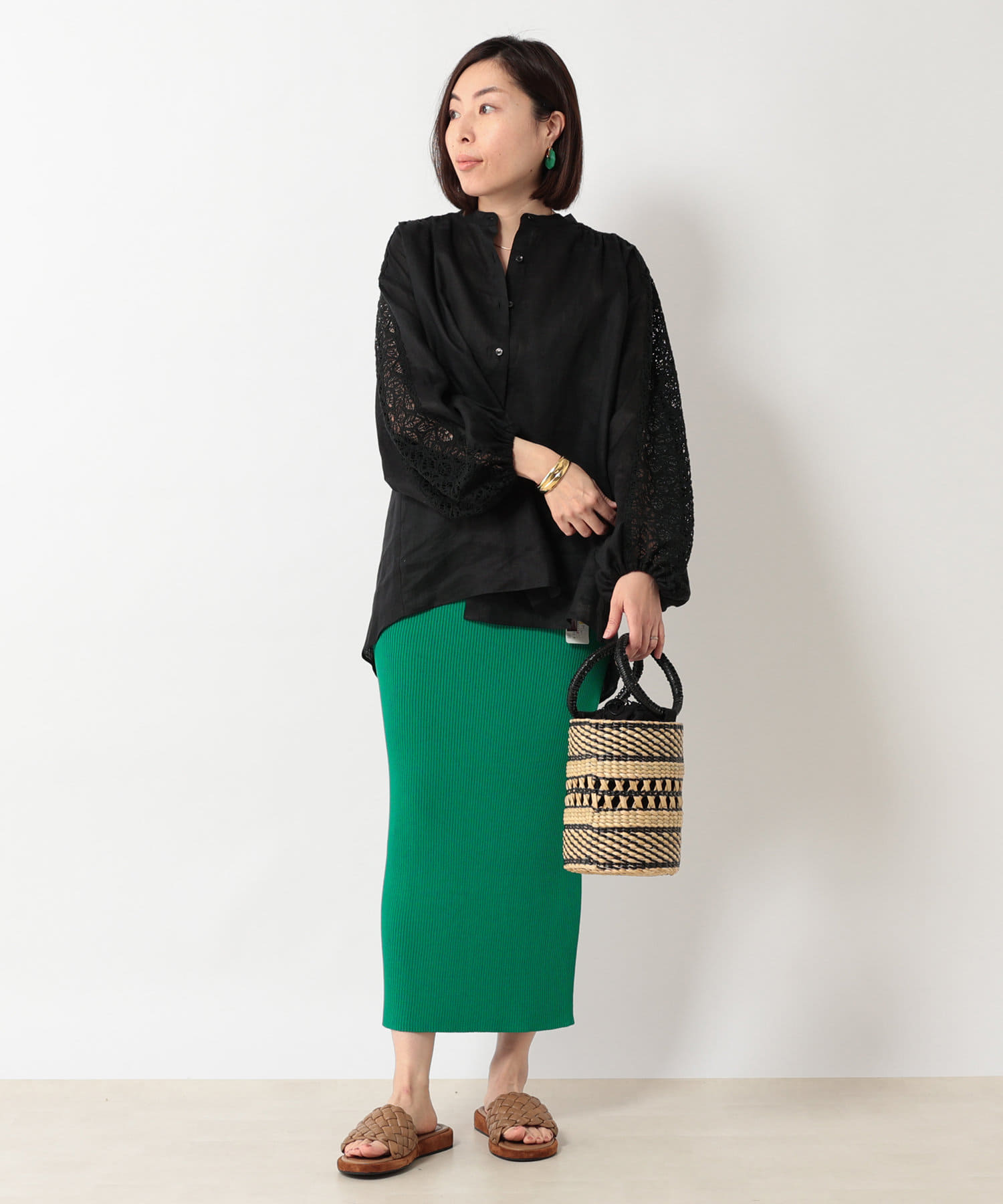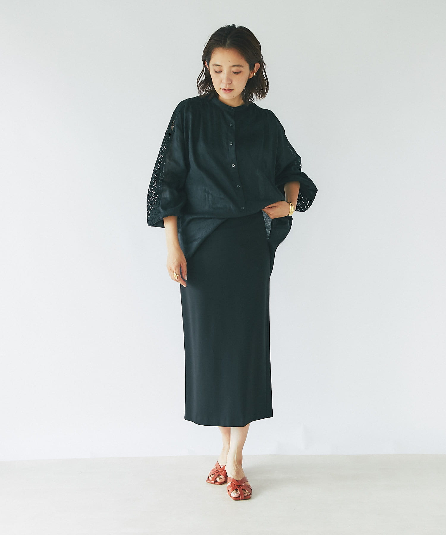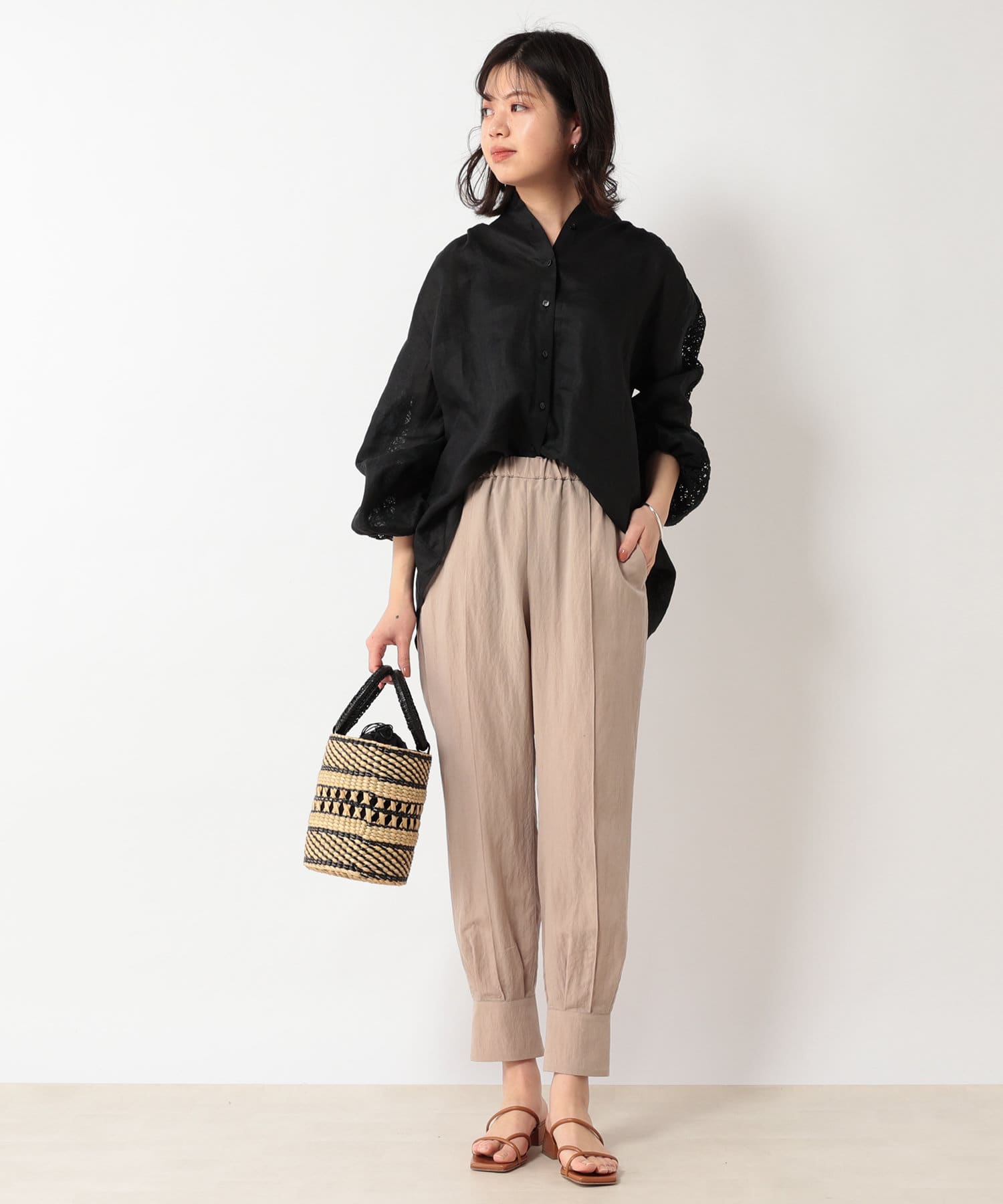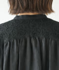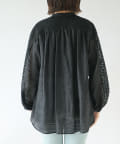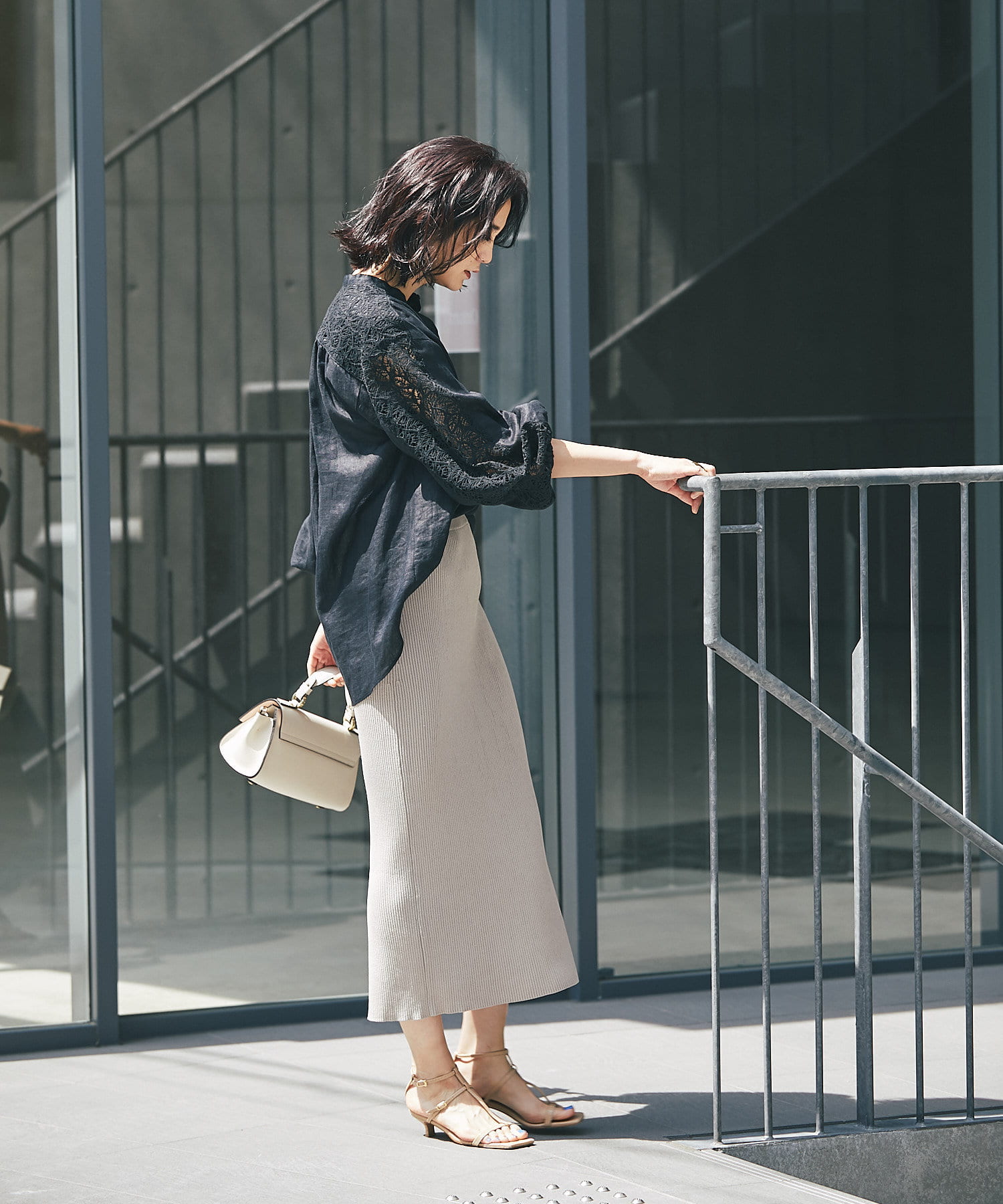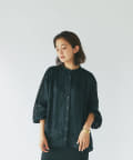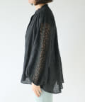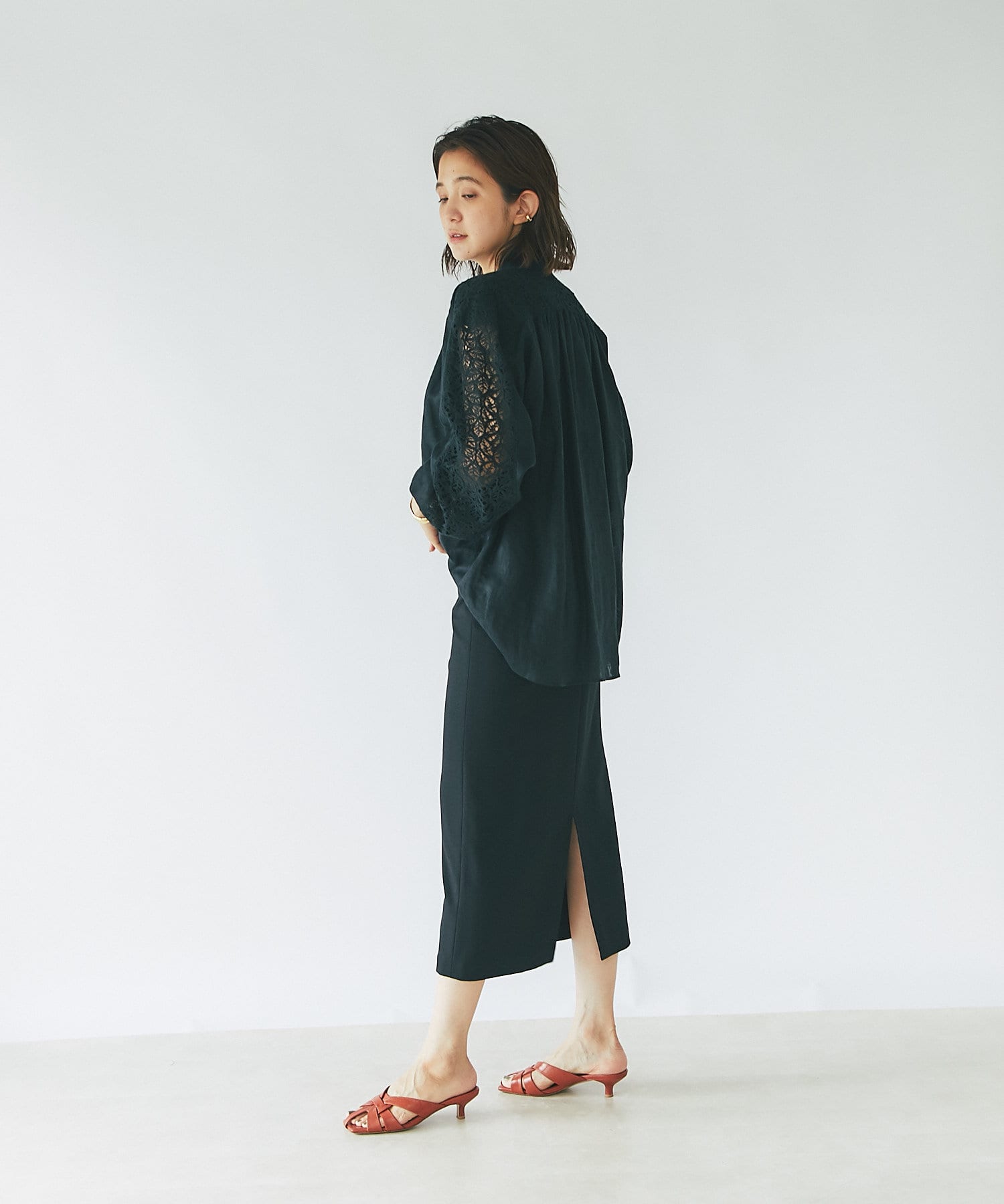 肩から袖にレースを切り替えにしたギャザーブラウス。甘さを抑えた上品なリーフ柄のレースとリネンのコンビネーションが春らしい1着。肩のレース部分はリネンの裏打ちを施してあり、インナーを気にせず着用いただけるのがポイント。前あきデザインで着こなしのアレンジもしやすい一枚。