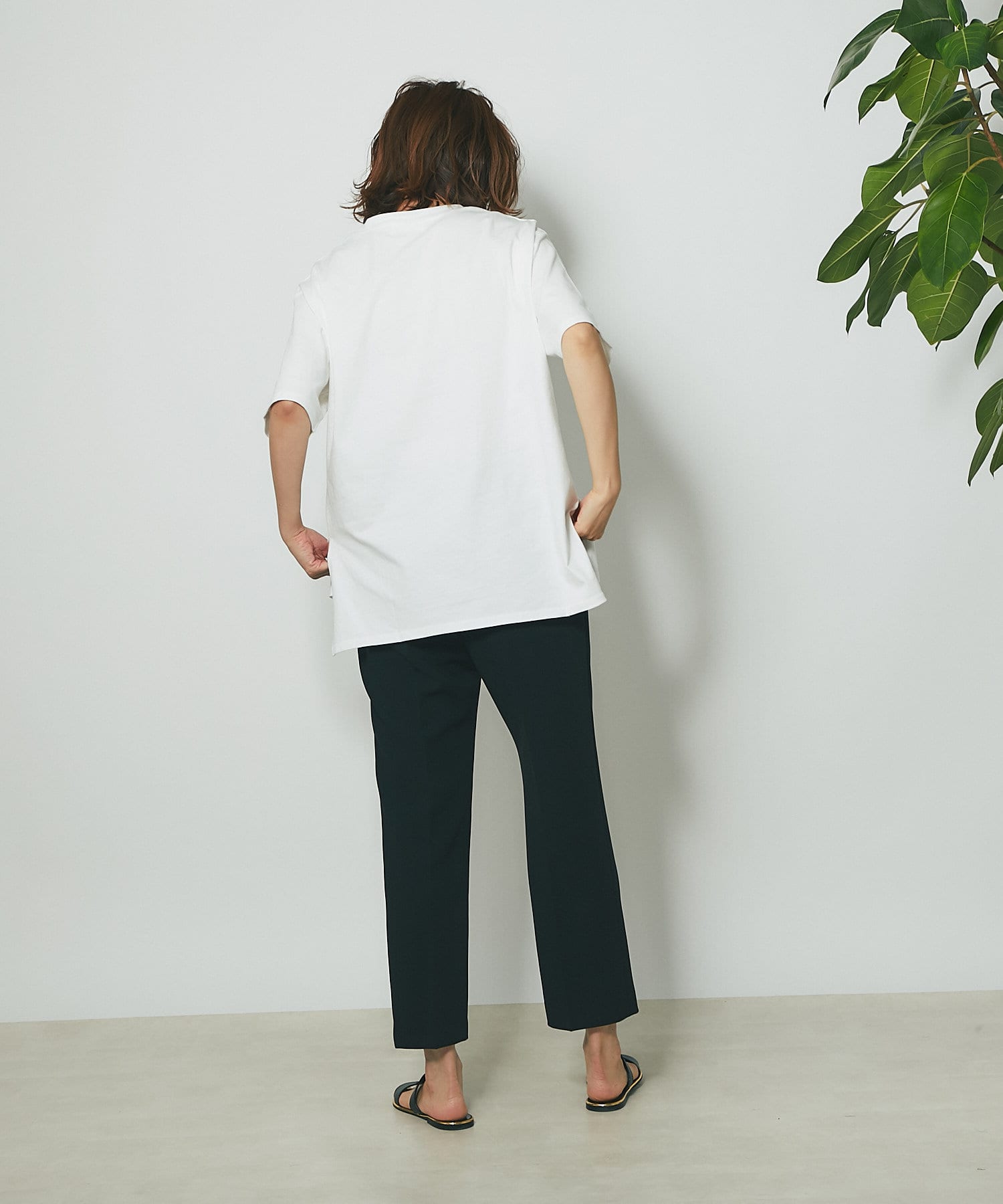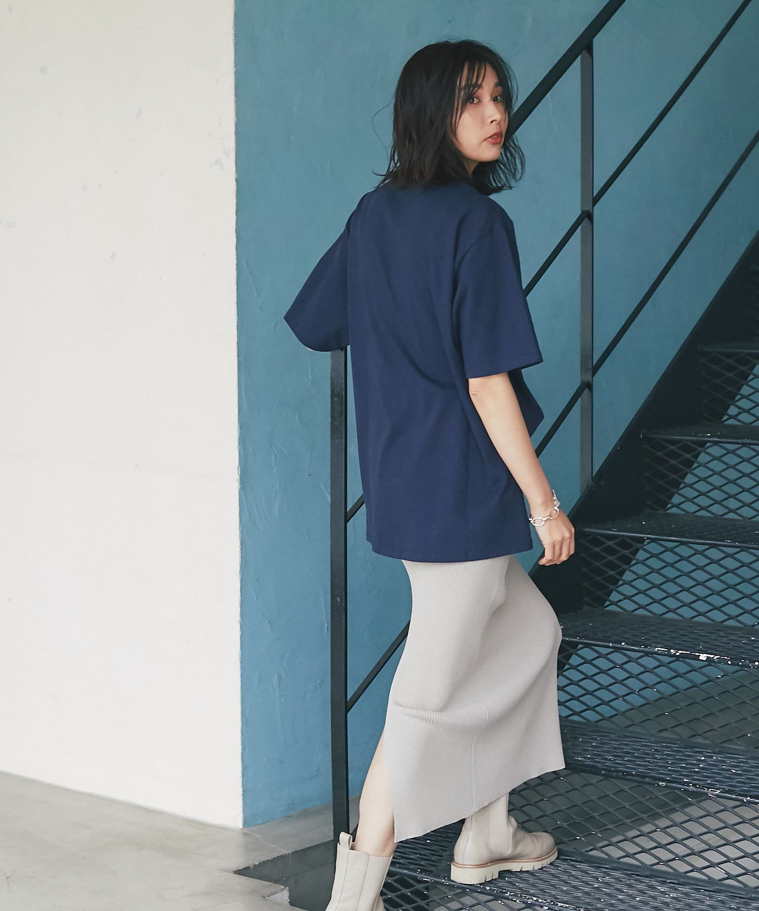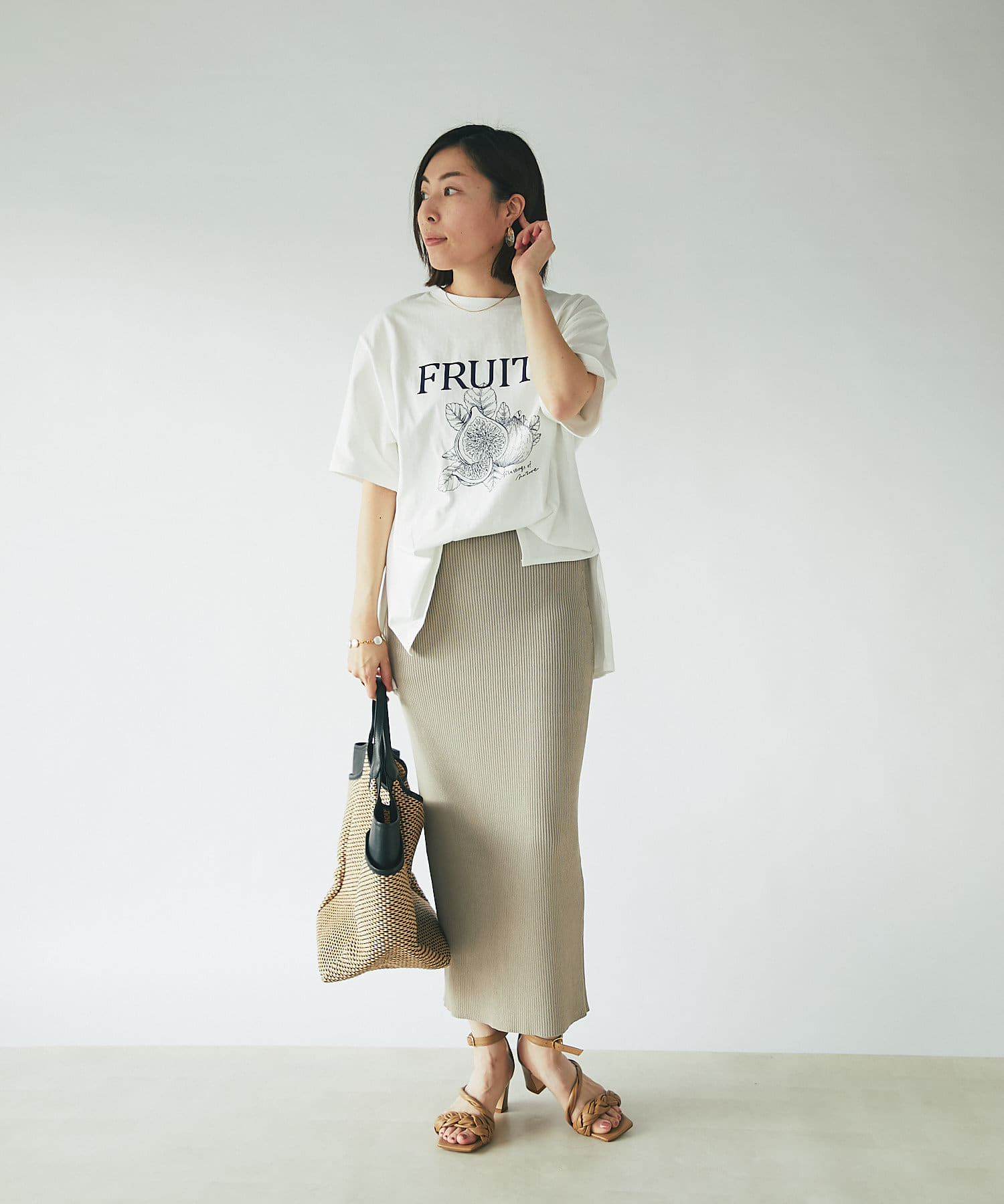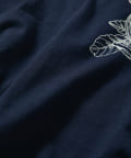 WEB限定の半袖Tシャツ。フルーツ柄でカジュアルなデザインですが、ネイビーにすることで大人な印象に。キレイめアイテムとの相性も良く、着回しが効く一枚です。