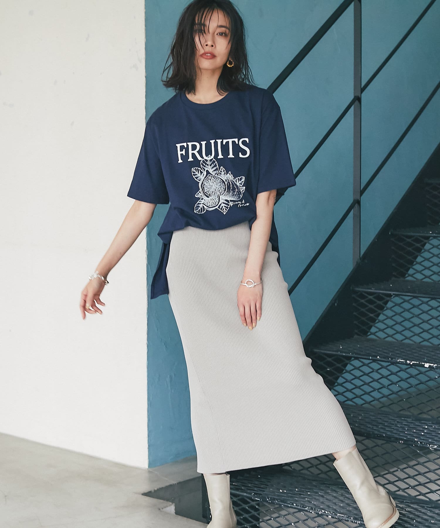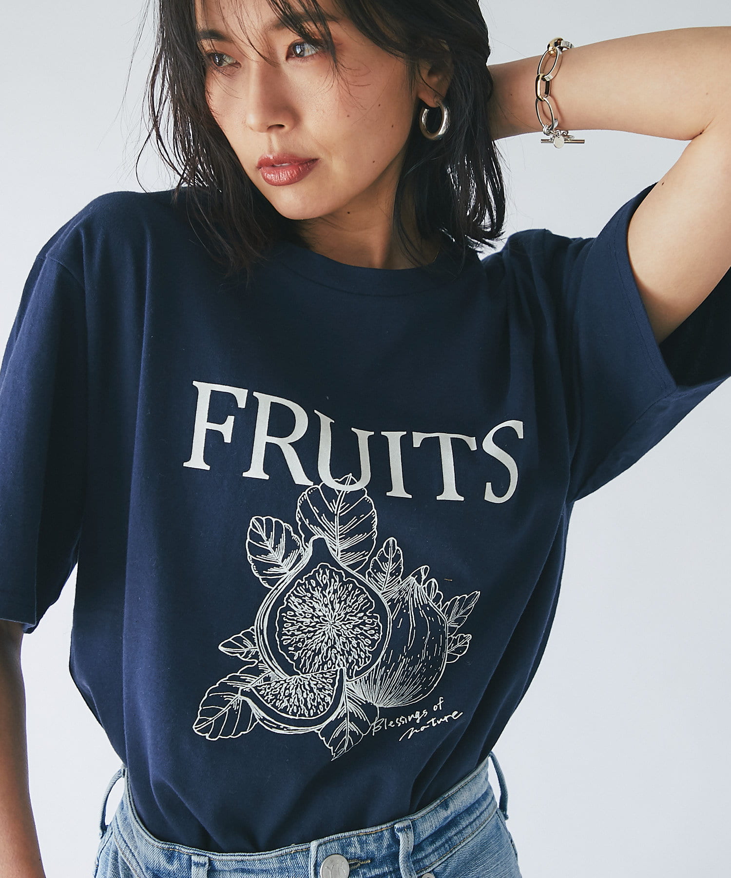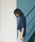 WEB限定の半袖Tシャツ。フルーツ柄でカジュアルなデザインですが、ネイビーにすることで大人な印象に。キレイめアイテムとの相性も良く、着回しが効く一枚です。