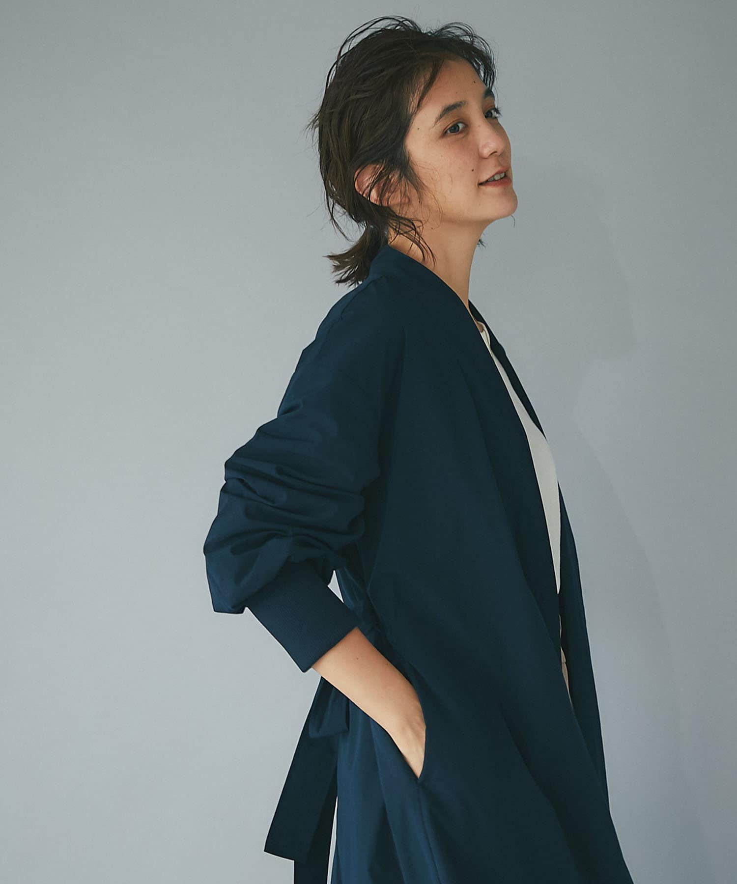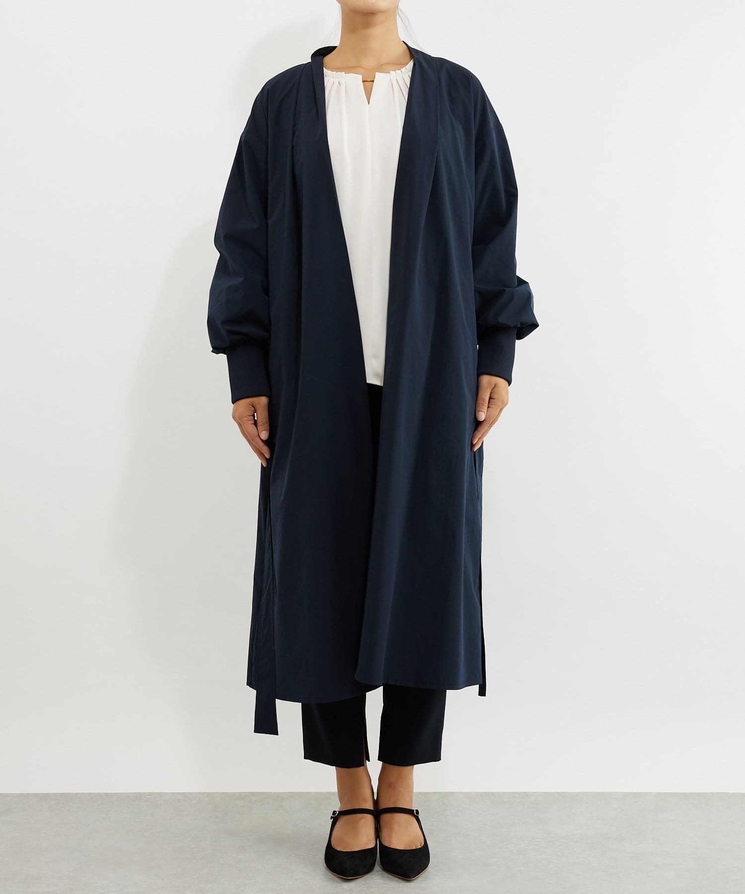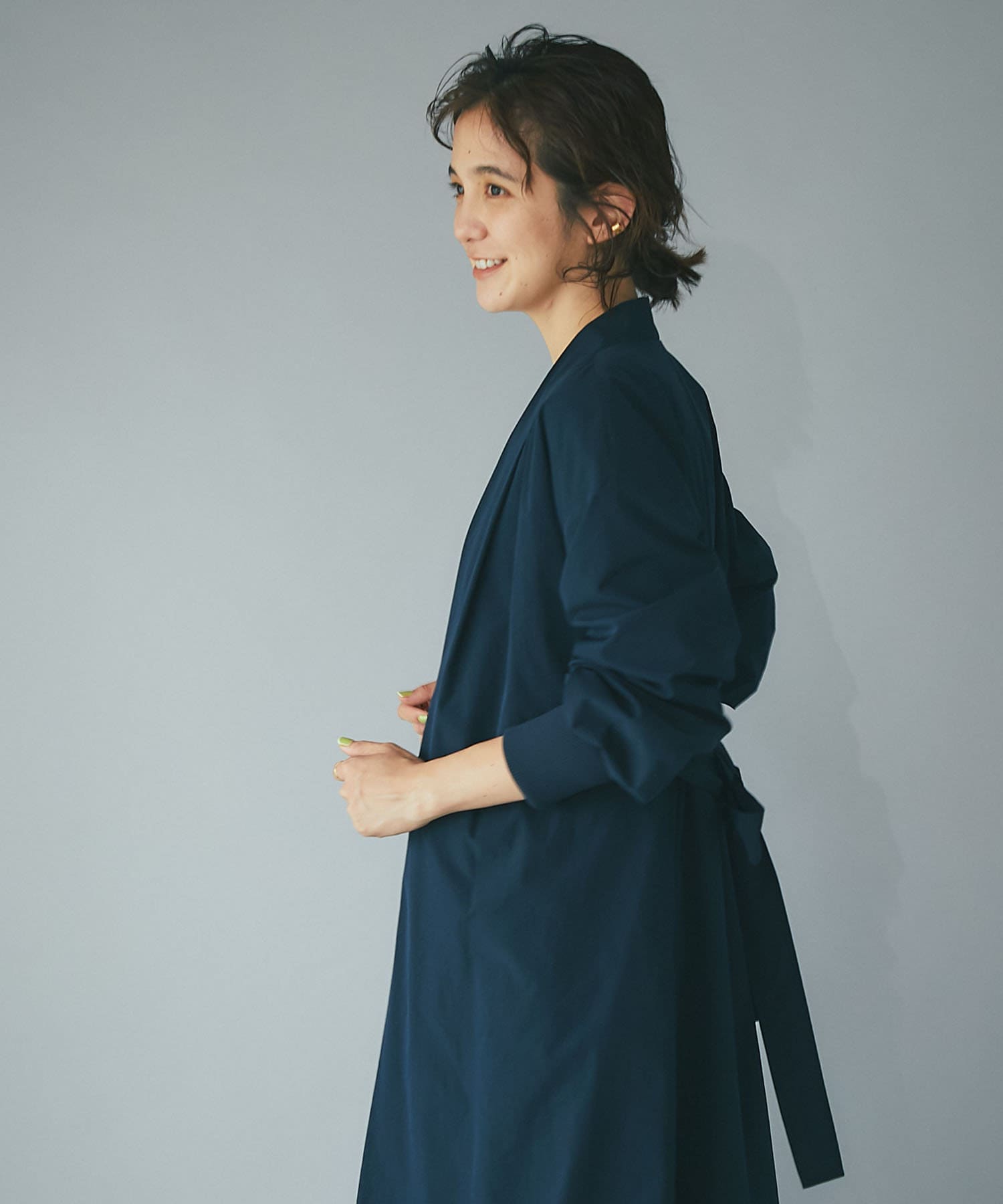 カーディガンのような気楽さとコートのきちんと感を兼ね備えた万能デザインのガウンコート。