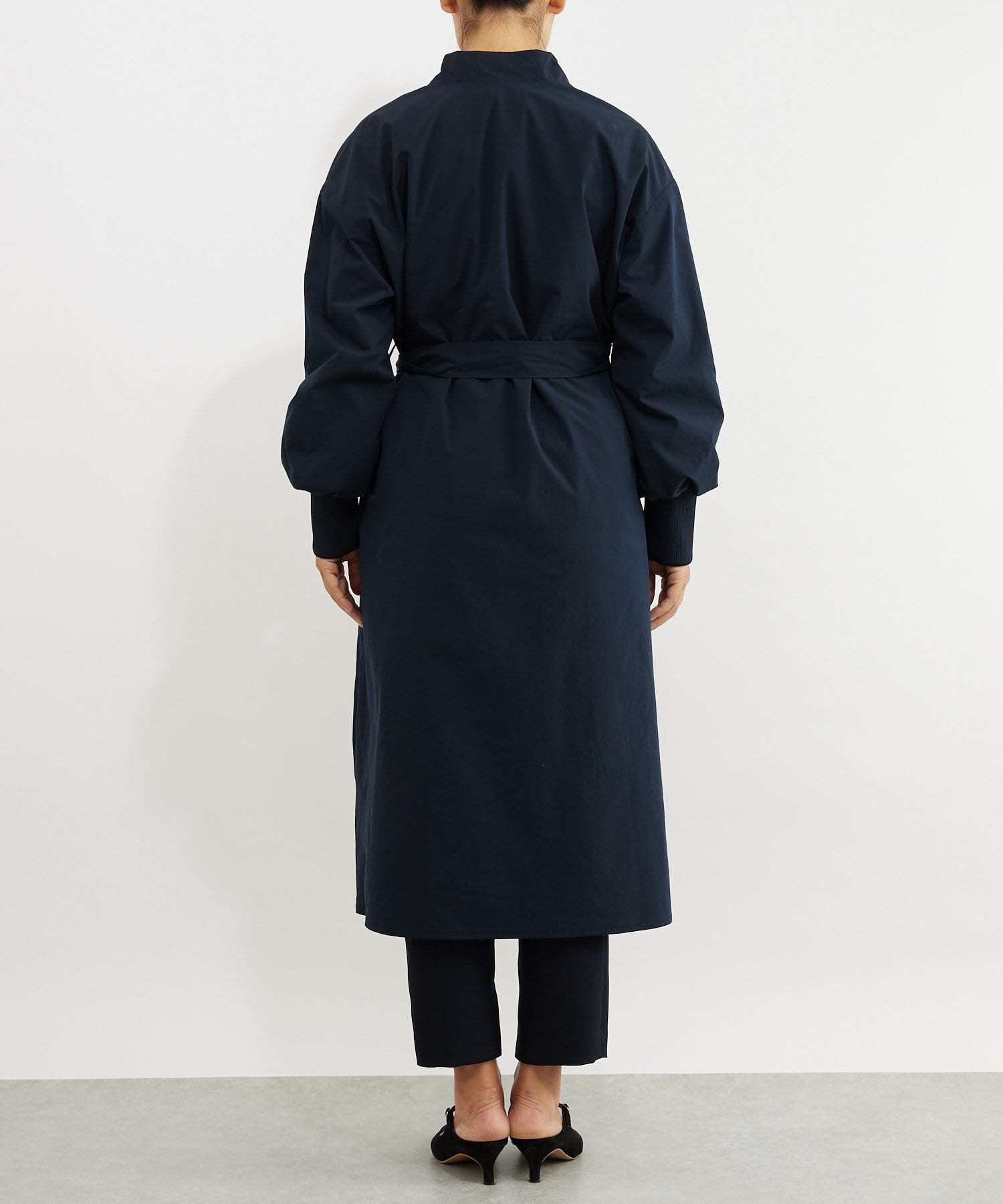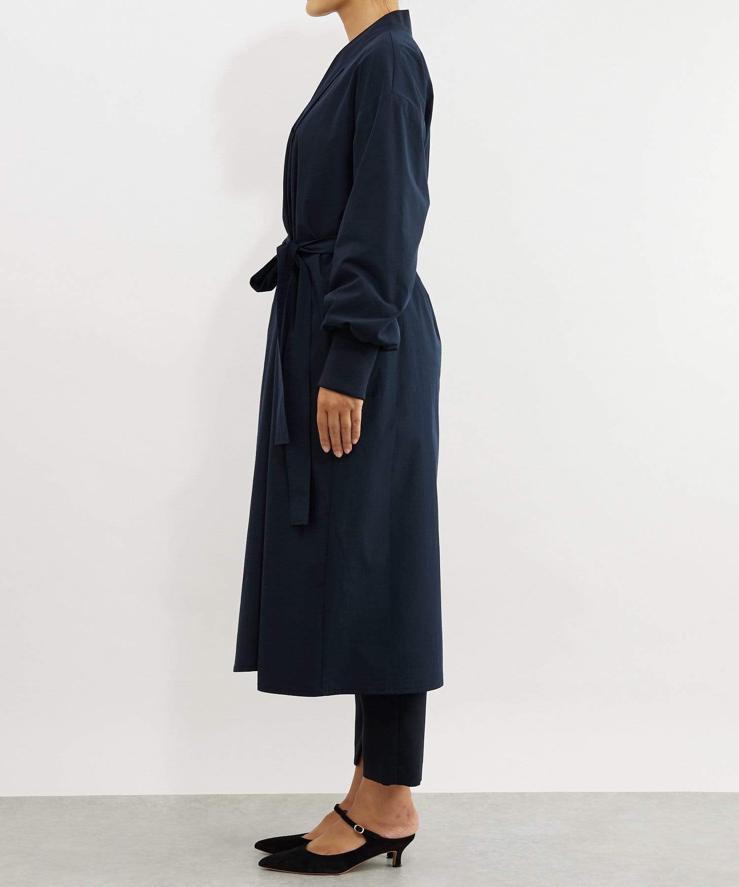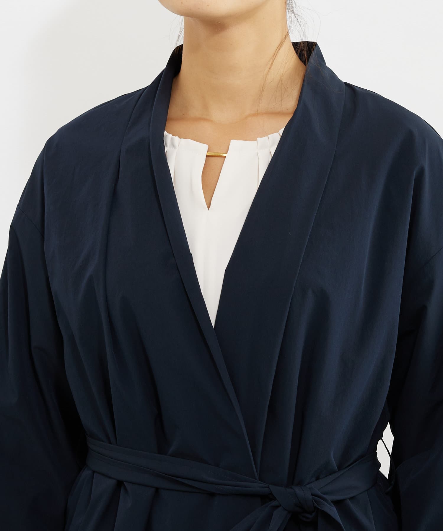 カーディガンのような気楽さとコートのきちんと感を兼ね備えた万能デザインのガウンコート。