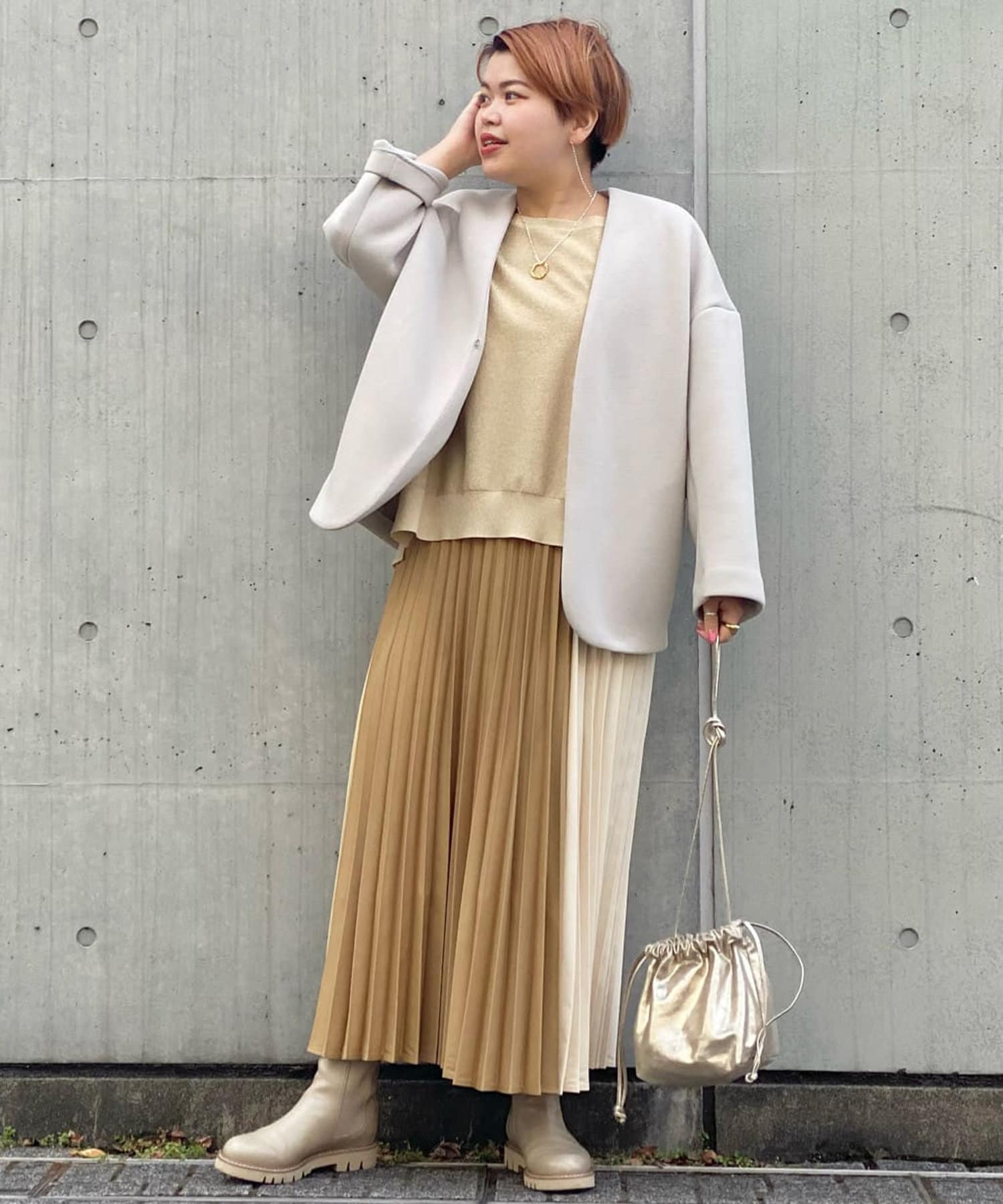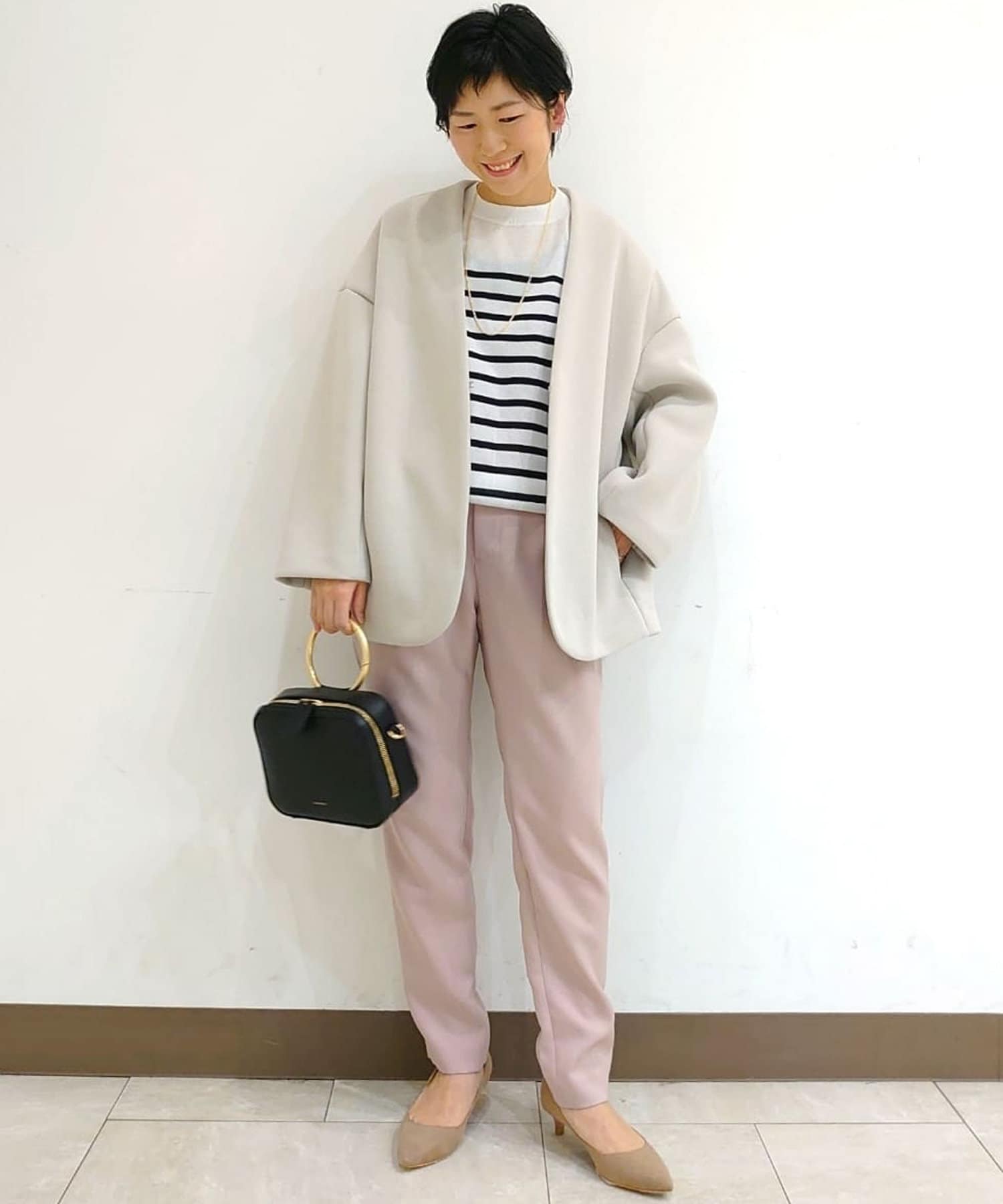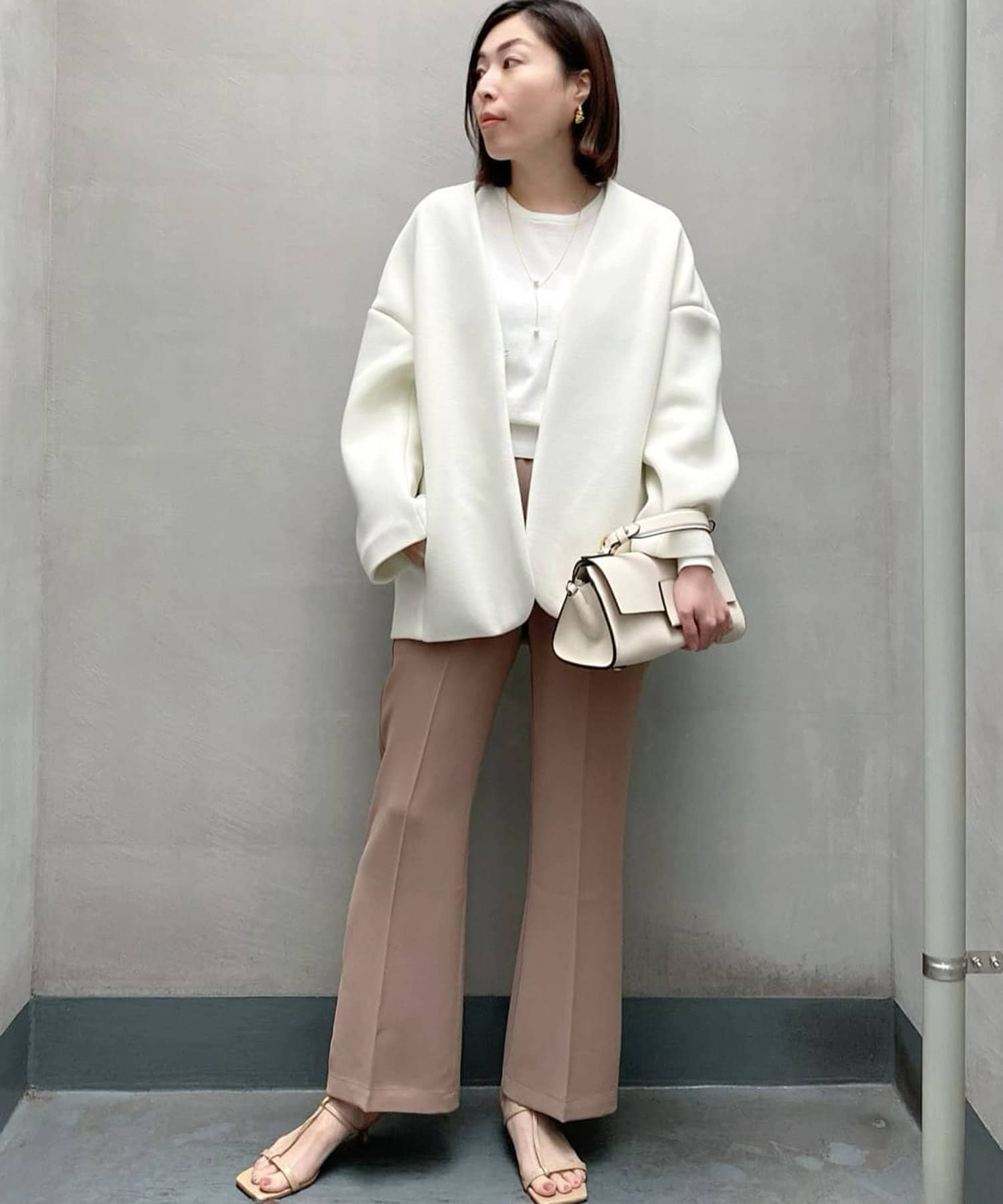 フレアパンツやスカートなど、フェミニンボトムにも相性◎です。
