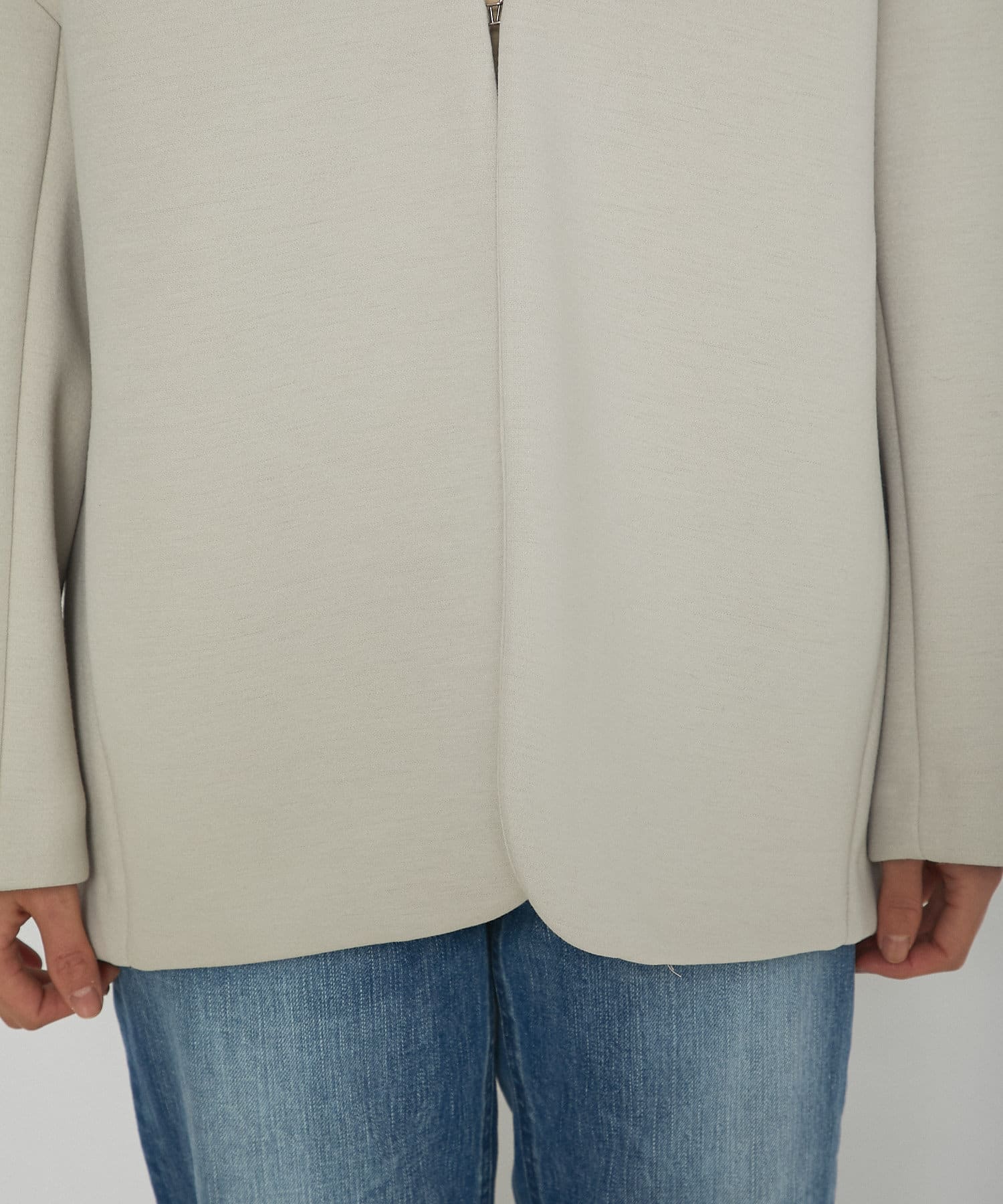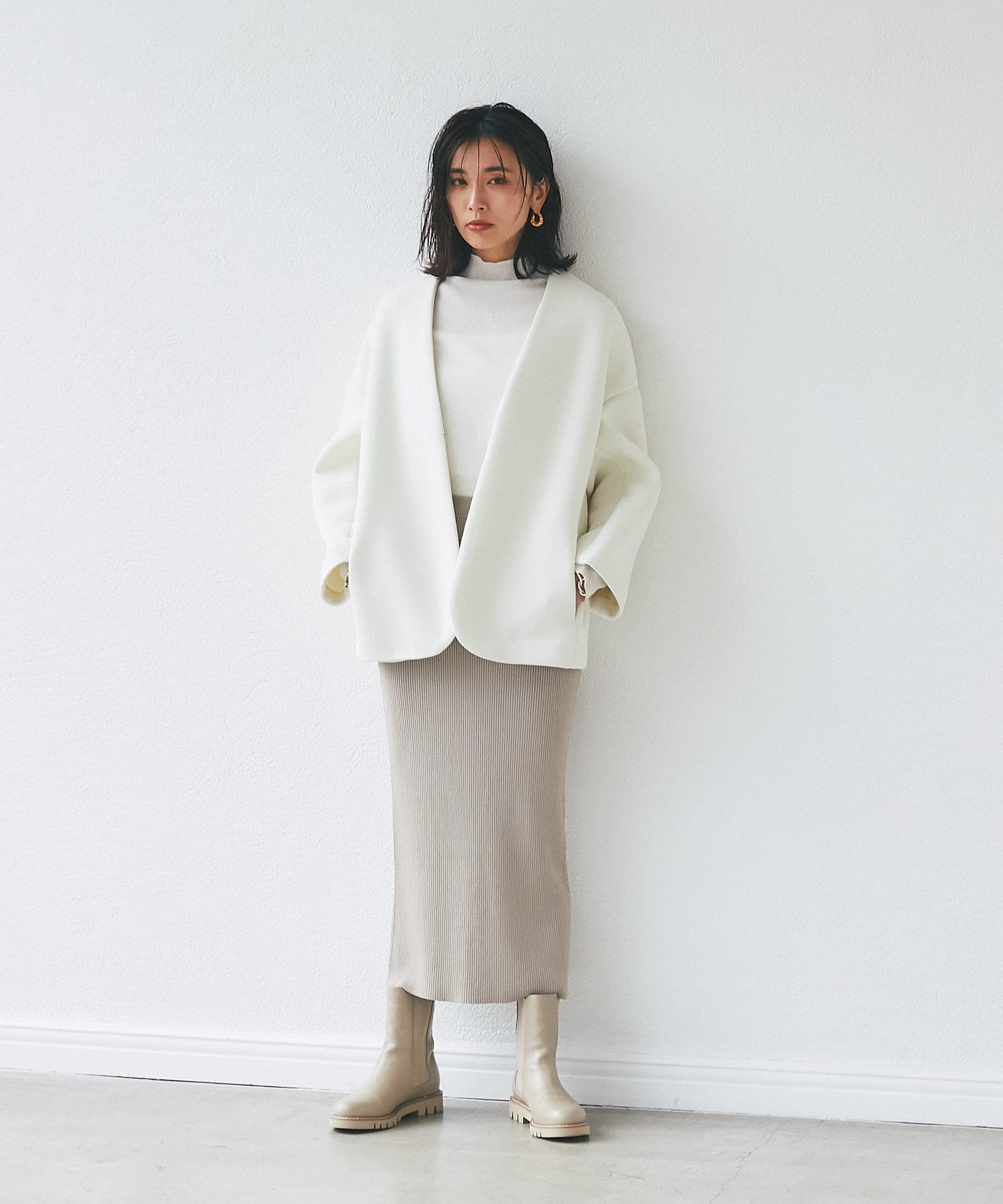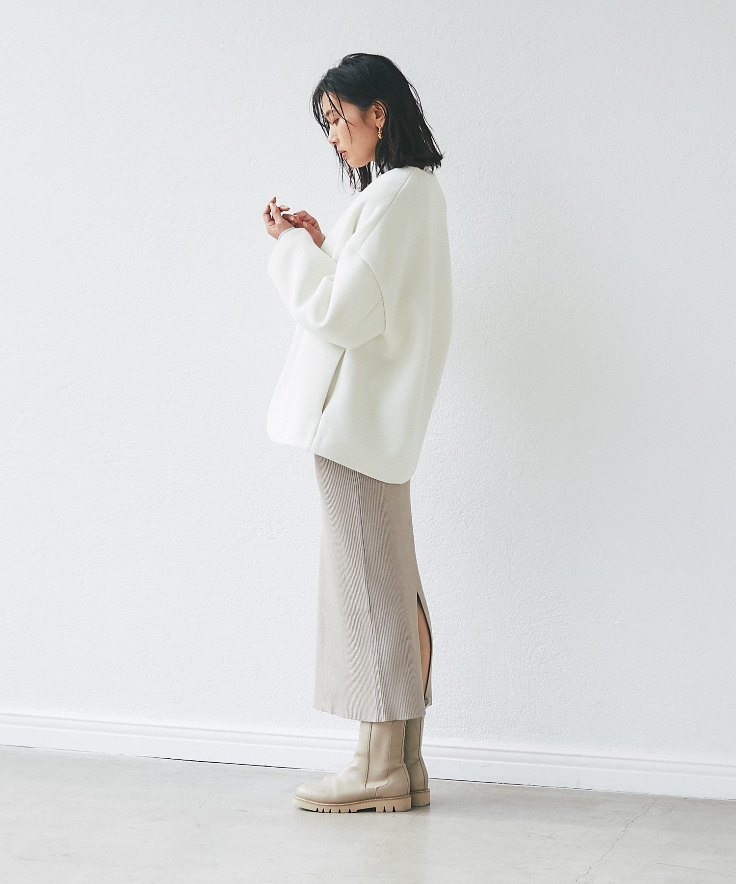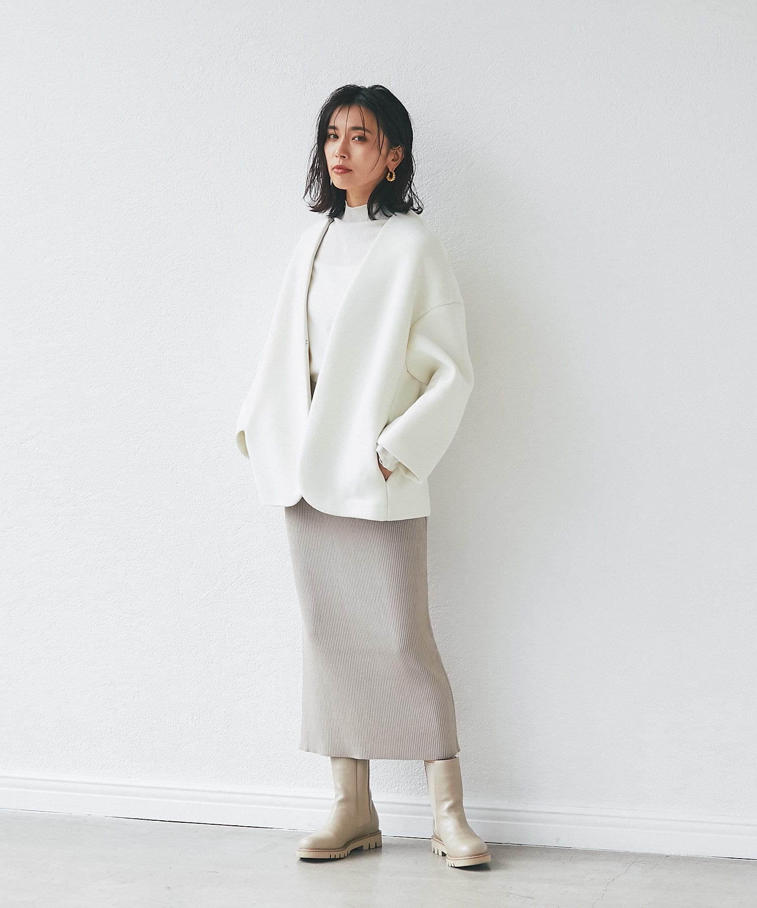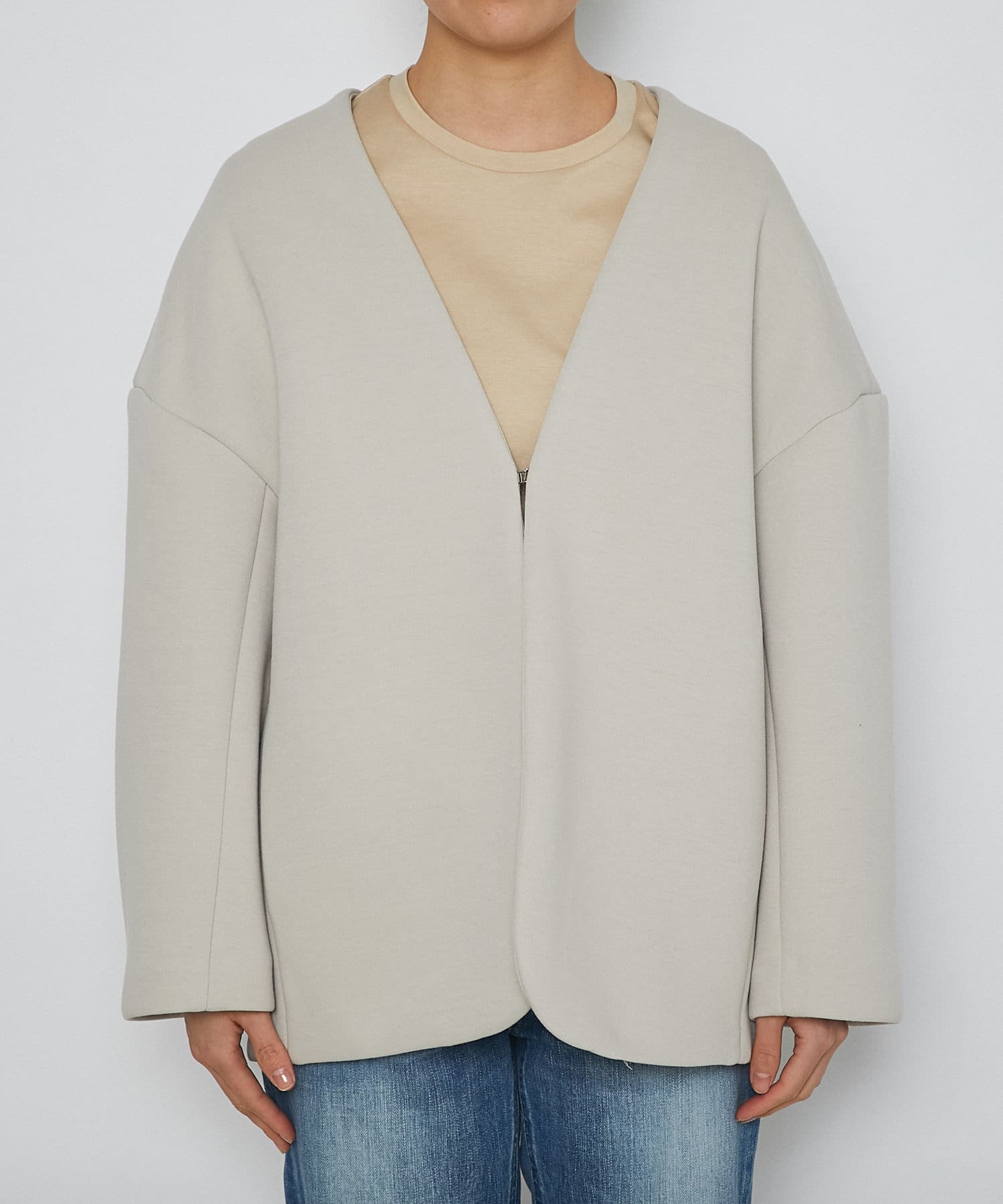 軽くて保温性の優れたダンボール素材のアウターです。シンプルなノーカラーデザインで、アームや身幅はゆったりしているのでインナーの形を選ばず着用頂けます。ミドル丈なので、ヒップがちょうど隠れるくらいの安心丈です。