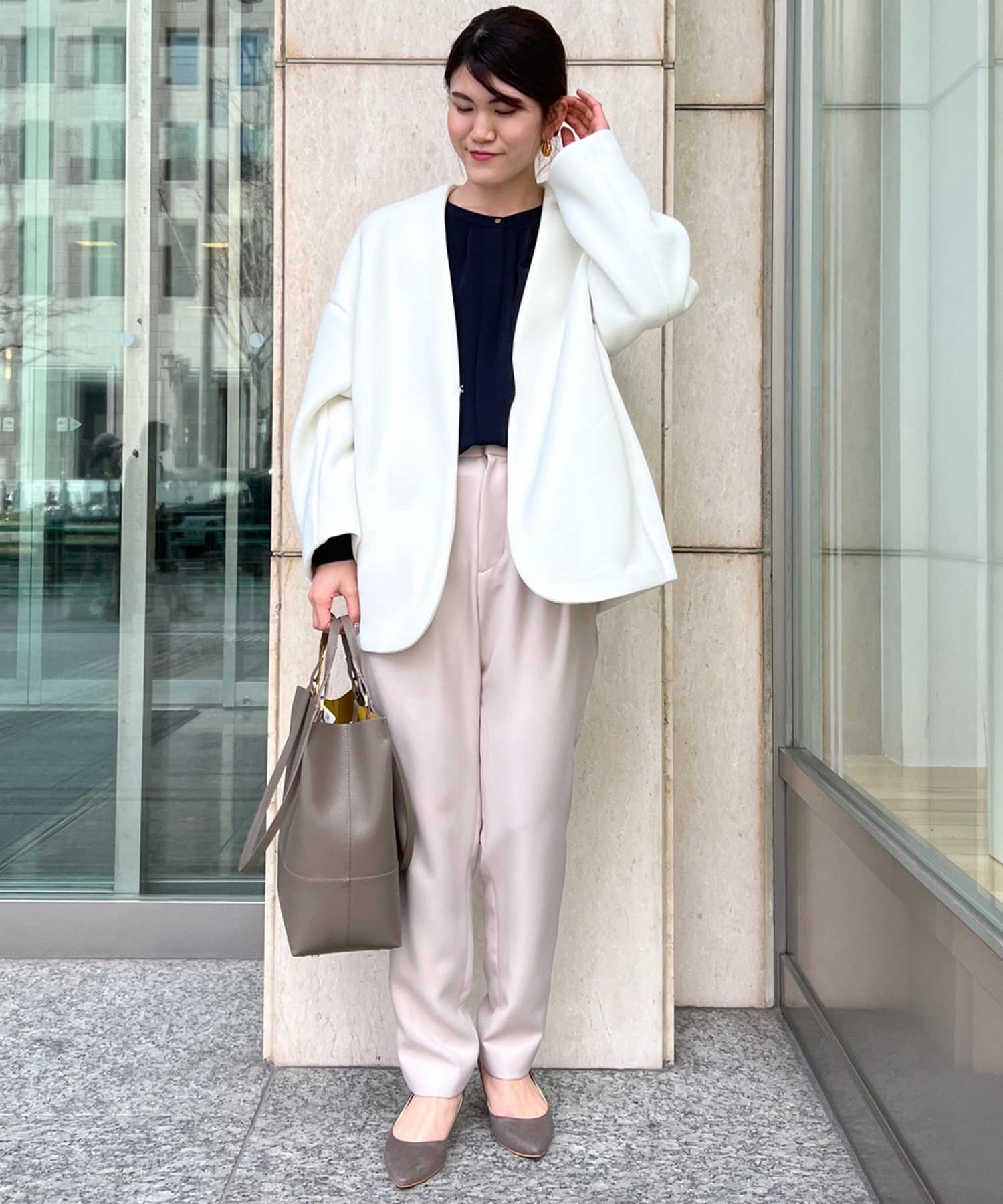 オンにもオフにも着回ししやすいダンボールコートは丈感も絶妙なミドル丈で、ボトムスを選ばずに着用頂ける優秀なアイテム。ブラウスとも相性がよく通勤スタイルにも活躍してくれます。