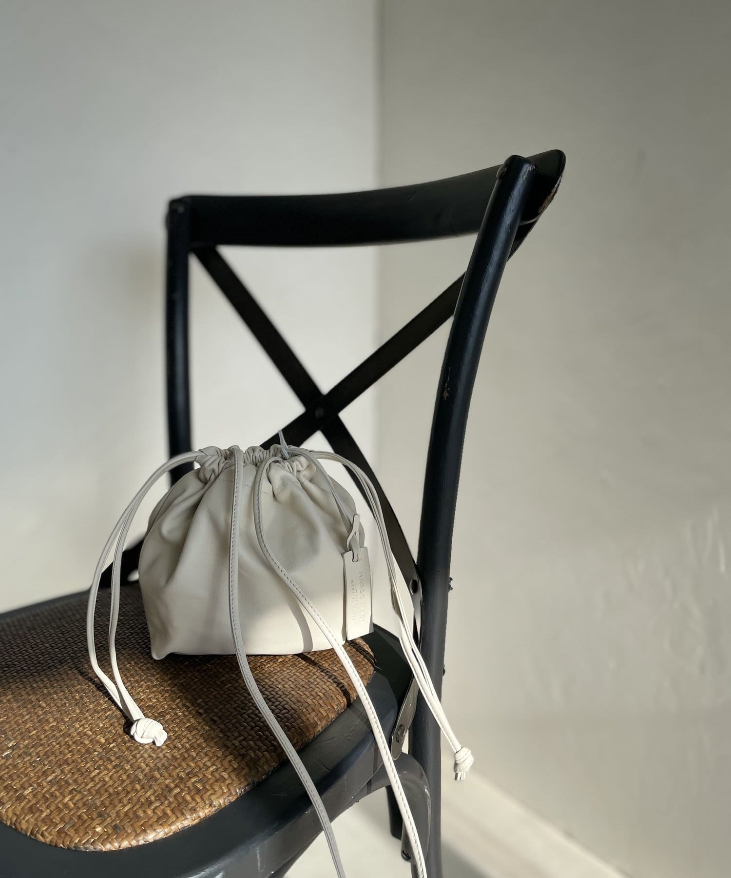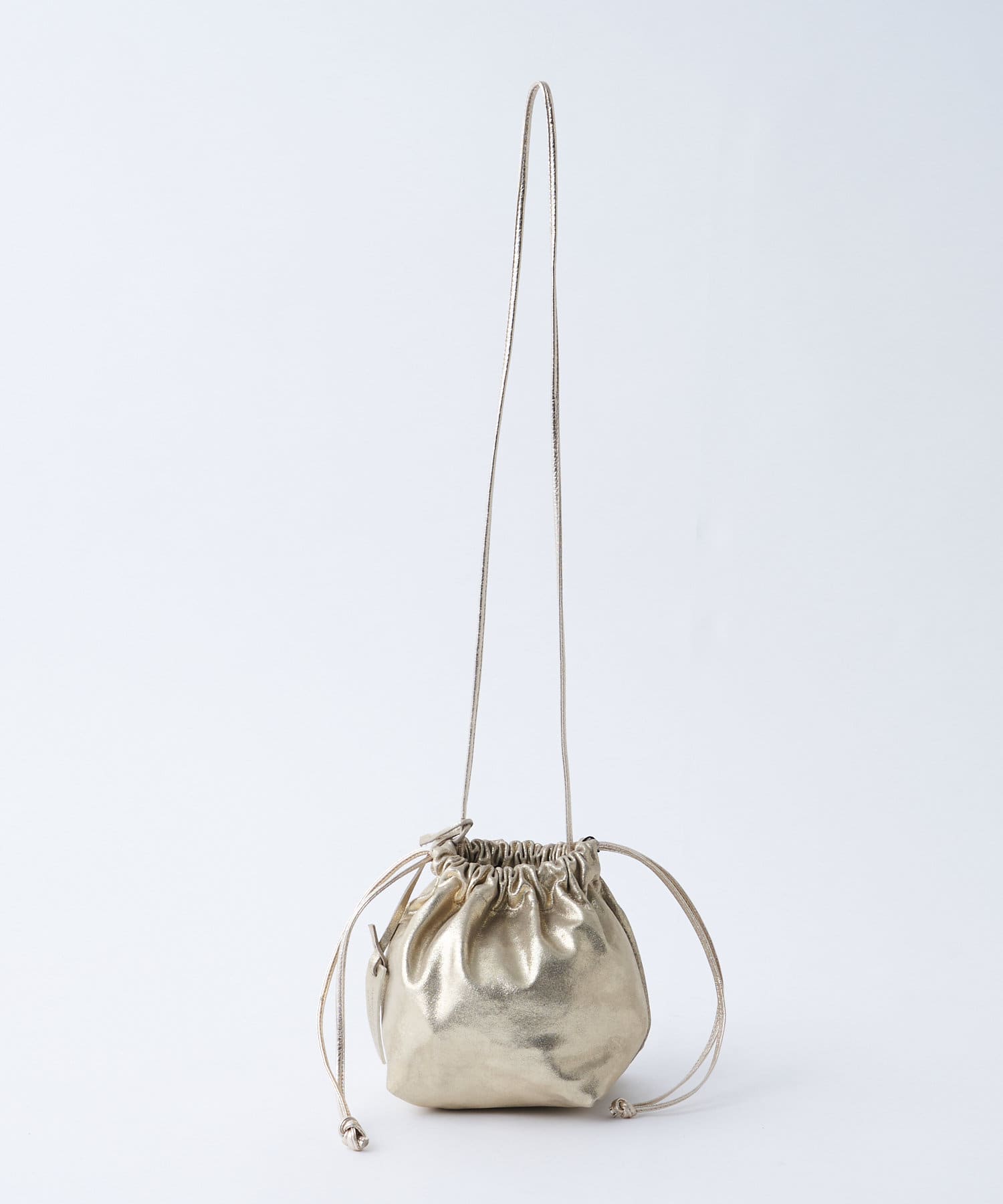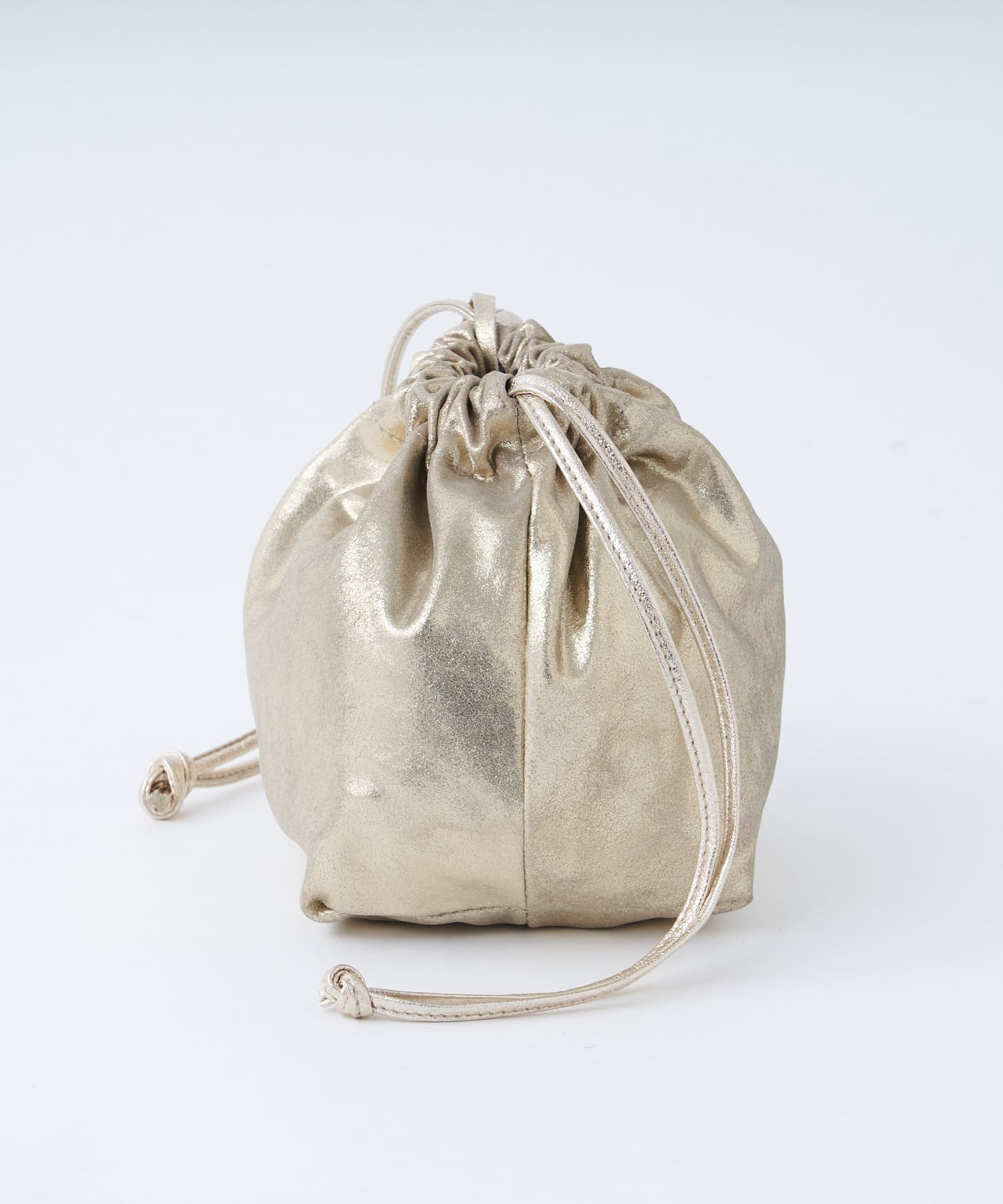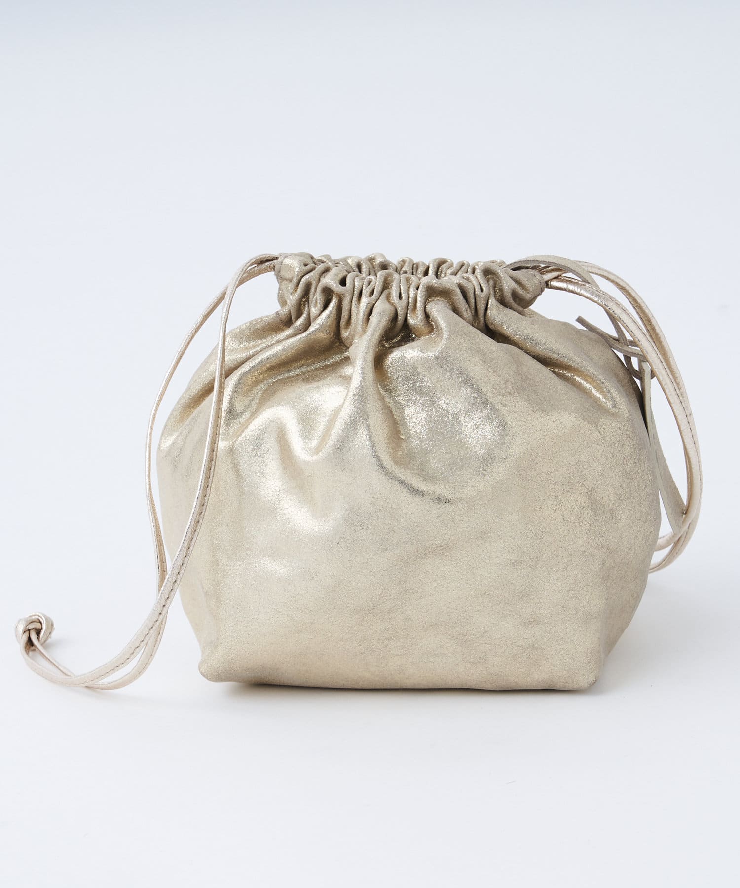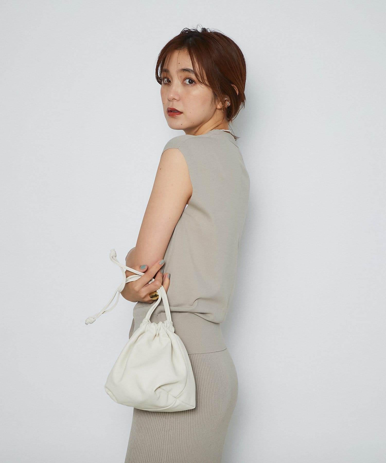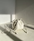トレンドライクな巾着型は、ラフに持つだけで雰囲気のあるスタイリングに。
