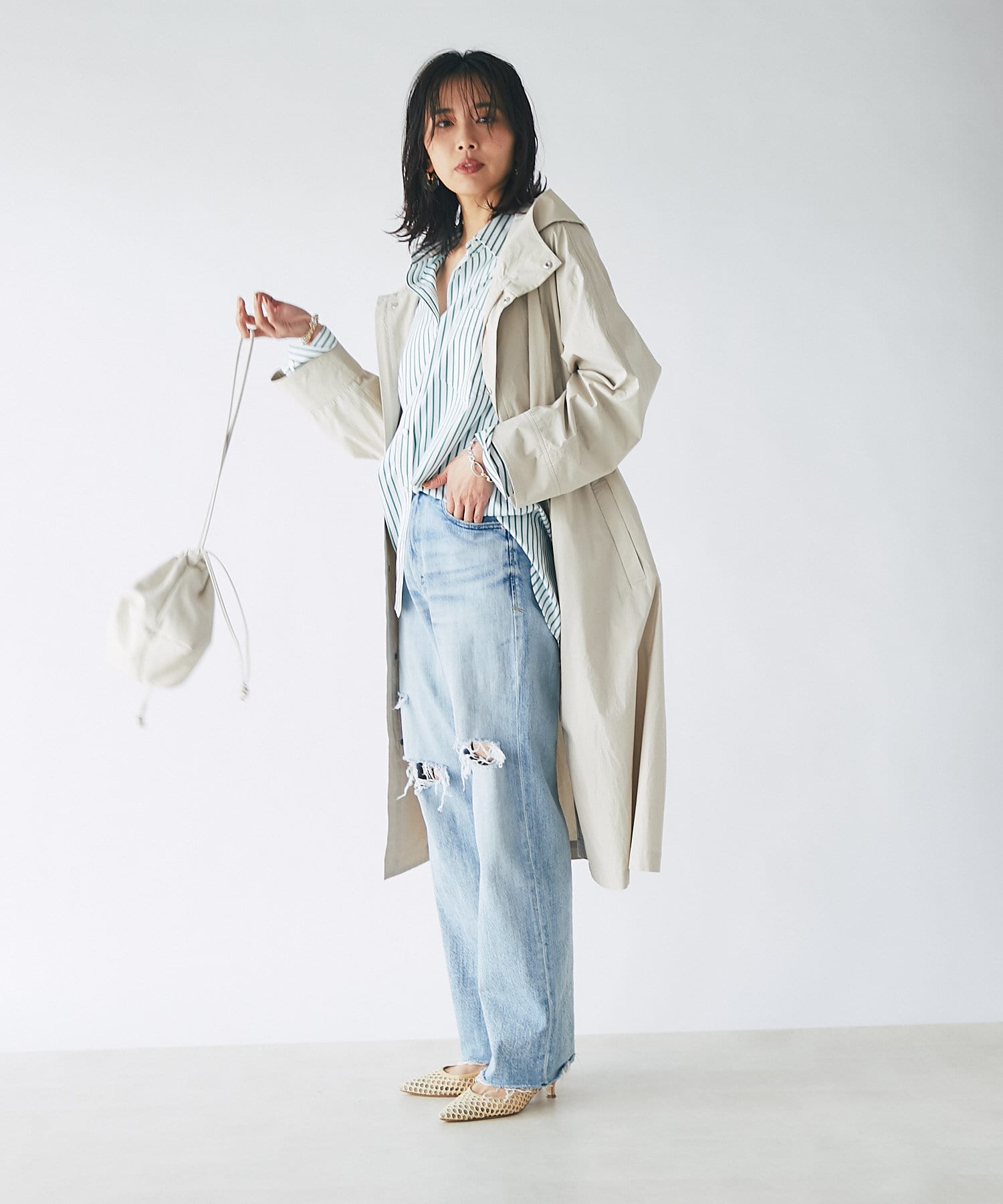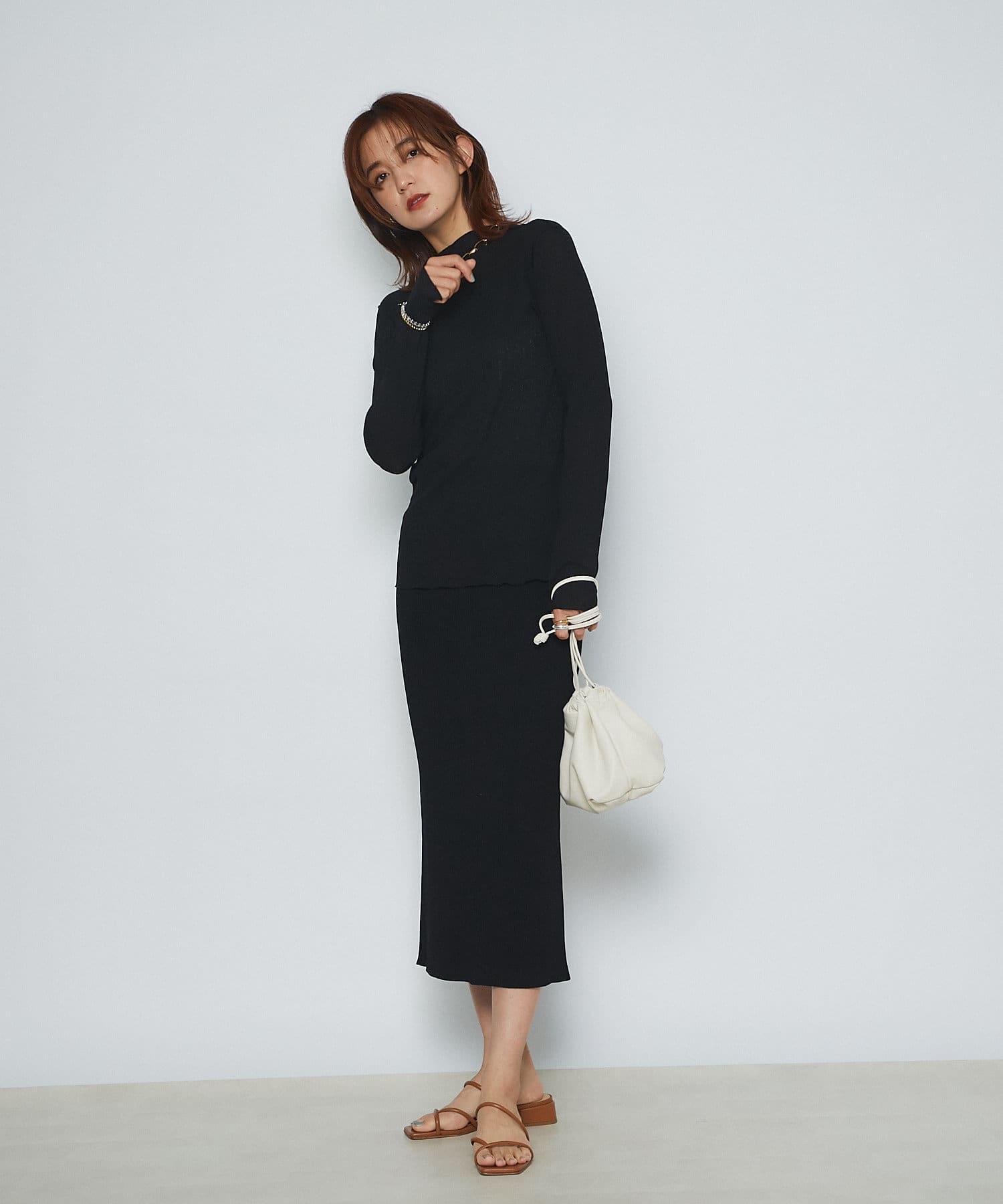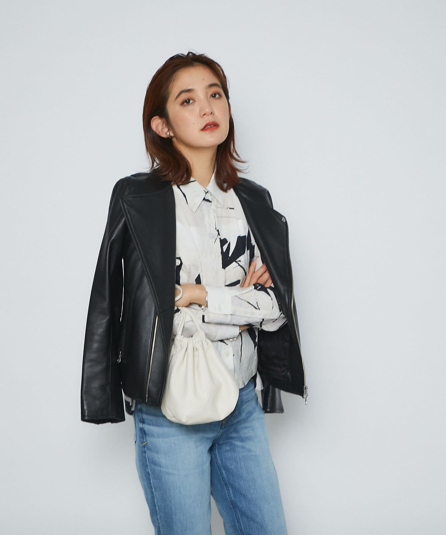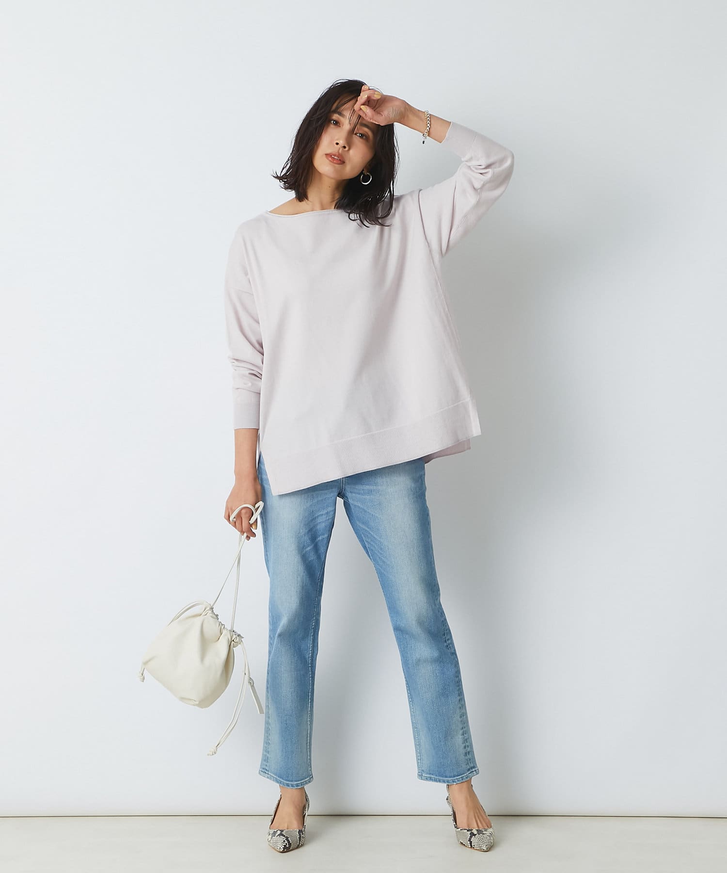 トレンドライクな巾着型は、ラフに持つだけで雰囲気のあるスタイリングに。
