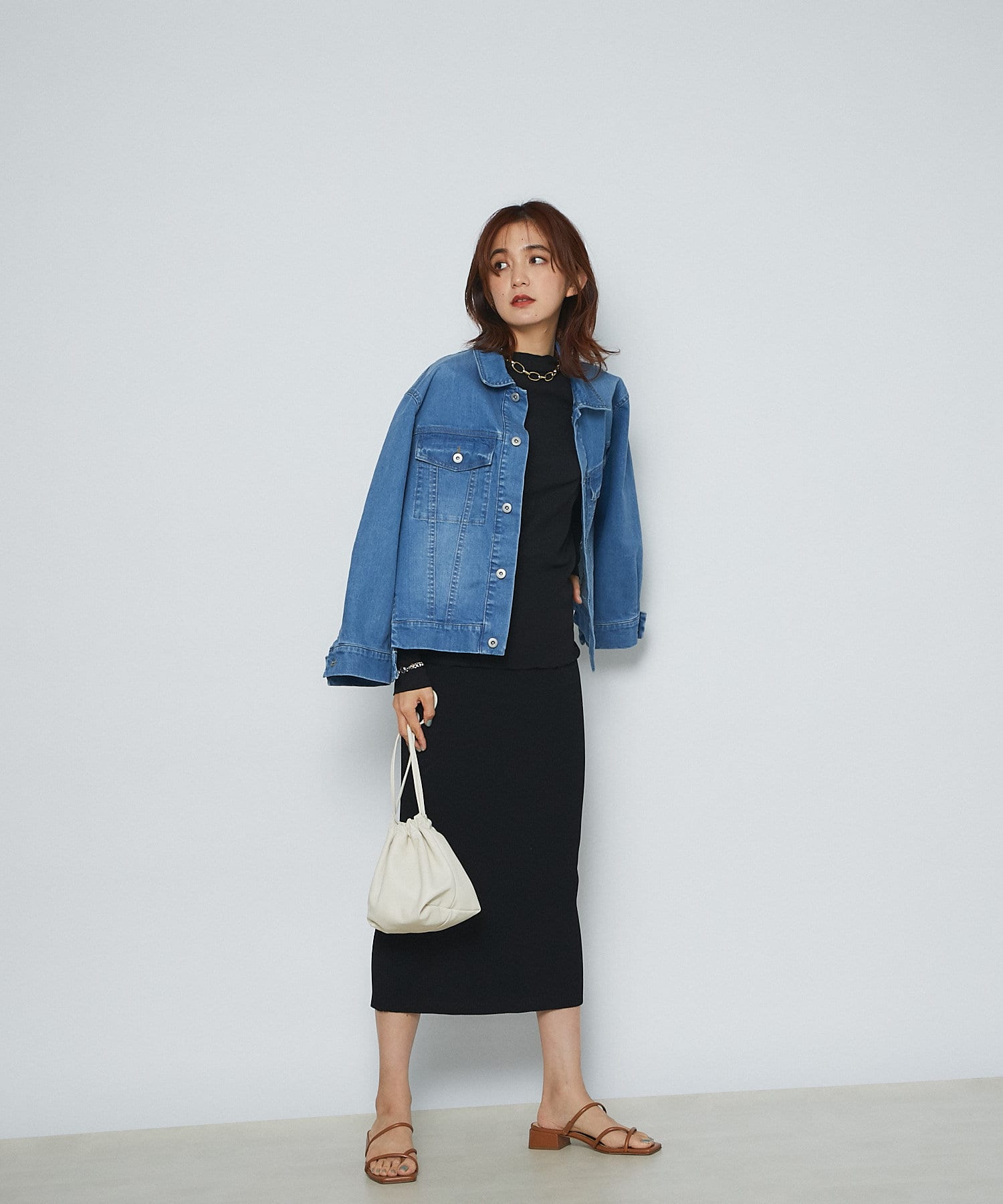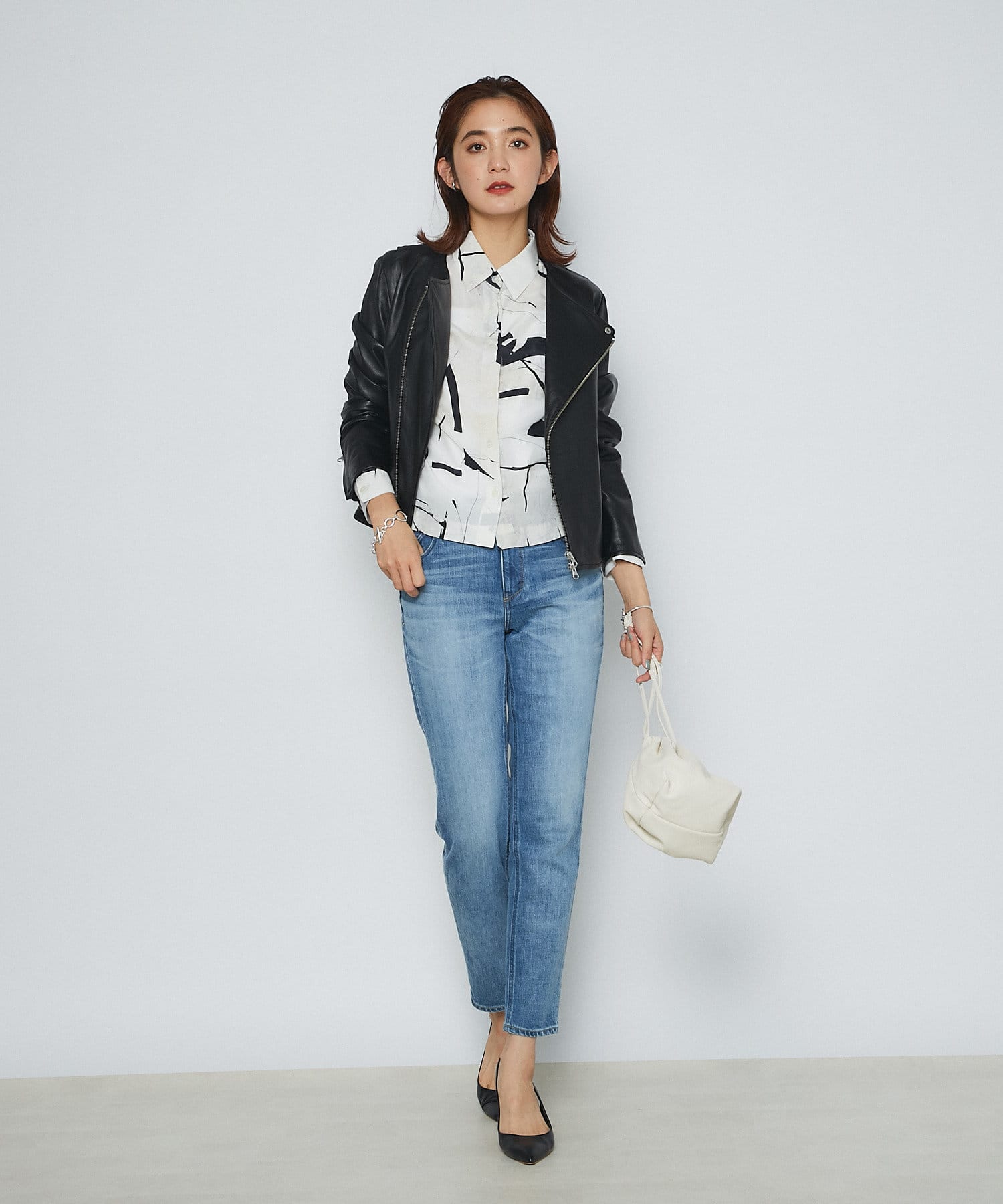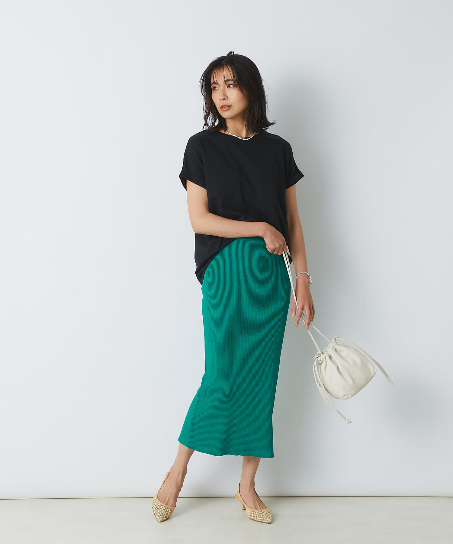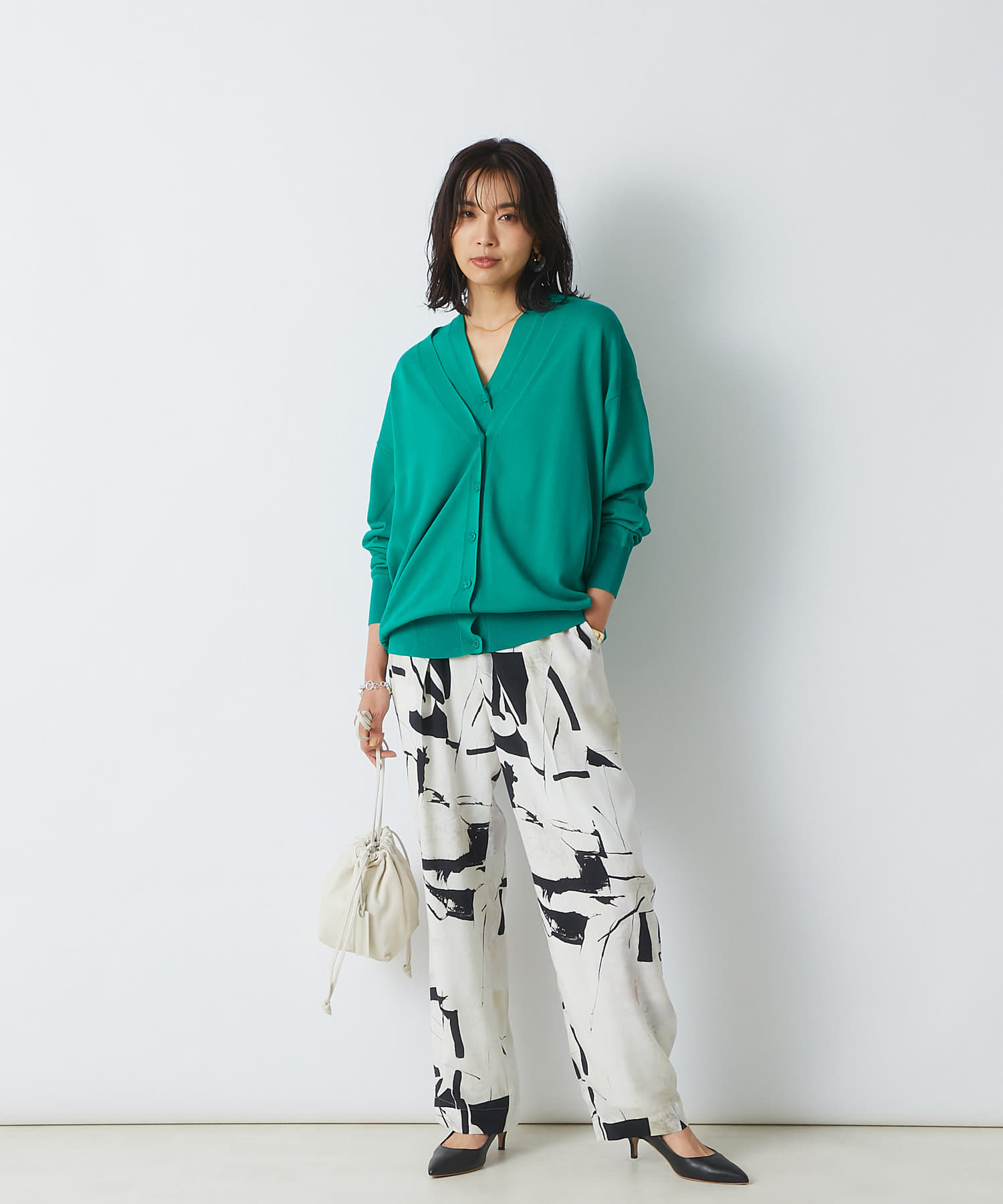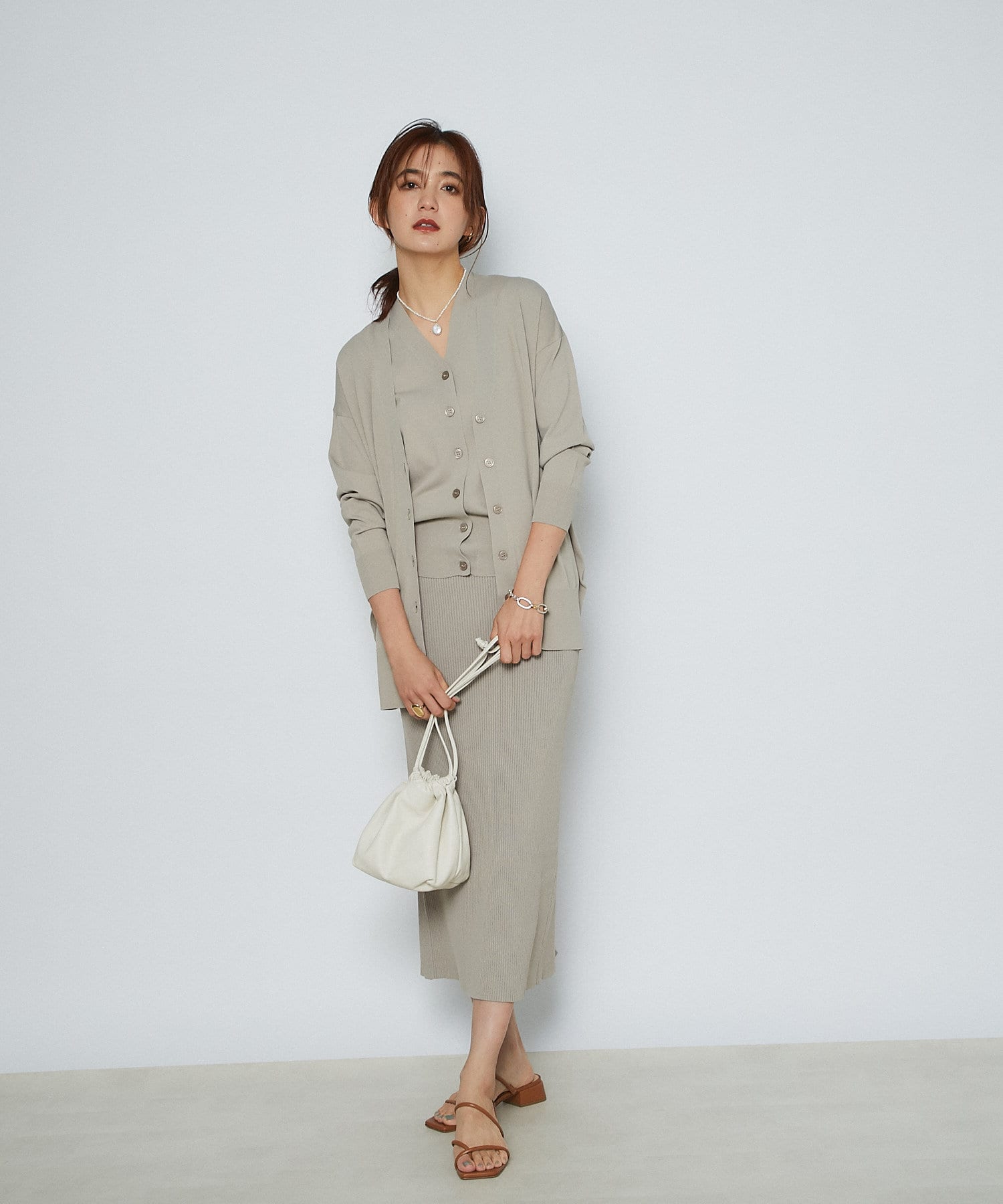 トレンドライクな巾着型は、ラフに持つだけで雰囲気のあるスタイリングに。