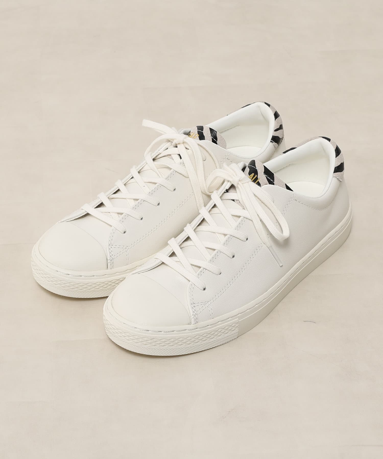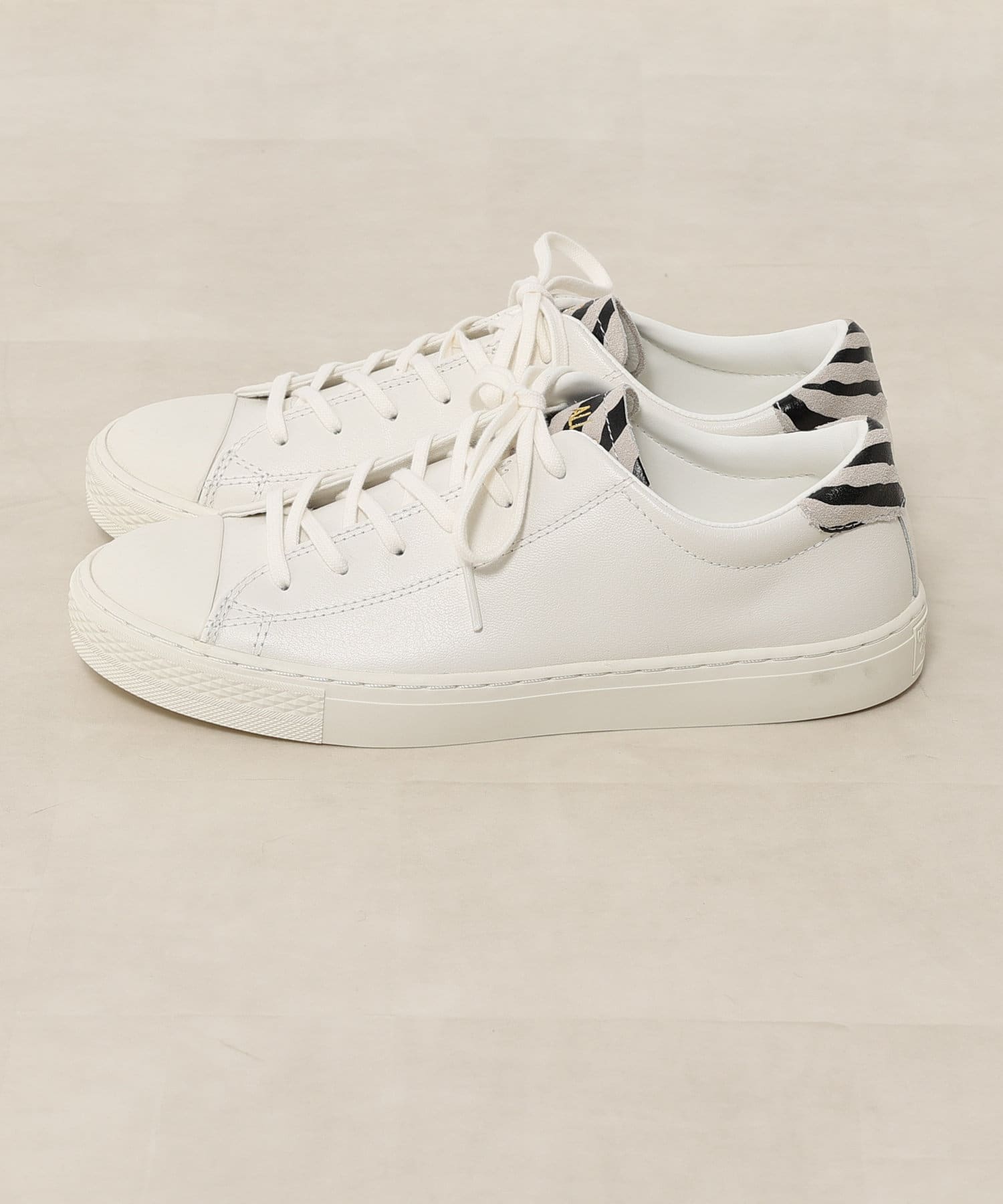 上品なスムースレザーを全面に採用し、ゼブラ柄をプリントしたスエードをタンとかかとにポイント使いしたアイテム。