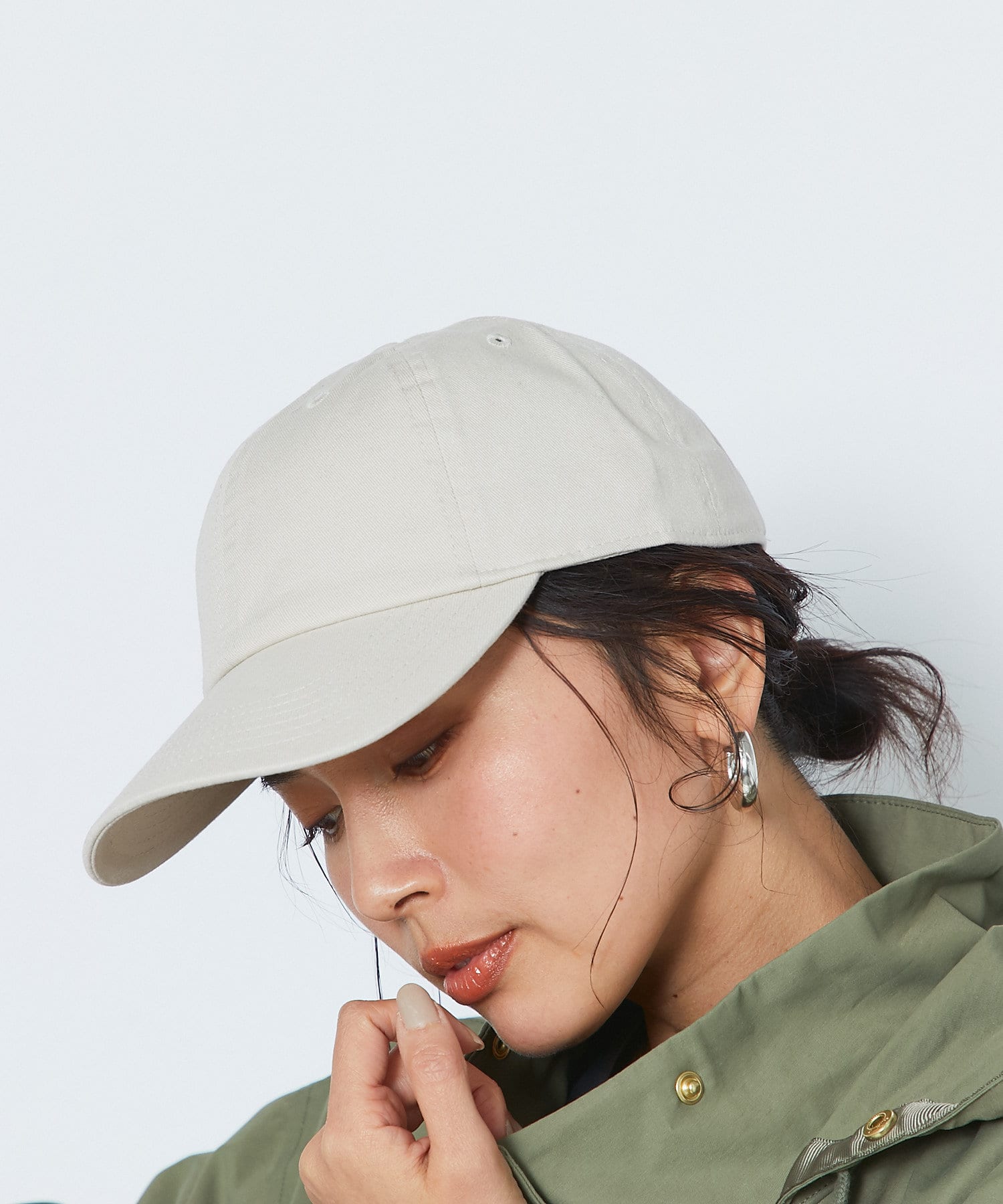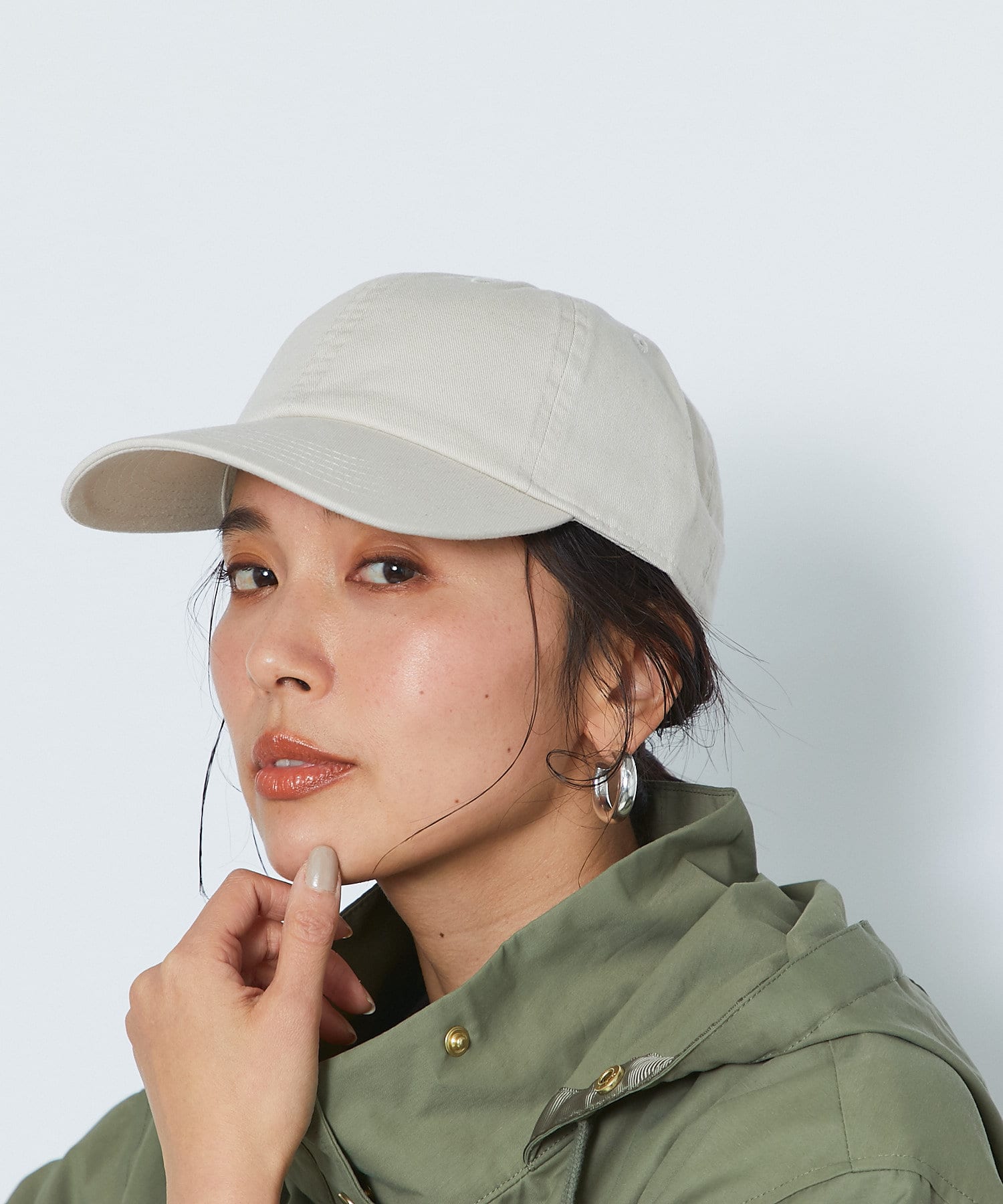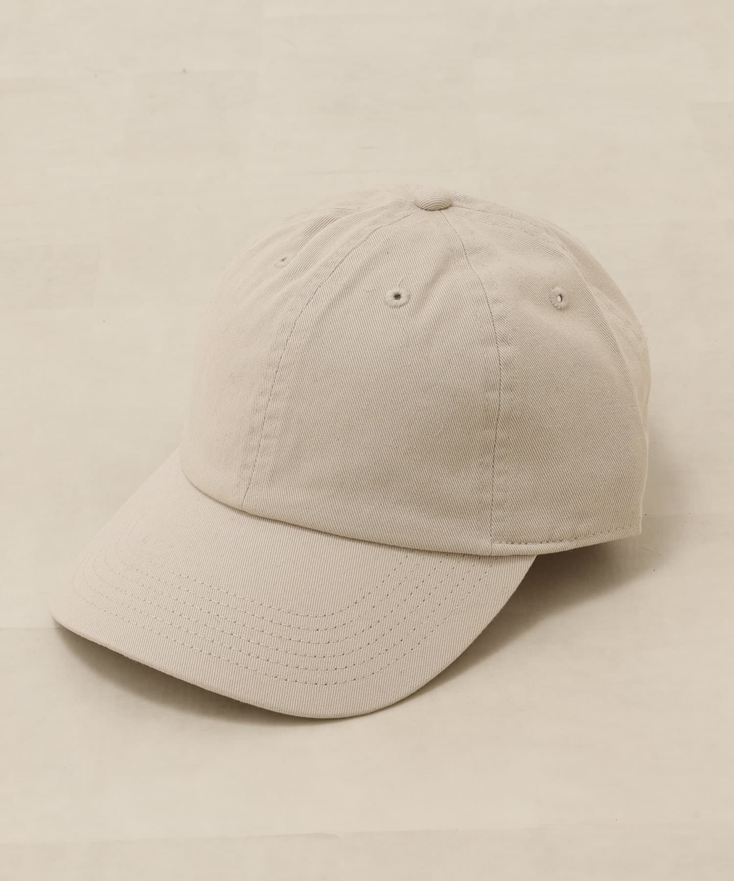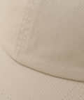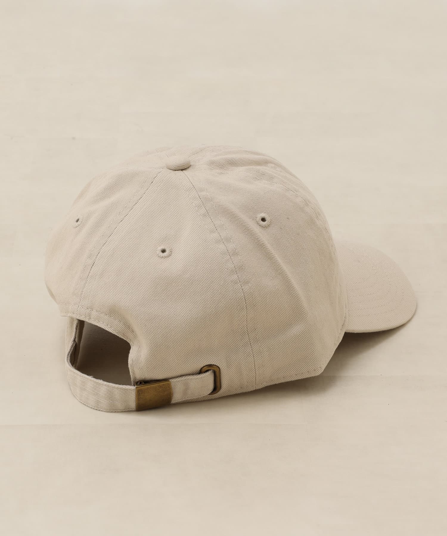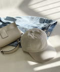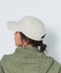 コットン素材の春から夏にかけてぴったりのキャップです。明るいトーンのベージュと、アクセントで楽しめるグリーンの2色展開で、サイズは調整できるのでご自身のサイズに合わせて着用いただけます。