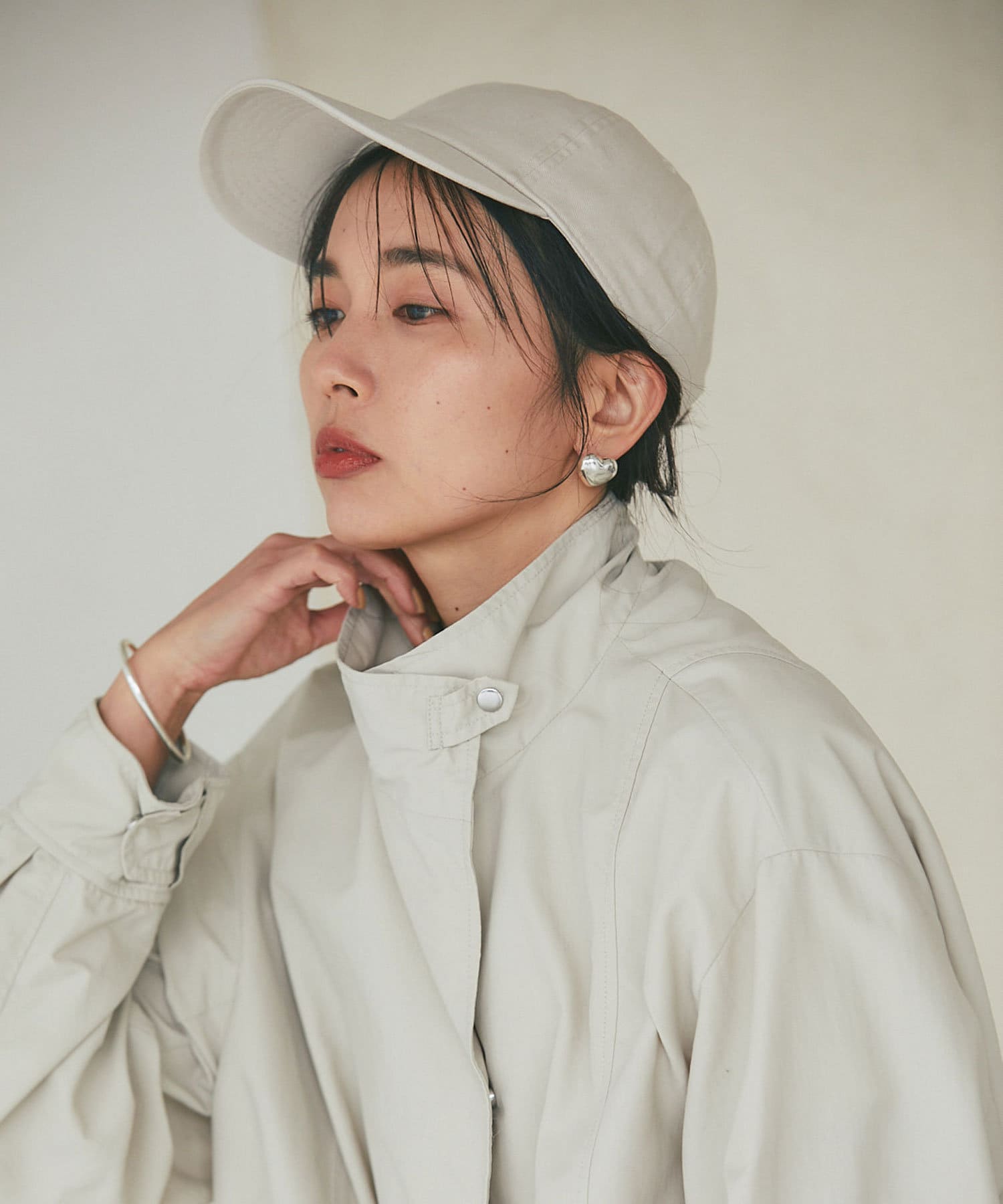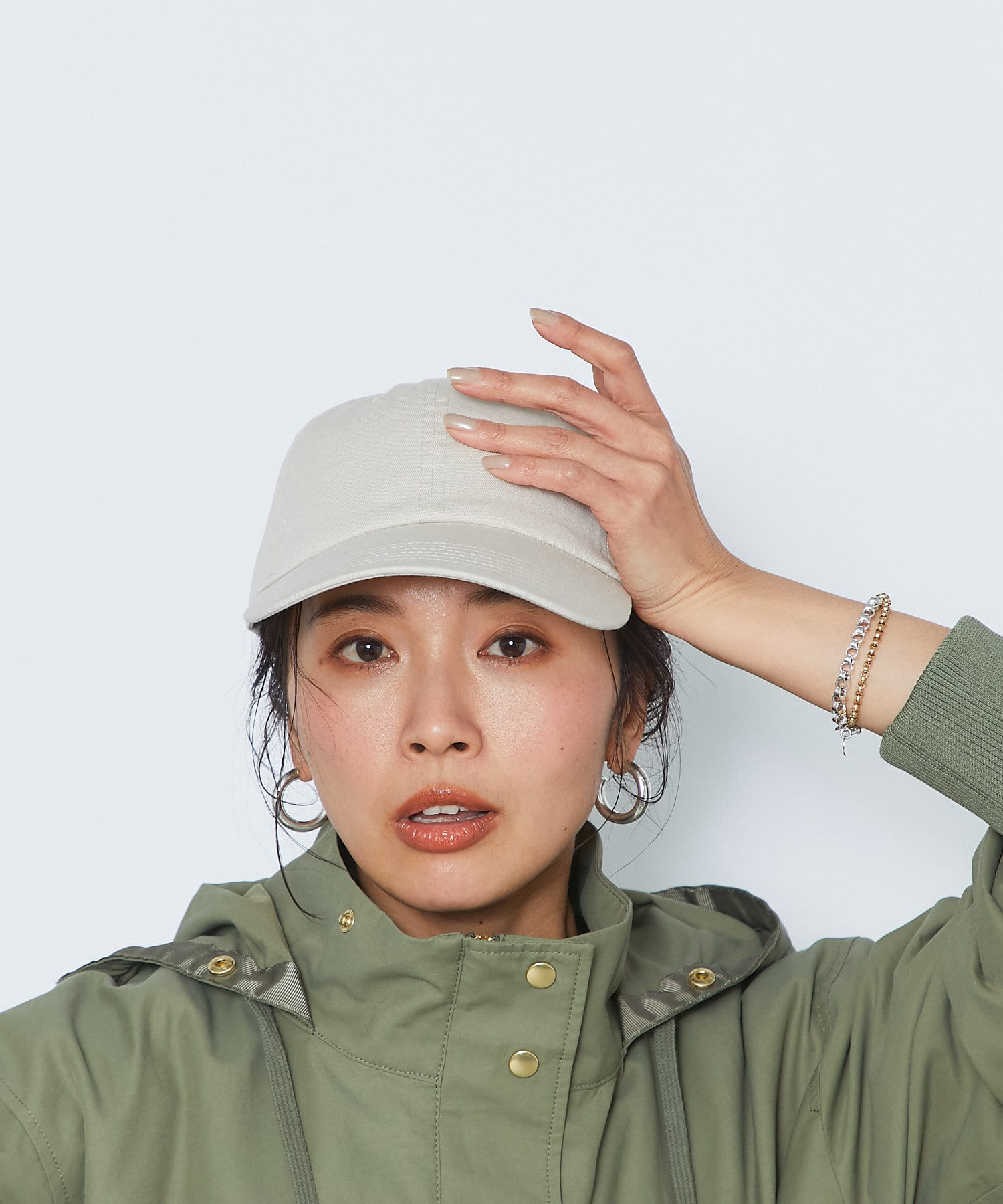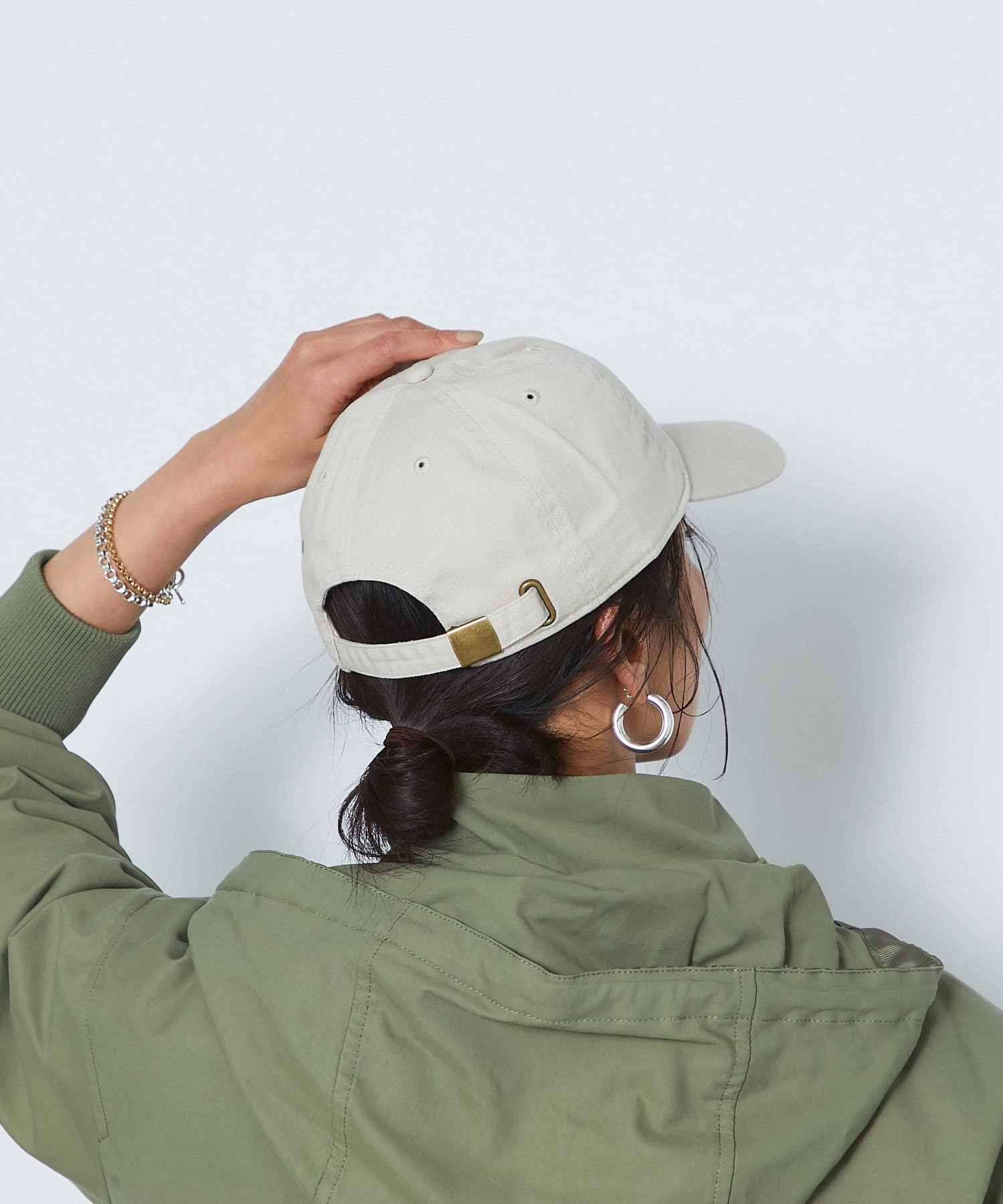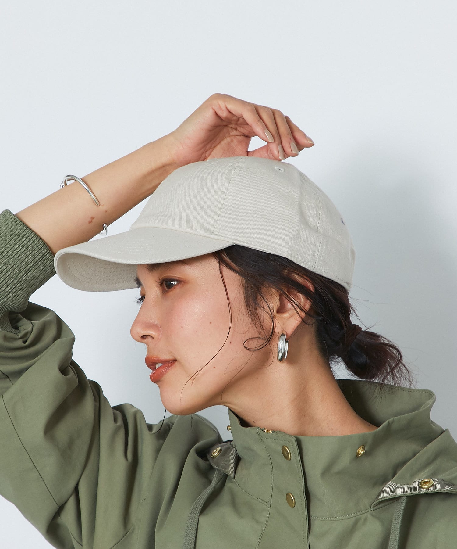 コットン素材の春から夏にかけてぴったりのキャップです。明るいトーンのベージュと、アクセントで楽しめるグリーンの2色展開で、サイズは調整できるのでご自身のサイズに合わせて着用いただけます。