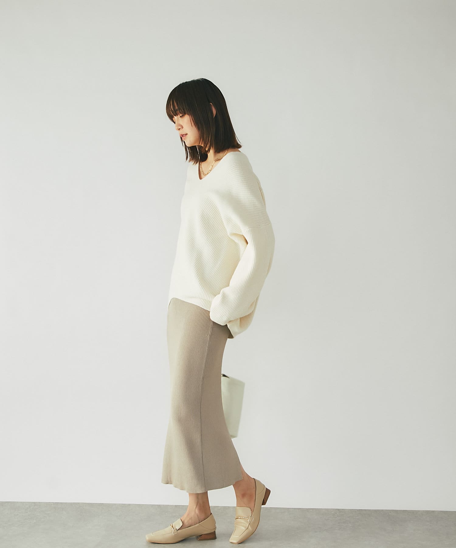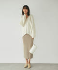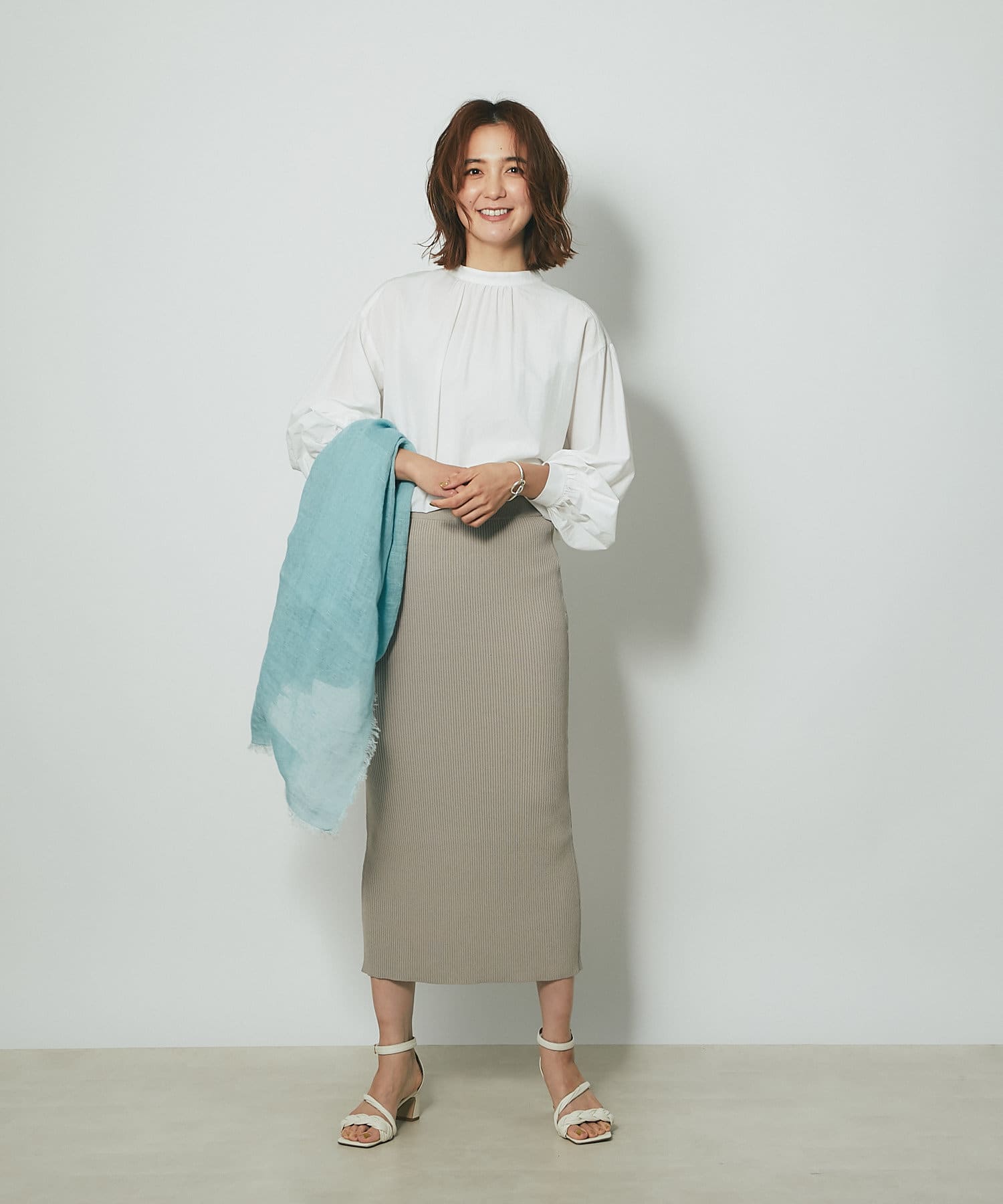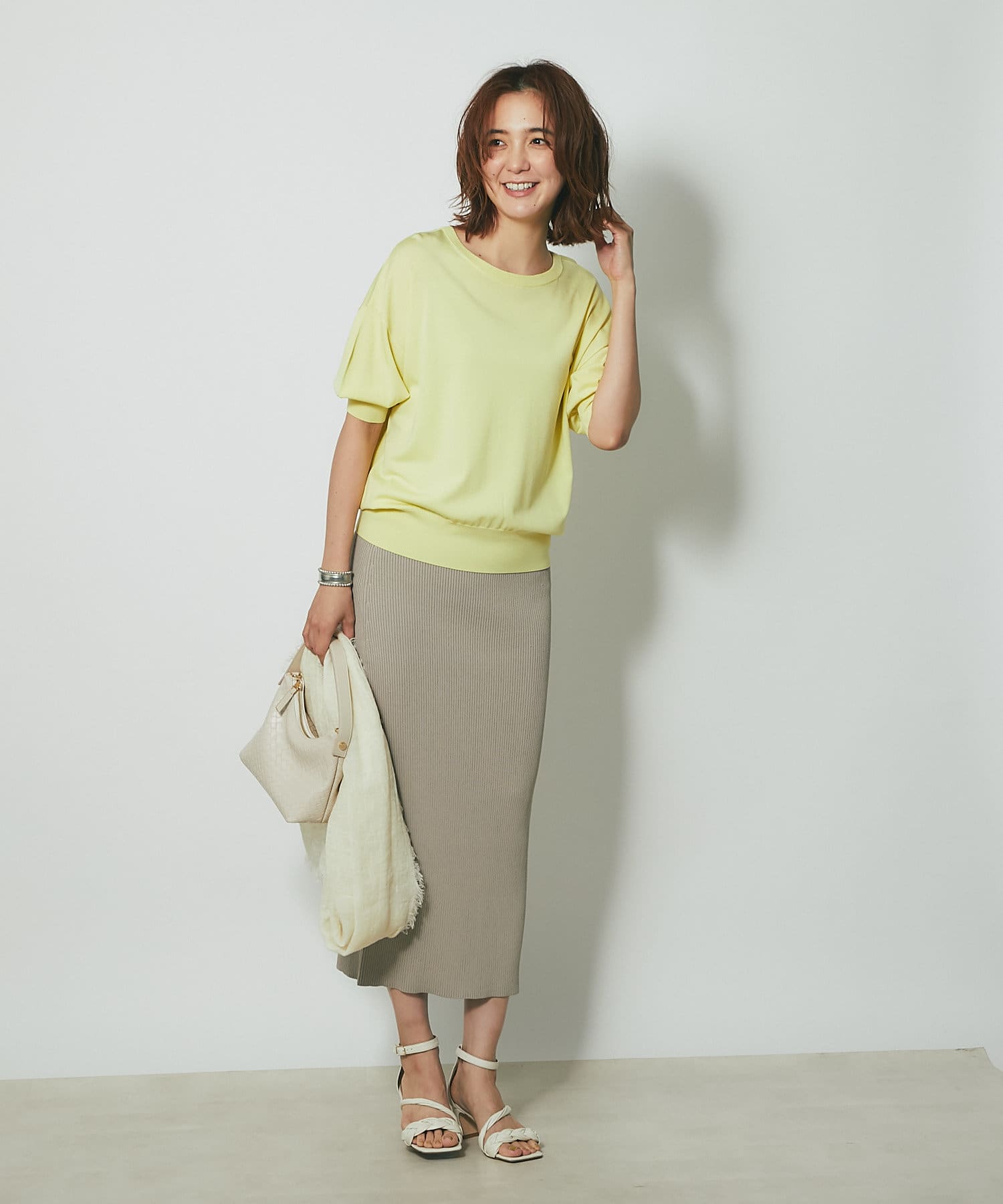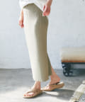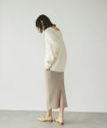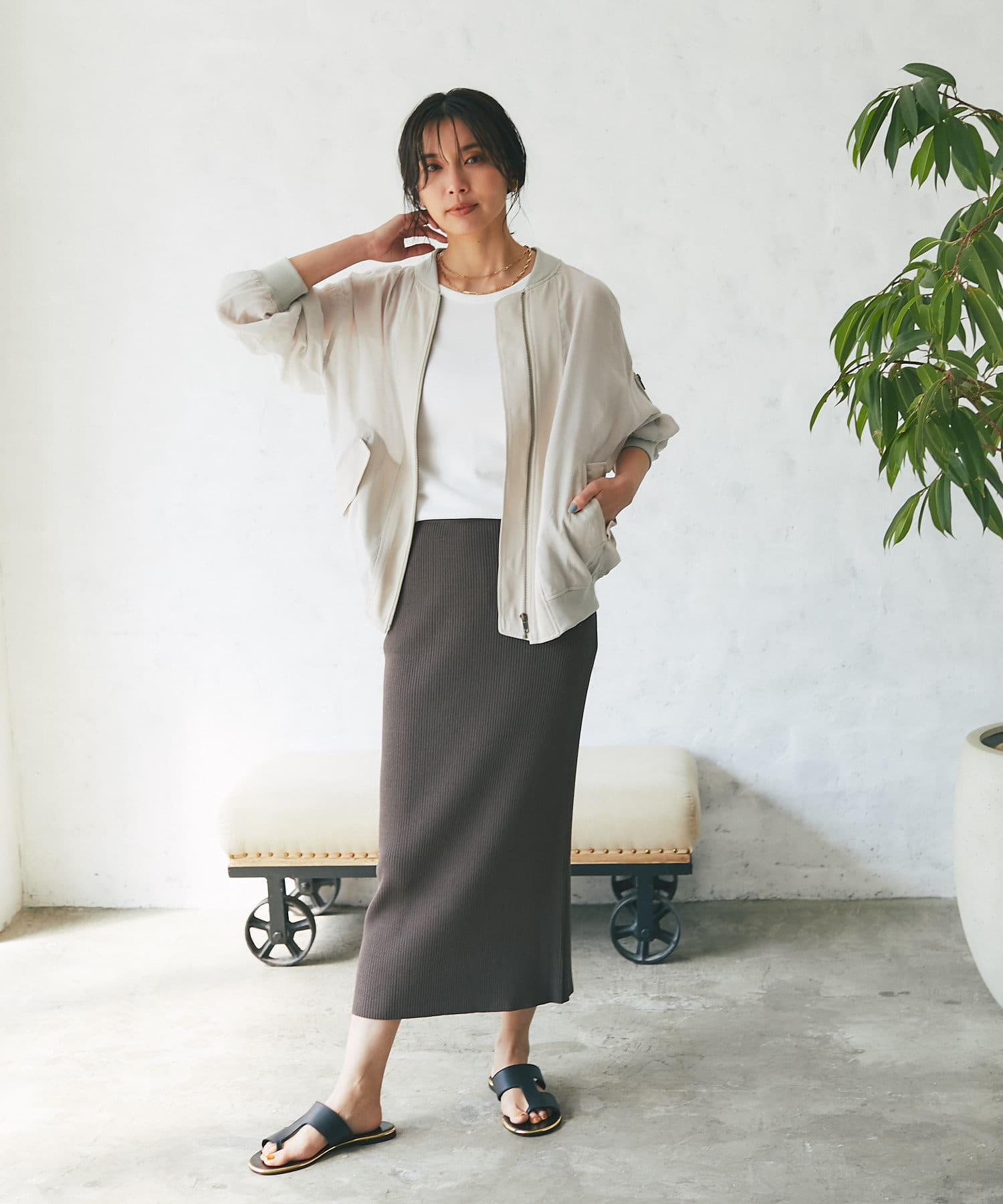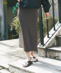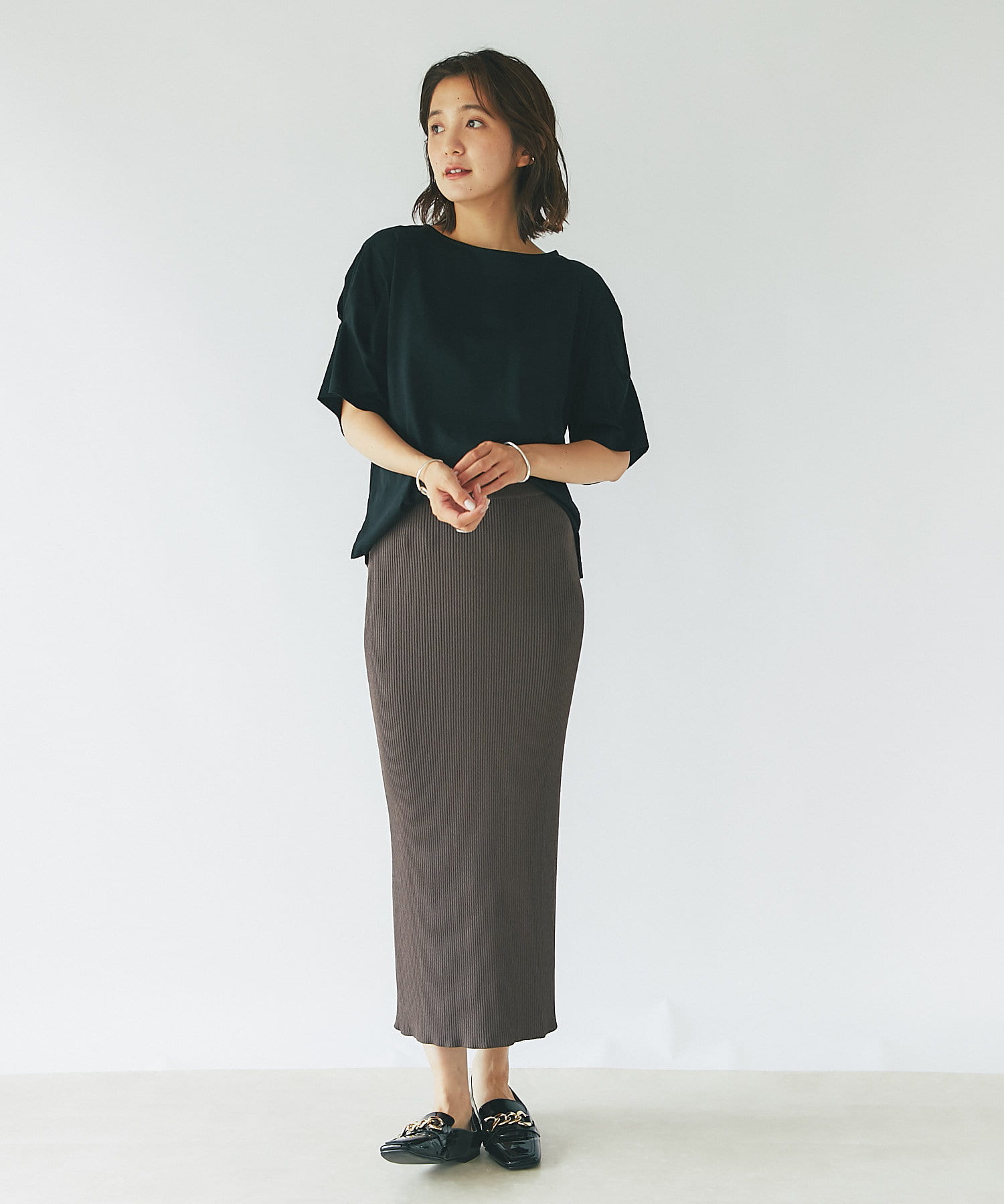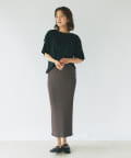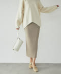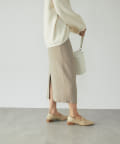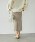 ⇒ニット素材のため全く伸びないわけではありませんが、しっかりした生地感で、伸びるというよりかは身体に馴染むような程よいフィット感に変わっていきます。足さばきもよくストレスフリーで、楽ちんキレイを叶えるスカートです。