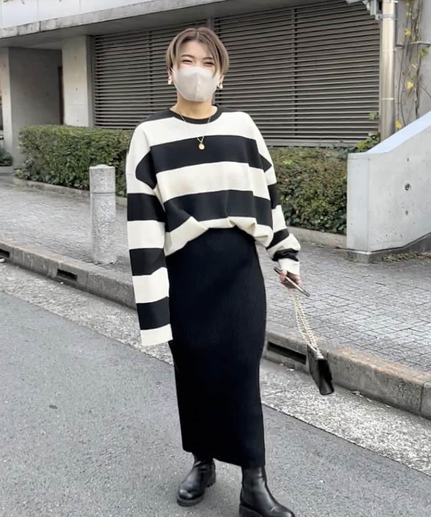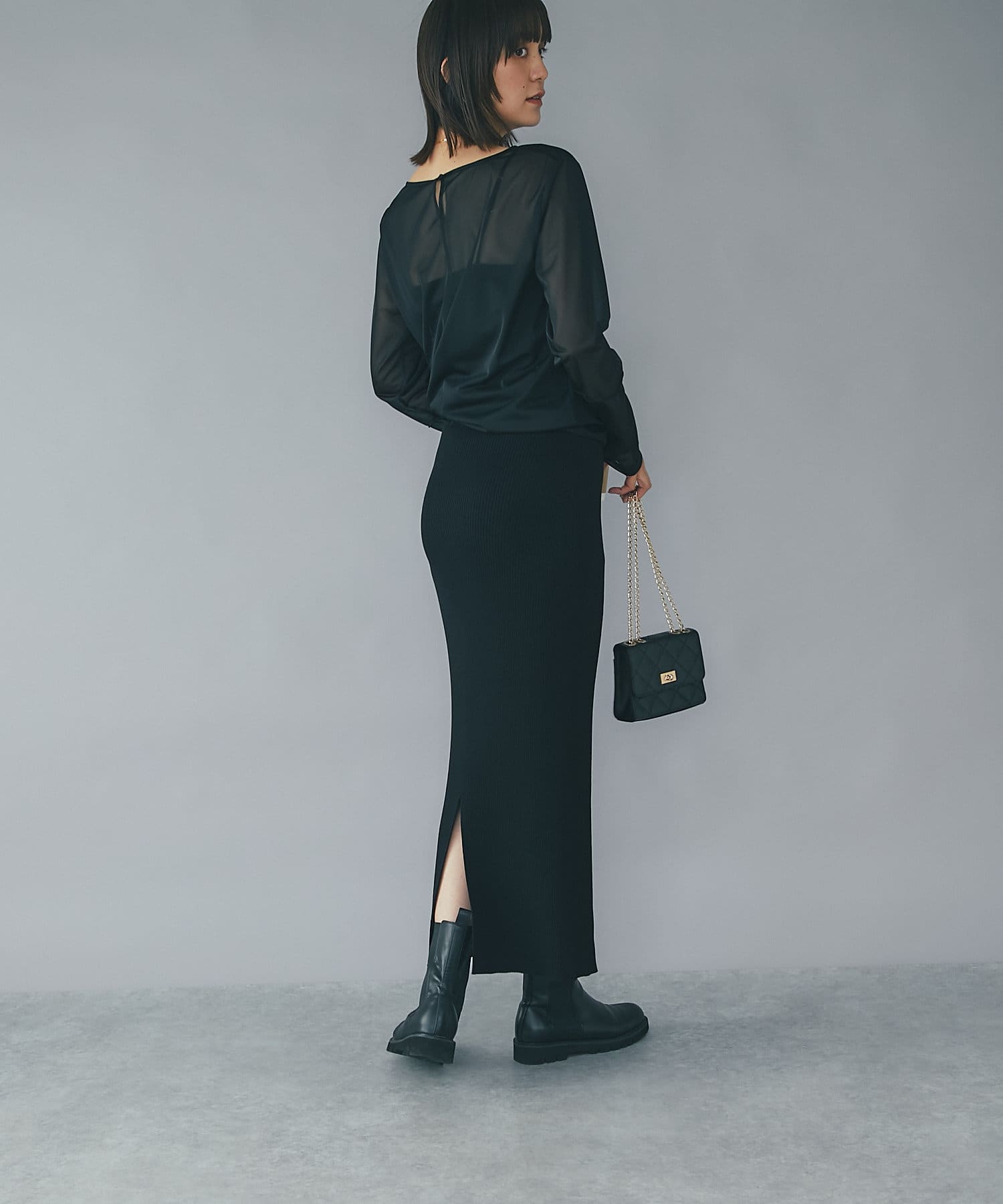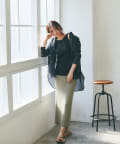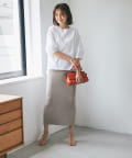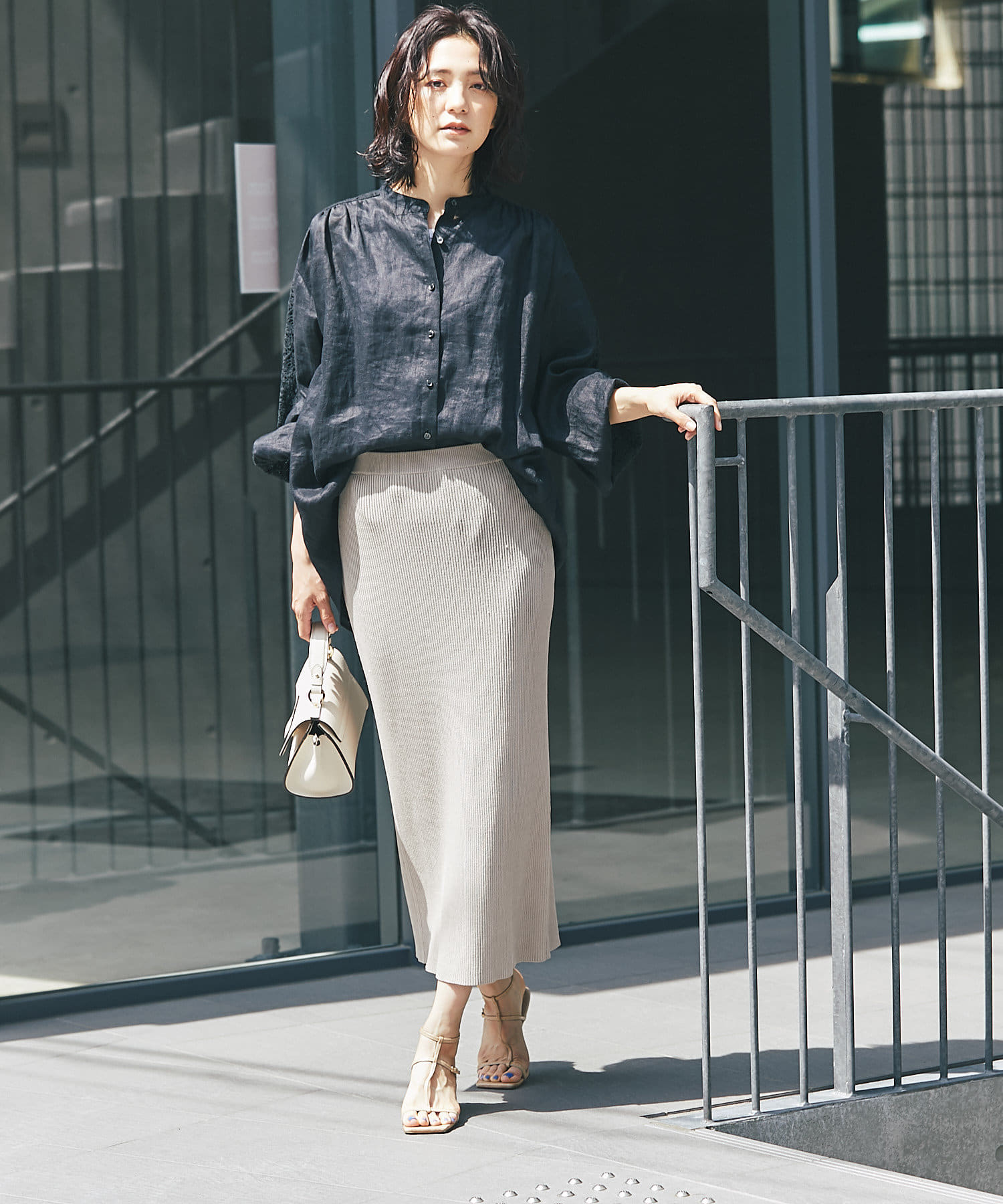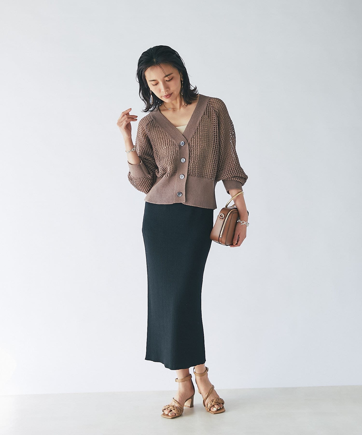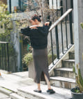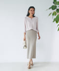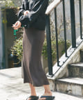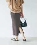 ⇒ニット素材のため全く伸びないわけではありませんが、しっかりした生地感で、伸びるというよりかは身体に馴染むような程よいフィット感に変わっていきます。足さばきもよくストレスフリーで、楽ちんキレイを叶えるスカートです。