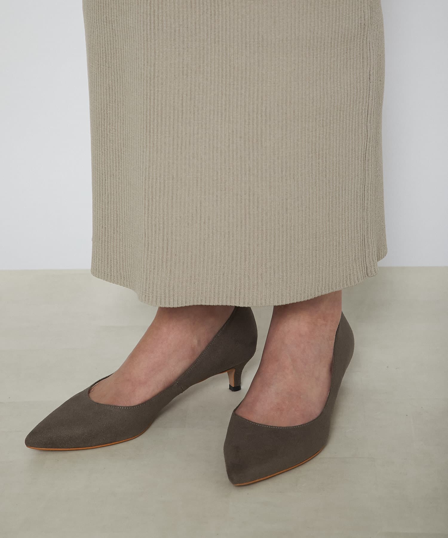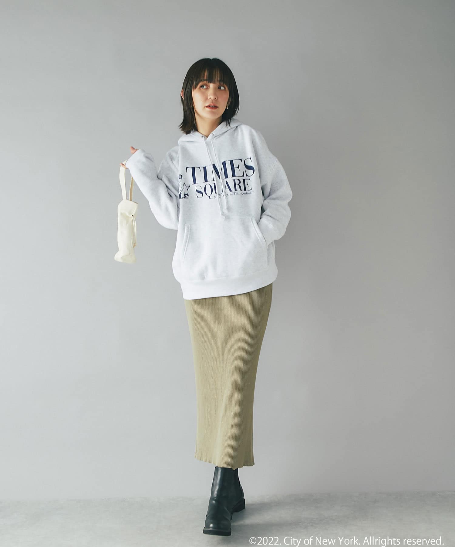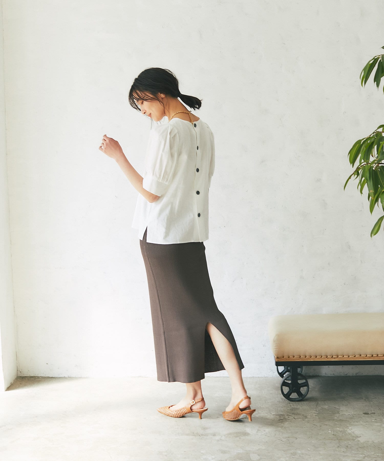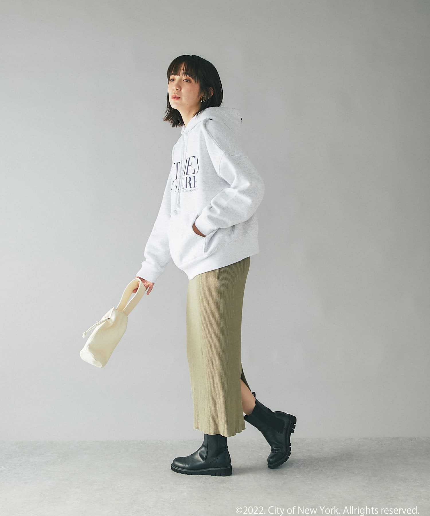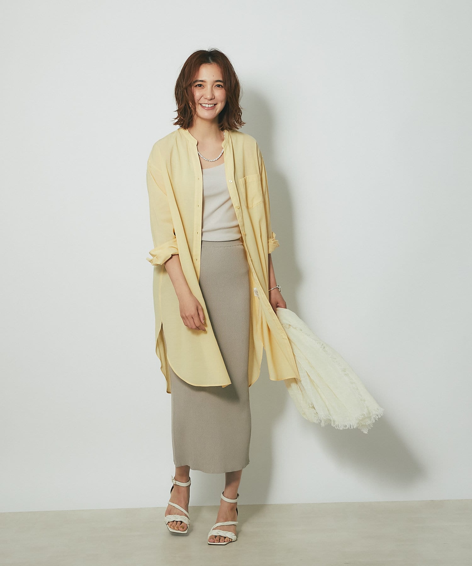 ⇒ニット素材のため全く伸びないわけではありませんが、しっかりした生地感で、伸びるというよりかは身体に馴染むような程よいフィット感に変わっていきます。足さばきもよくストレスフリーで、楽ちんキレイを叶えるスカートです。