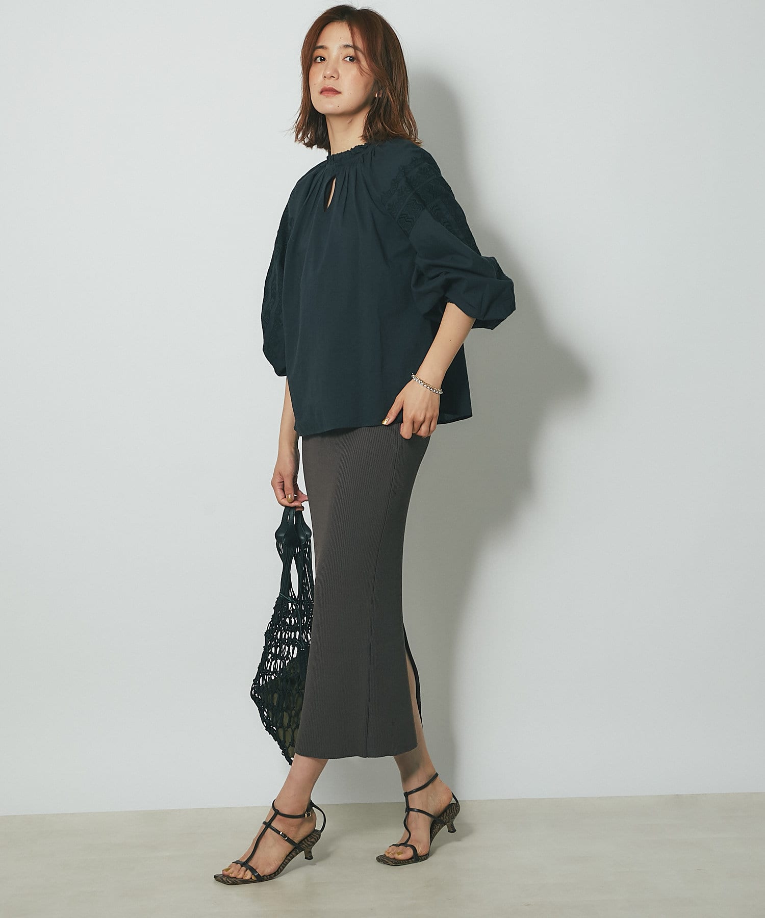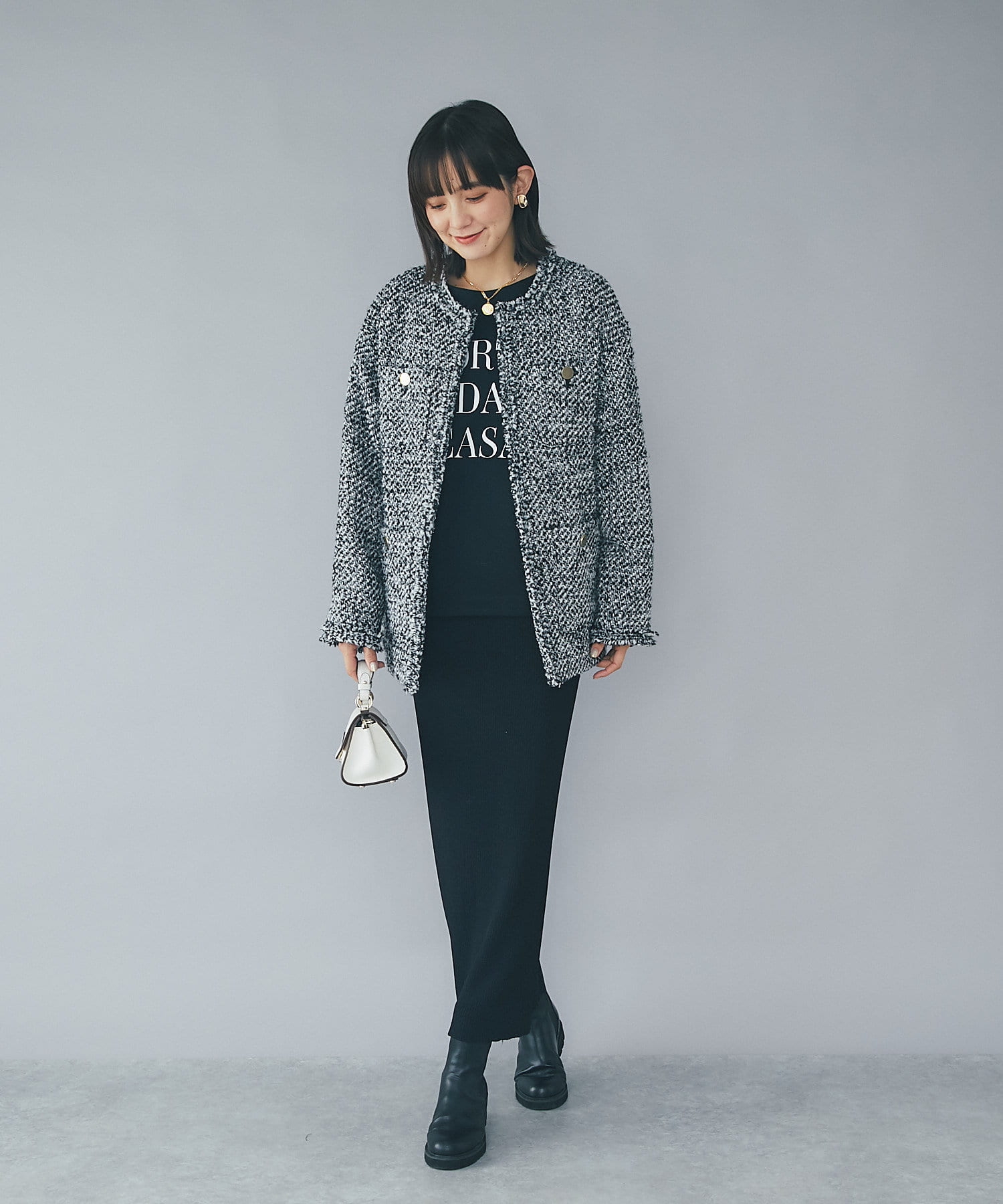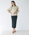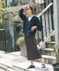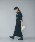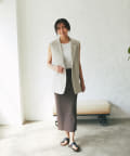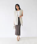 引き続きトレンドのオーバーサイズシャツや袖にボリュームのあるデザインブラウスに合わせて、ボリュームの緩急をつけたスタイリングや、また同素材のVベックベストやカーディガンに合わせてセットアップとして着用するのもおススメなコーディネートです。