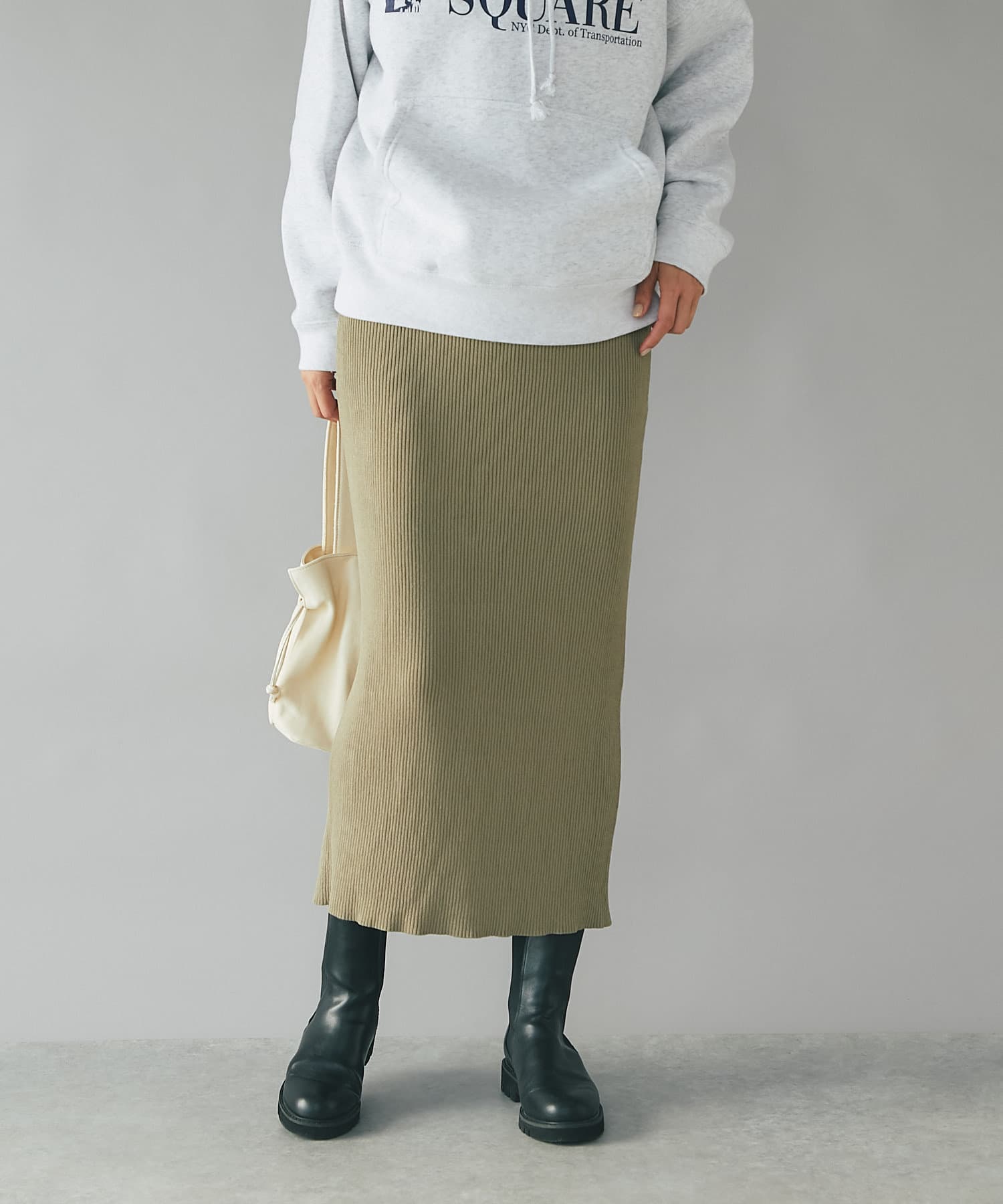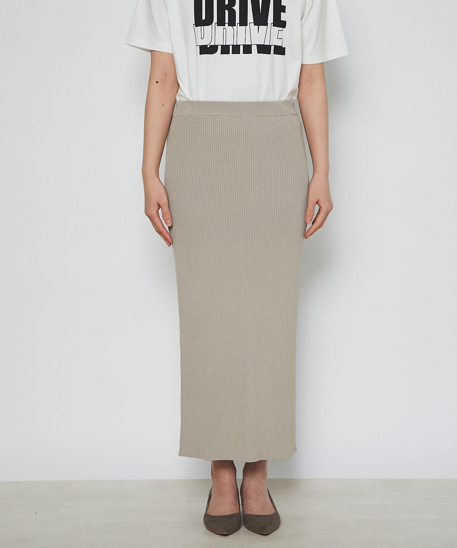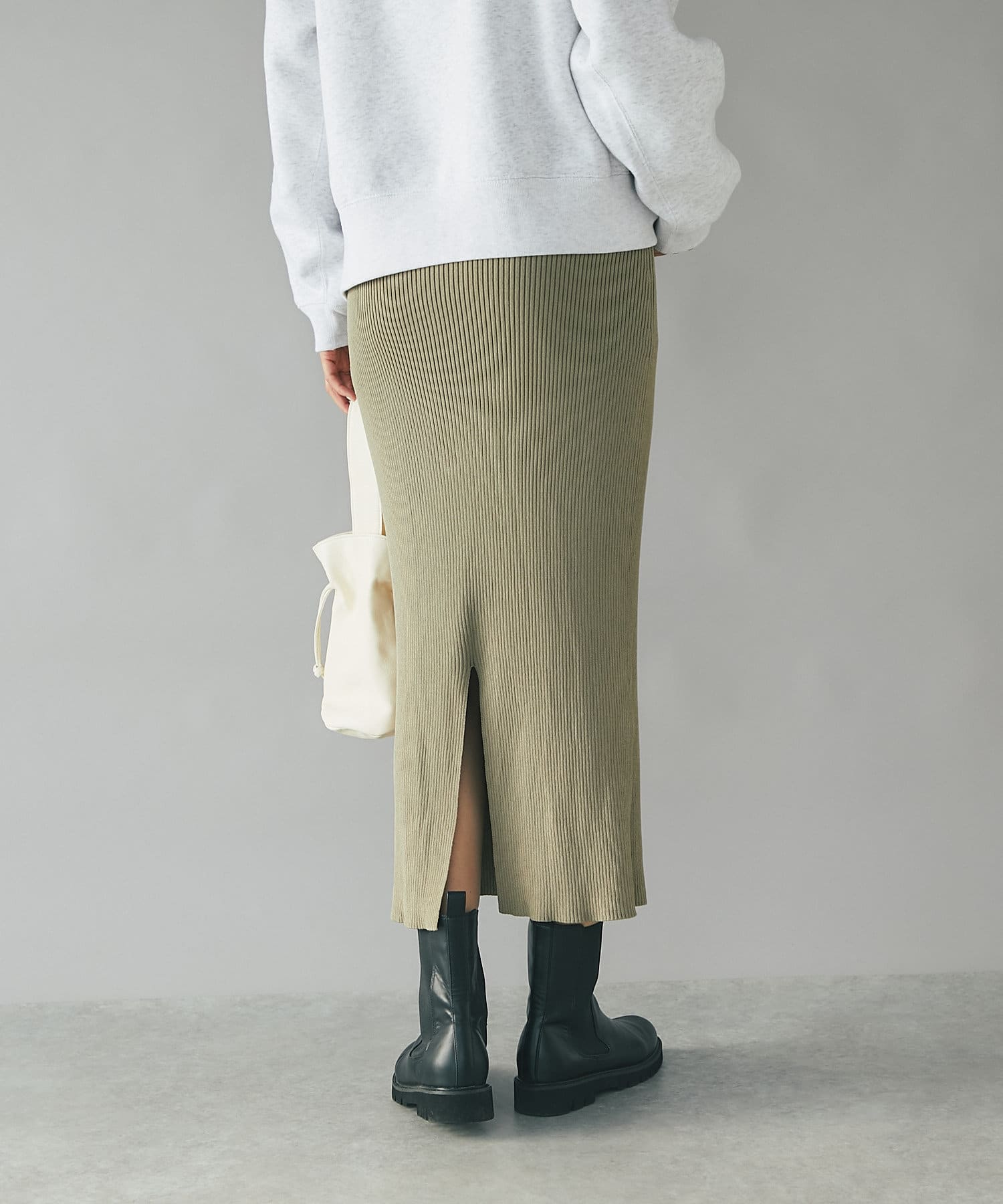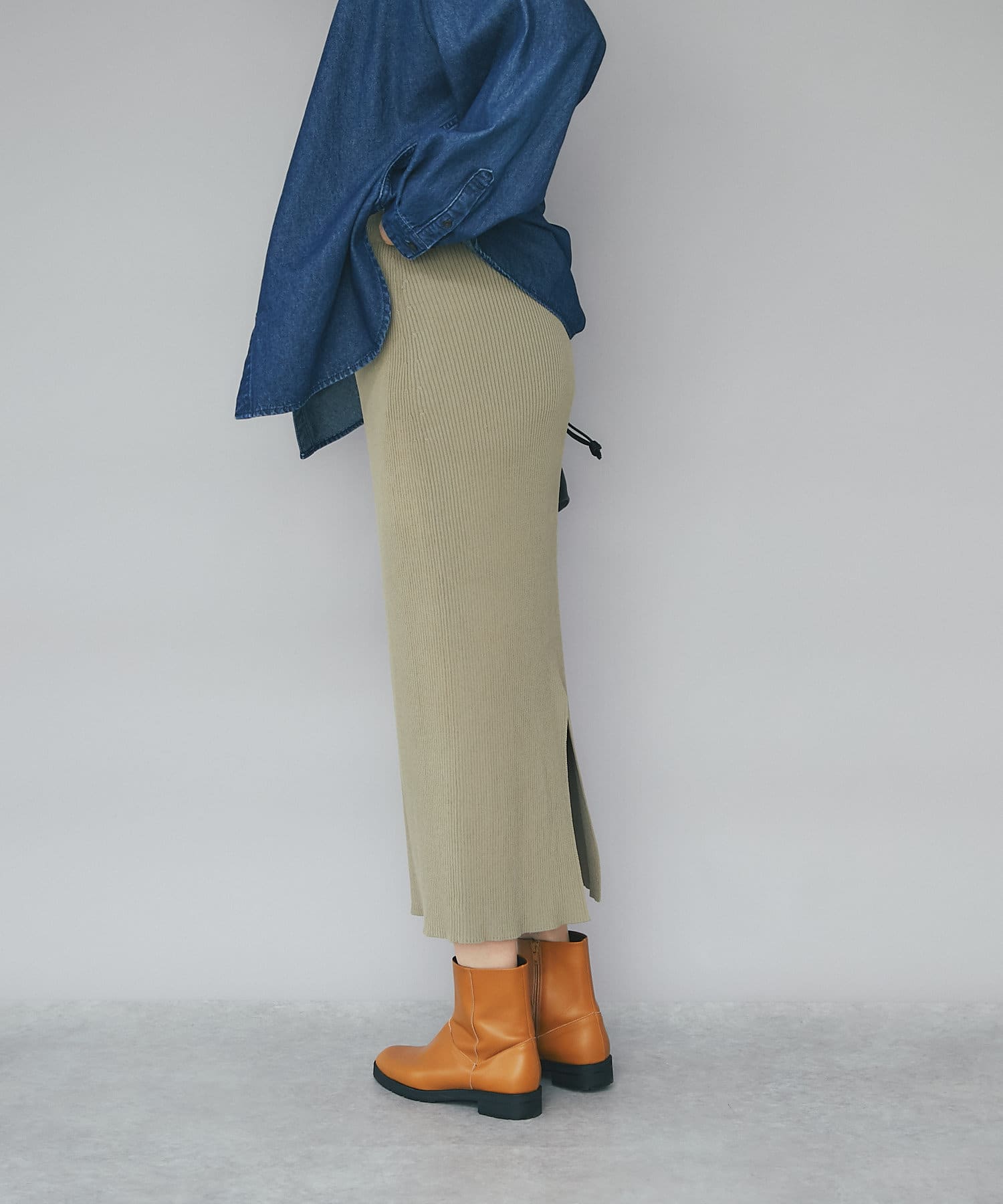 履き心地抜群なリブタイトスカート。ストレッチが効いているのでIラインシルエットですがとても動きやすいです!38サイズを着用し、足首上の長さです。普段使いしやすいベージュとブラックはもちろん、春夏に履きたい鮮やかなグリーンもかなりオススメ◎