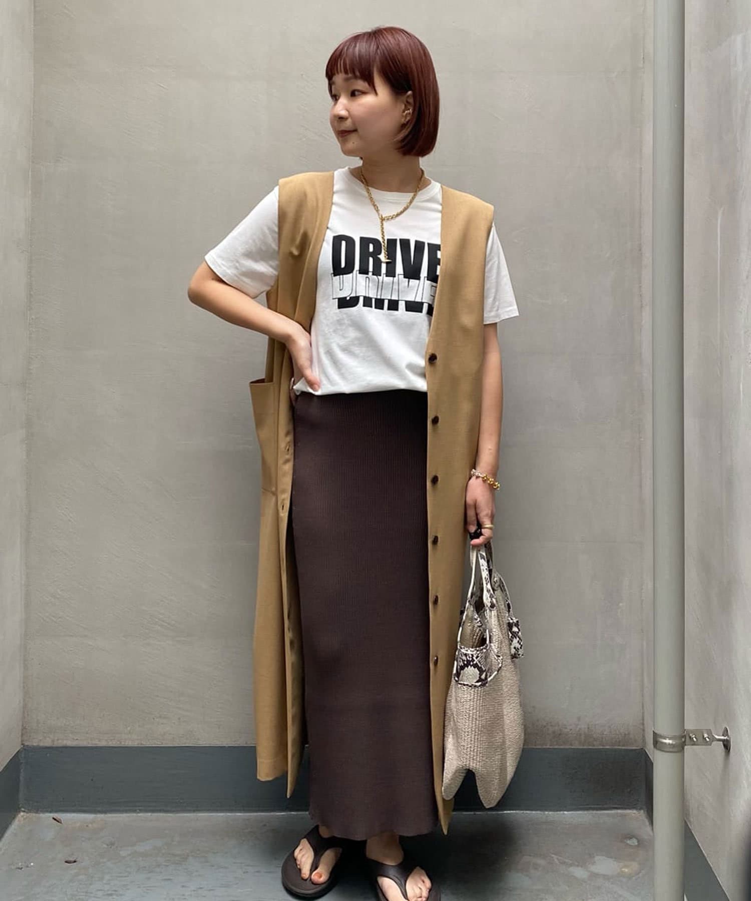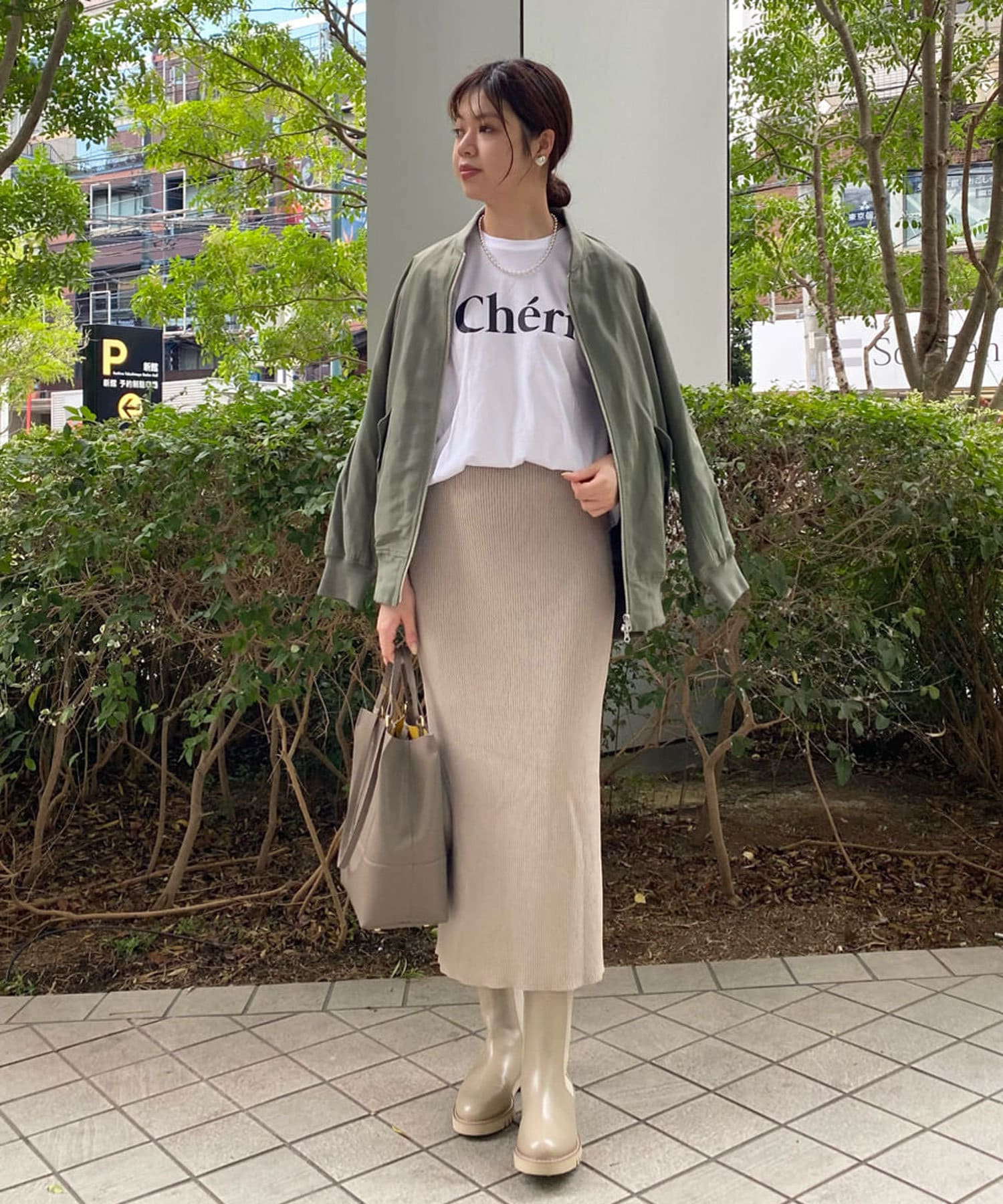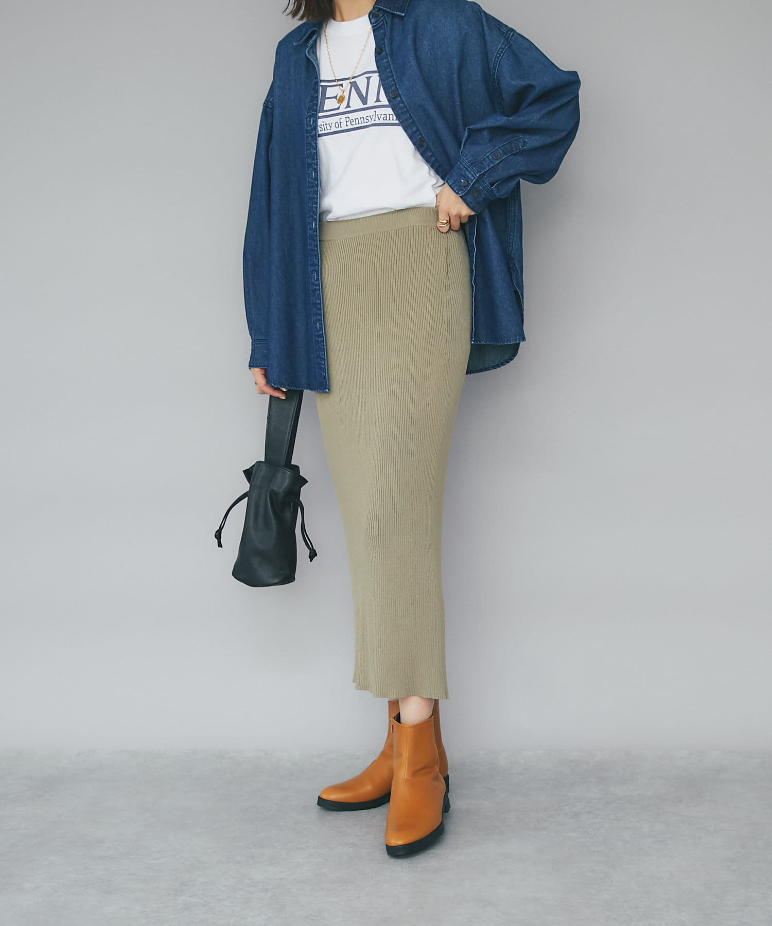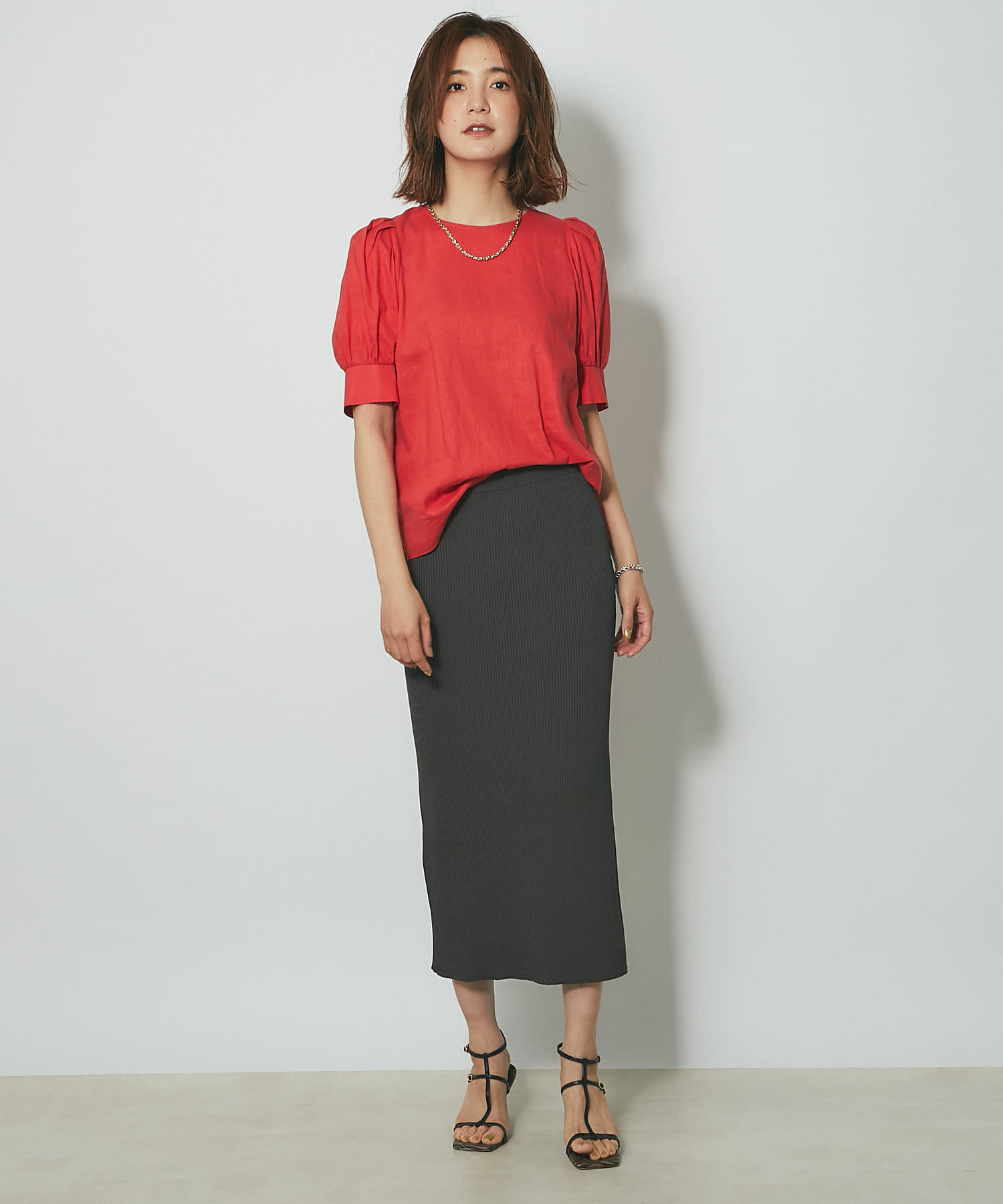 履き心地抜群なリブタイトスカート。ストレッチが効いているのでIラインシルエットですがとても動きやすいです!38サイズを着用し、足首上の長さです。普段使いしやすいベージュとブラックはもちろん、春夏に履きたい鮮やかなグリーンもかなりオススメ◎