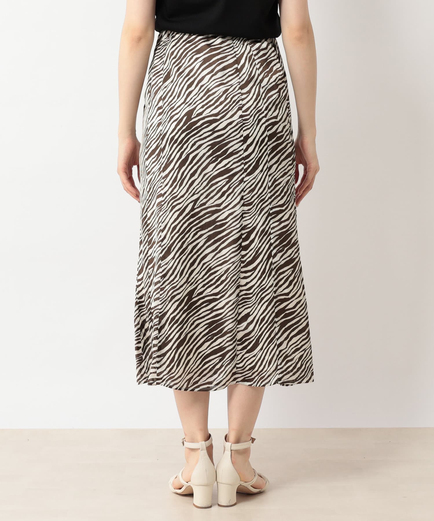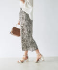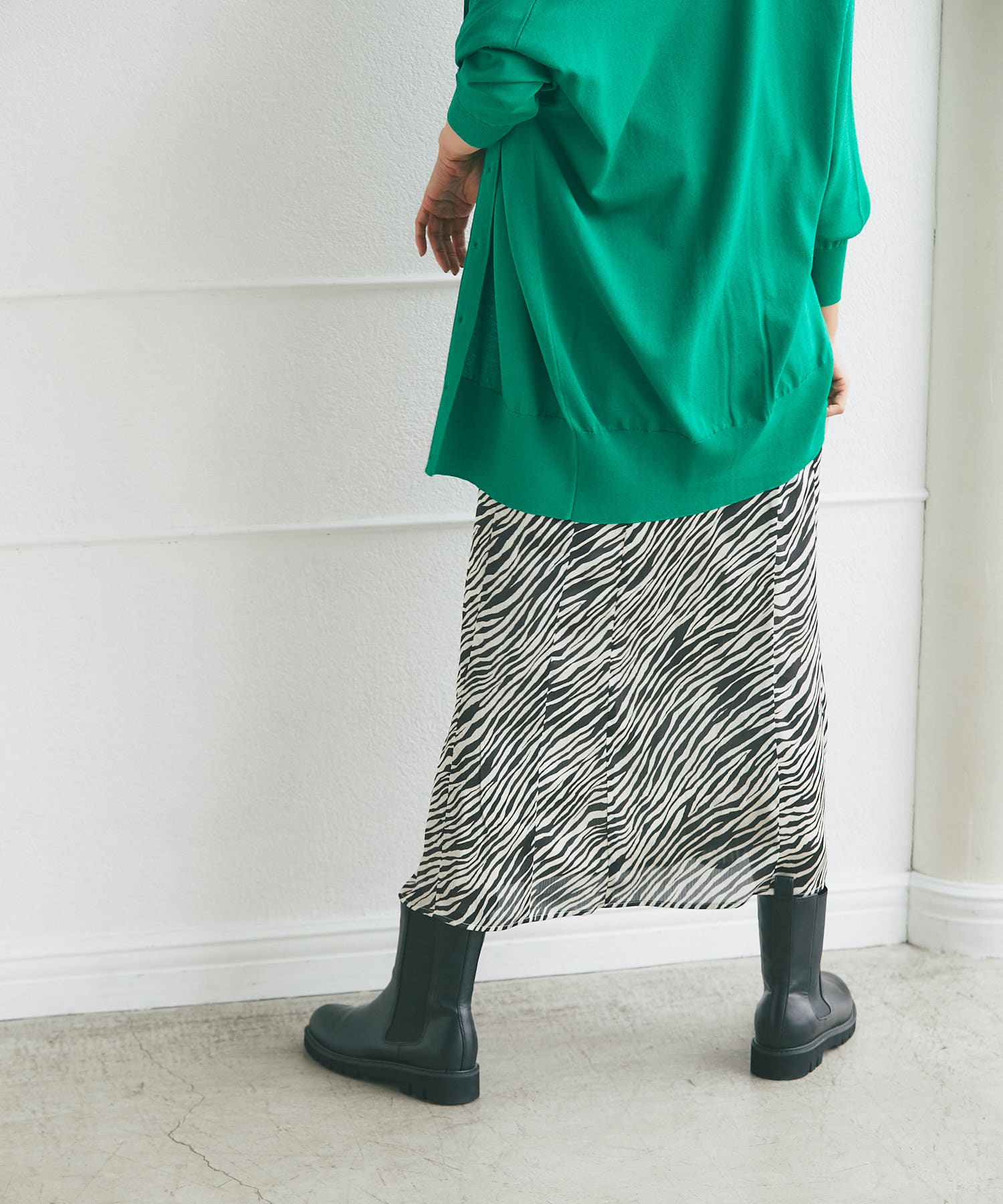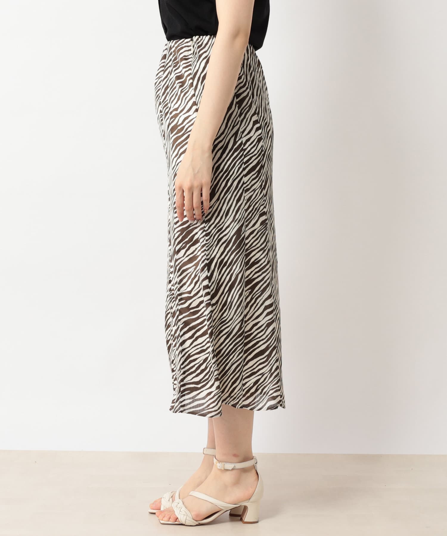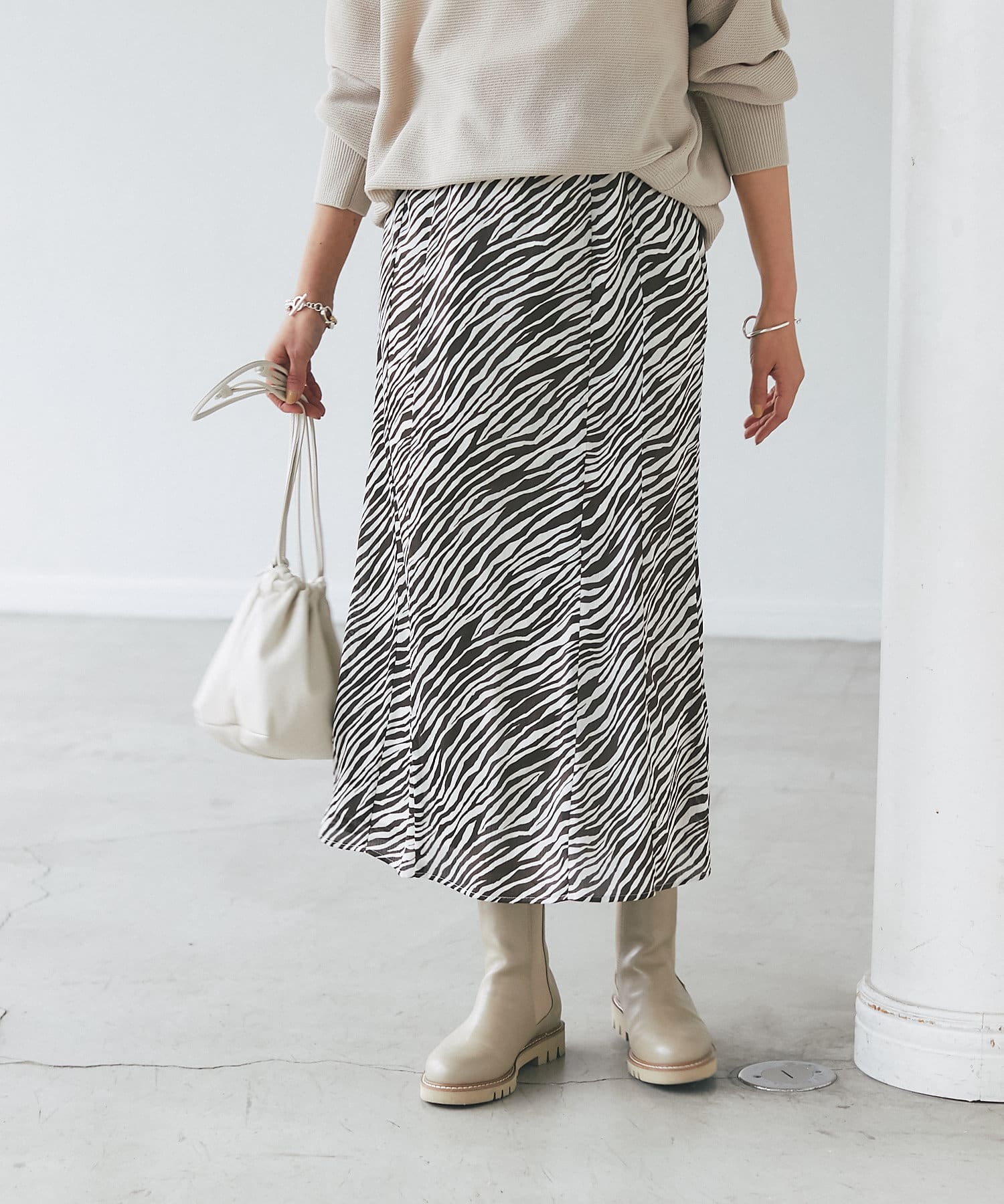 コーディネートに映えること間違いなしのゼブラ柄スカート。タイトながら動きのあるシルエットで長すぎない丈感のため、移動の多い日も気負わずにおしゃれを楽しめます。柄の程よい大きさもコーデにとりいれやすく、また鋭く見えがちなゼブラ柄を透け感のあるサテン楊柳にプリントすることで繊細な印象にしています。