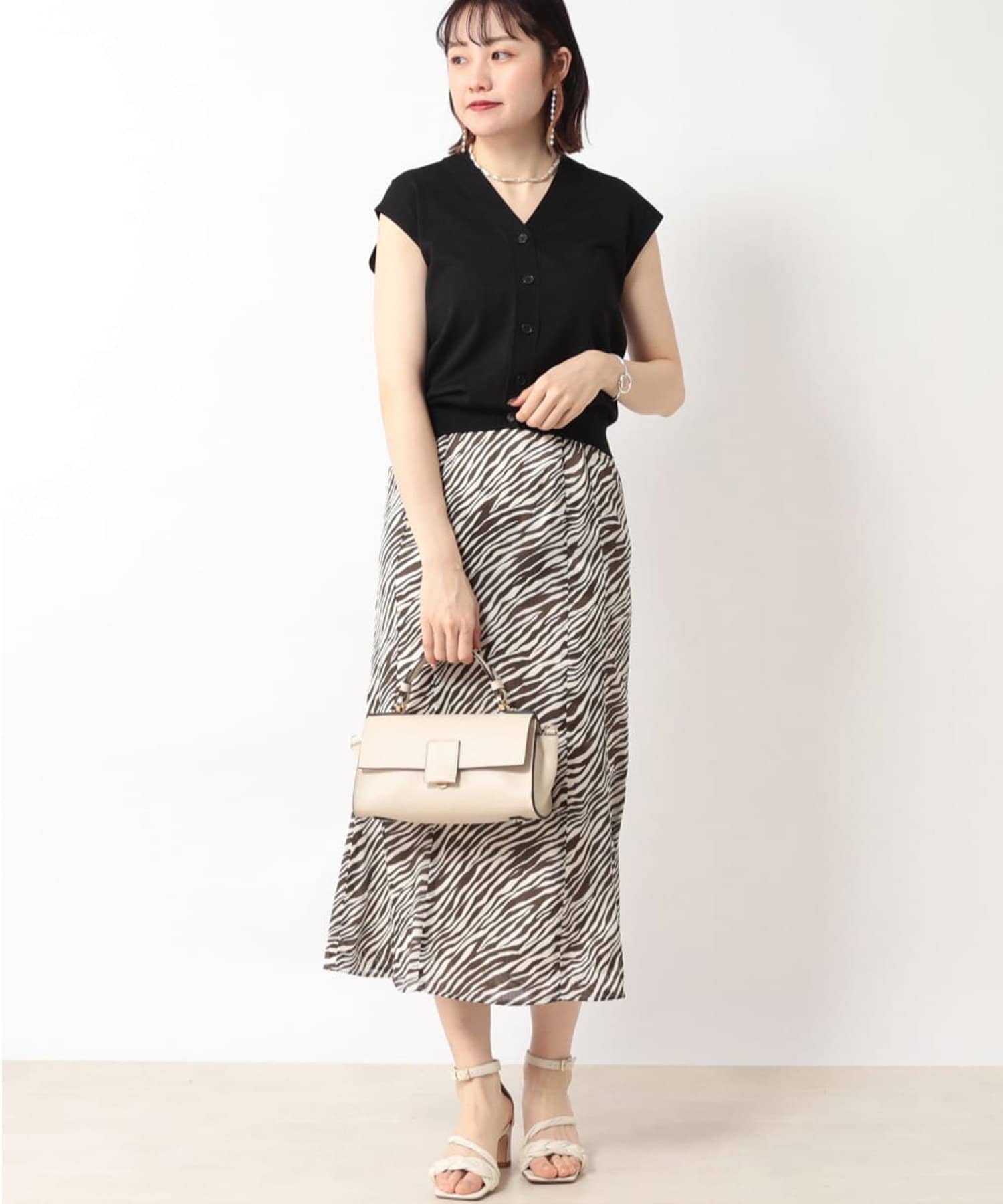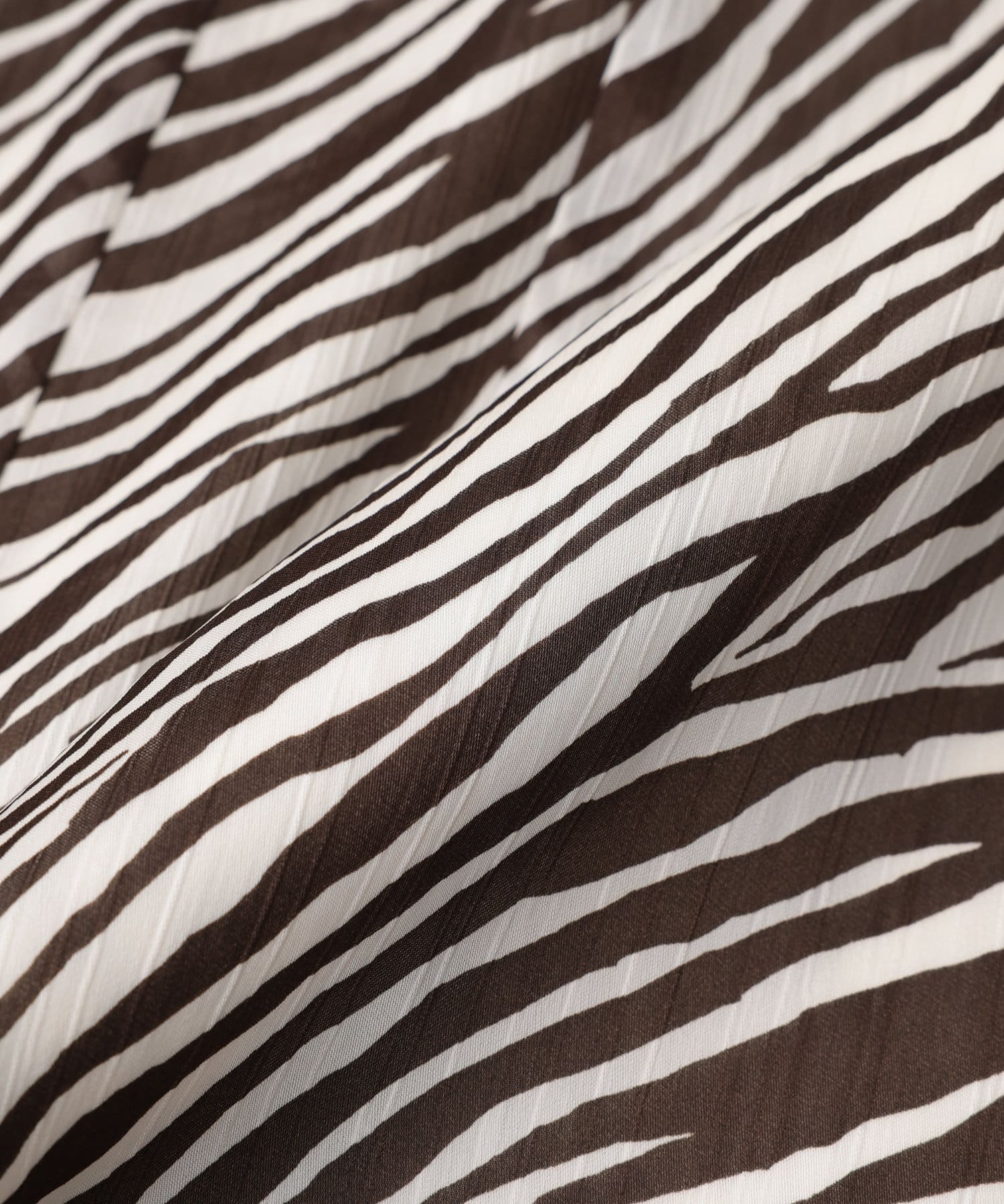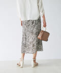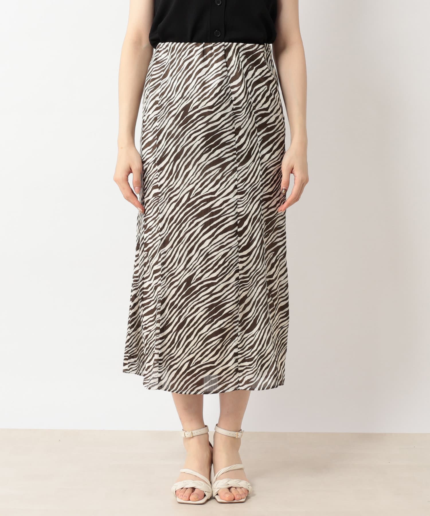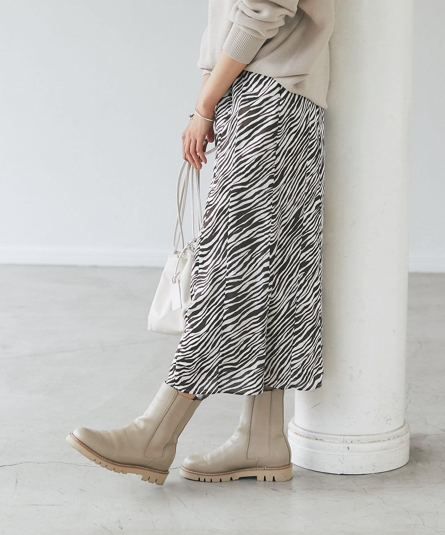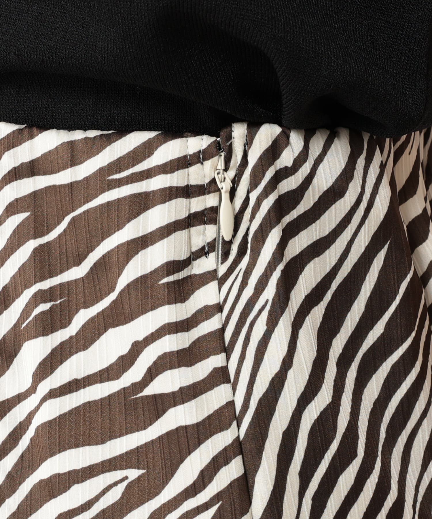 コーディネートに映えること間違いなしのゼブラ柄スカート。タイトながら動きのあるシルエットで長すぎない丈感のため、移動の多い日も気負わずにおしゃれを楽しめます。柄の程よい大きさもコーデにとりいれやすく、また鋭く見えがちなゼブラ柄を透け感のあるサテン楊柳にプリントすることで繊細な印象にしています。