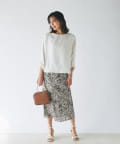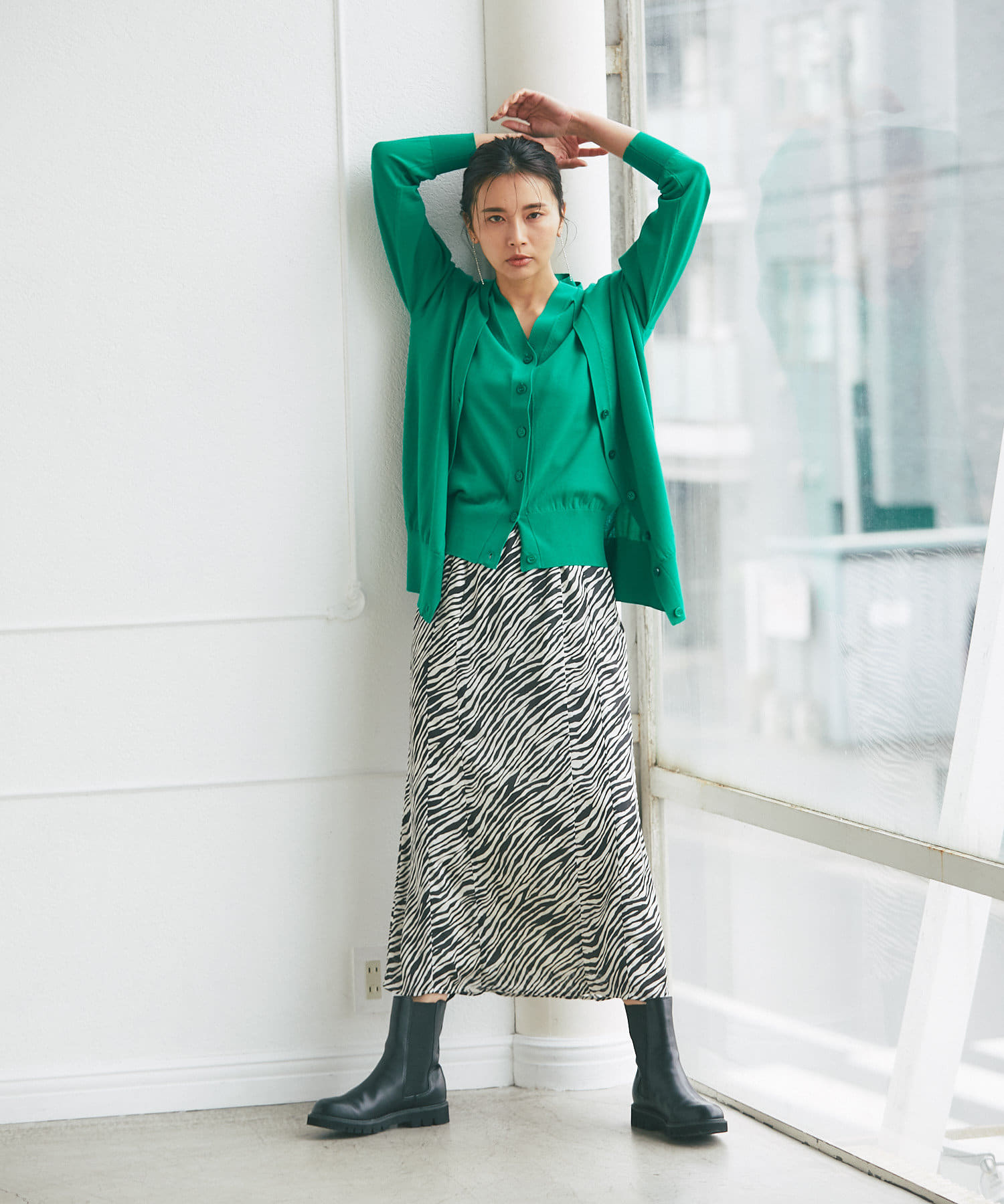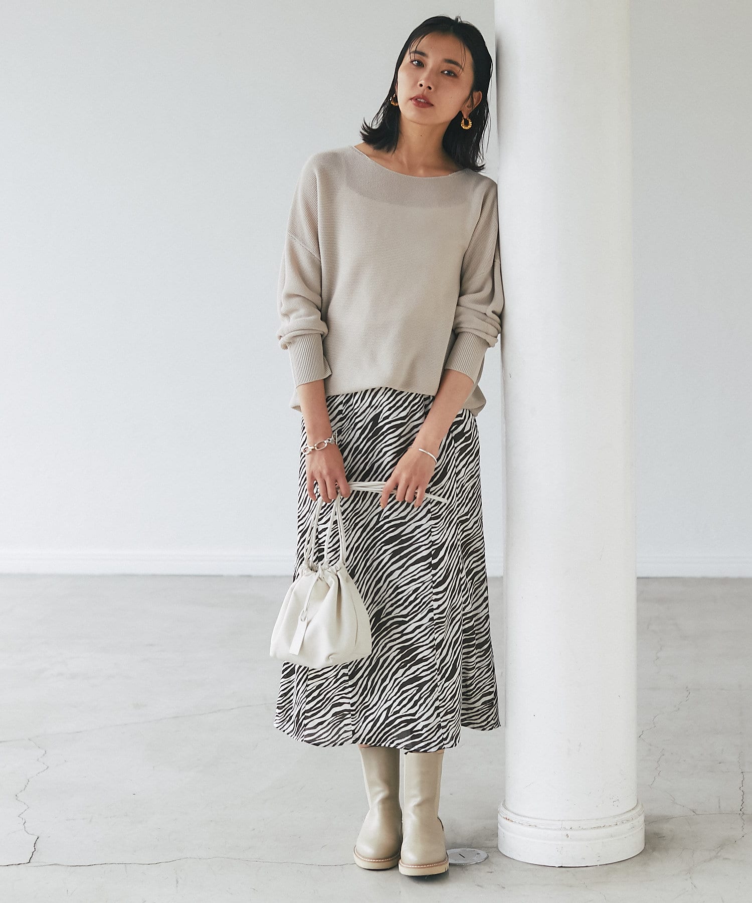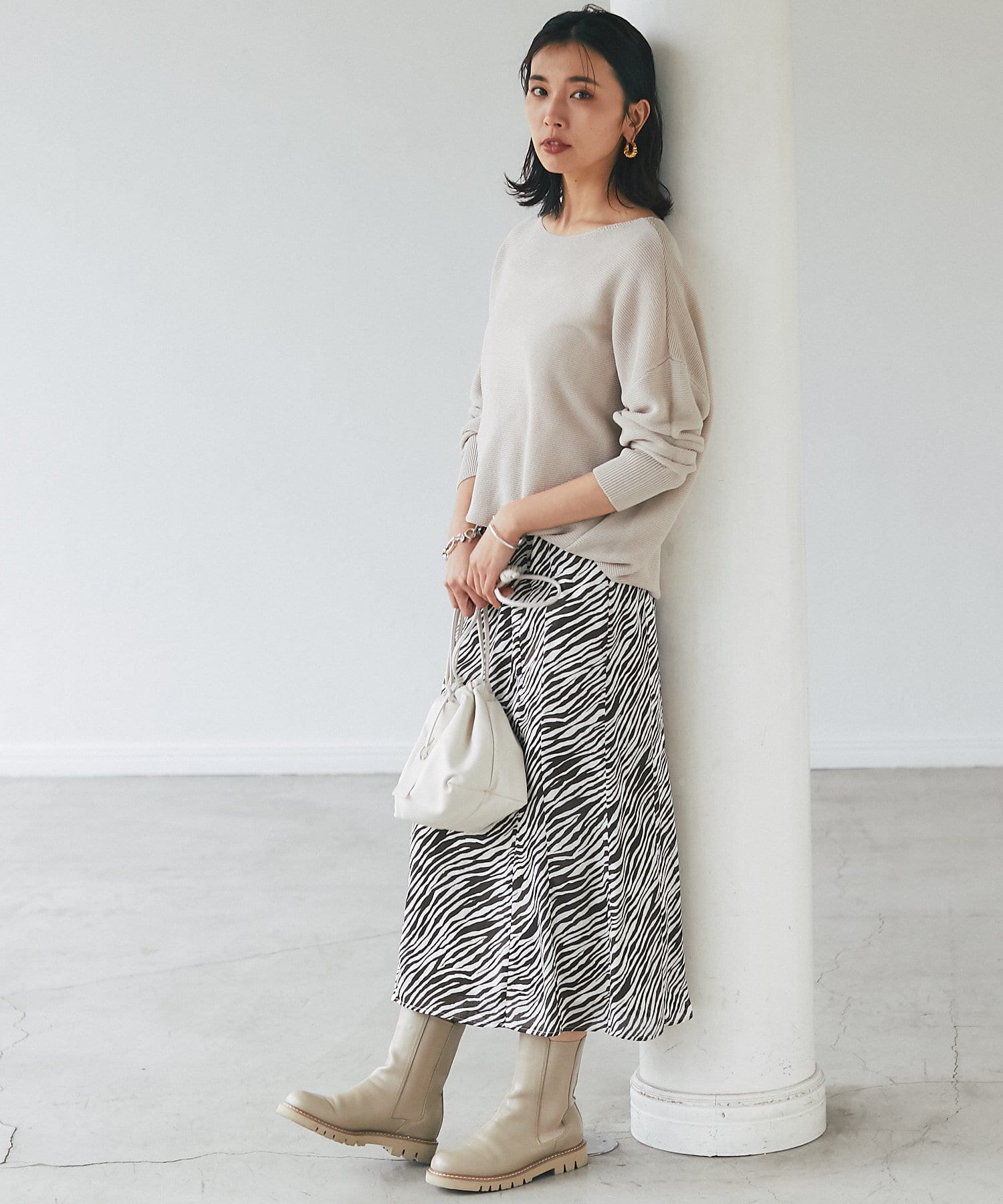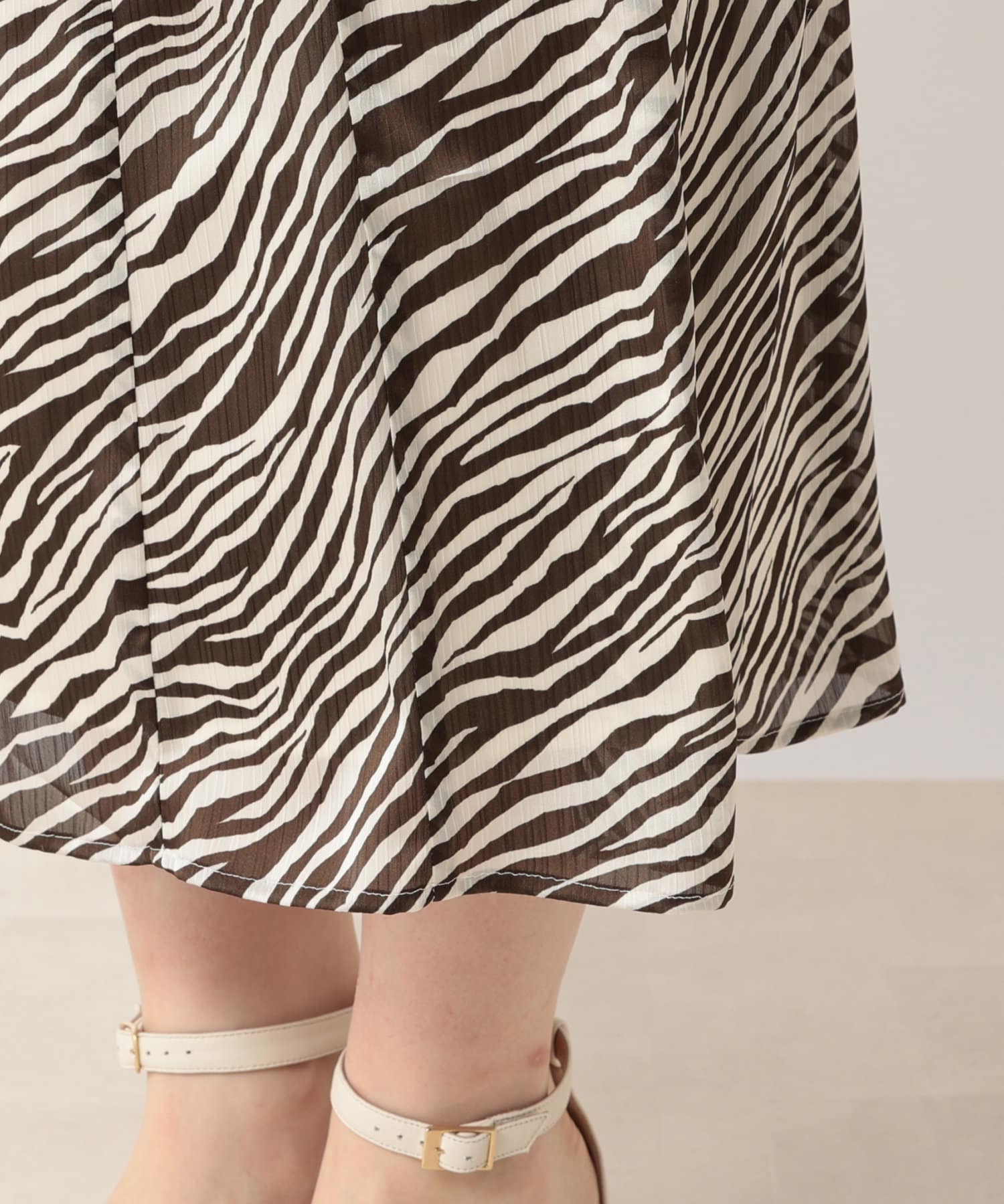 コーディネートに映えること間違いなしのゼブラ柄スカート。タイトながら動きのあるシルエットで長すぎない丈感のため、移動の多い日も気負わずにおしゃれを楽しめます。柄の程よい大きさもコーデにとりいれやすく、また鋭く見えがちなゼブラ柄を透け感のあるサテン楊柳にプリントすることで繊細な印象にしています。
