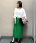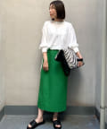 トレンドのグリーンはシンプルなトップスを合わせるだけで華やかな印象に。