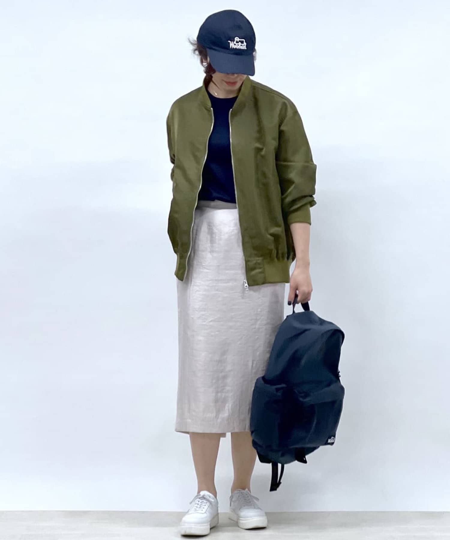 上品なライトベージュのストレートスカートで大人の女性らしさをプラス。ブルゾンとスニーカーというカジュアルな組み合わせにもマッチします。
