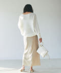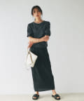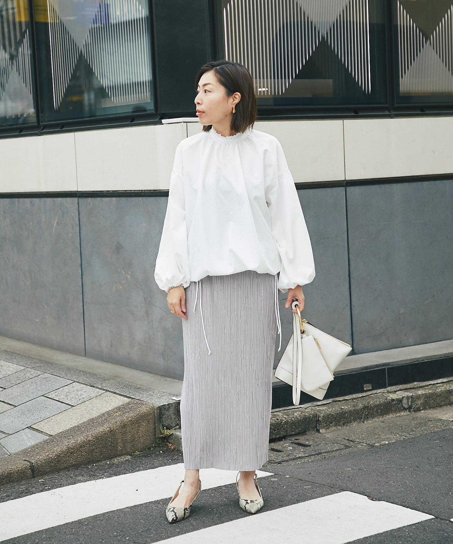 Iラインのスッキリしたシルエットは、チュニック丈のトップスやボリューム袖のブラウスもバランスよくきまります。ご自身の好みでスタイリングしやすいのが嬉しいポイント。