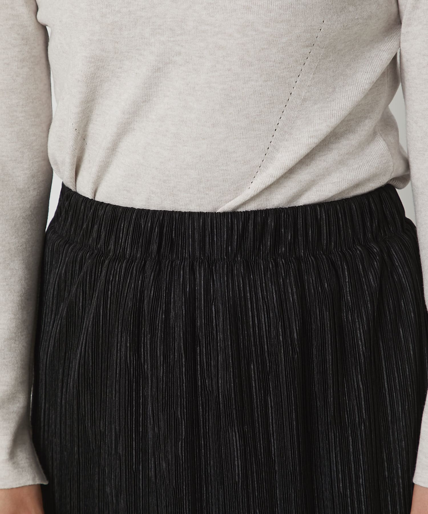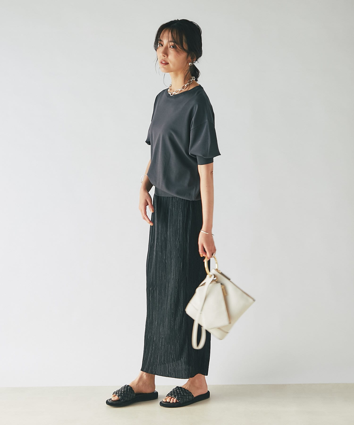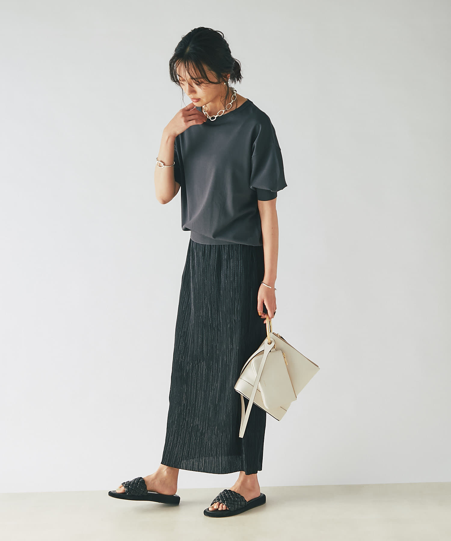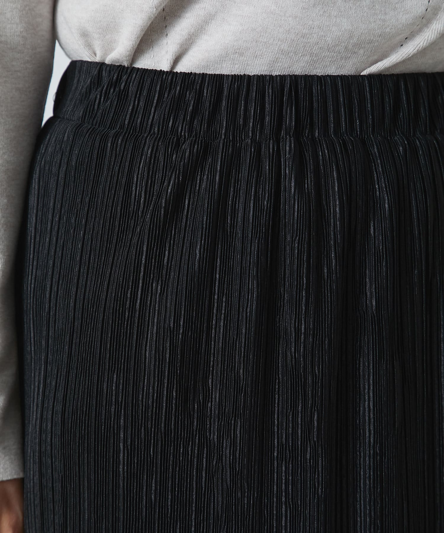 細かなプリーツとやや光沢感のあるプリーツスカートは、カジュアルながらも上品に着用いただけます。裏地もついているため、透け感もなく一枚で着こなすことができ、また柔らかい生地感でピタッとしすぎず着心地の良さも魅力的な一枚です。トップスを変えるだけでカジュアルからキレイめまで雰囲気の変化を楽しめ、着回し力のあるスカートはワードローブの一つとして重宝すること間違いなし。