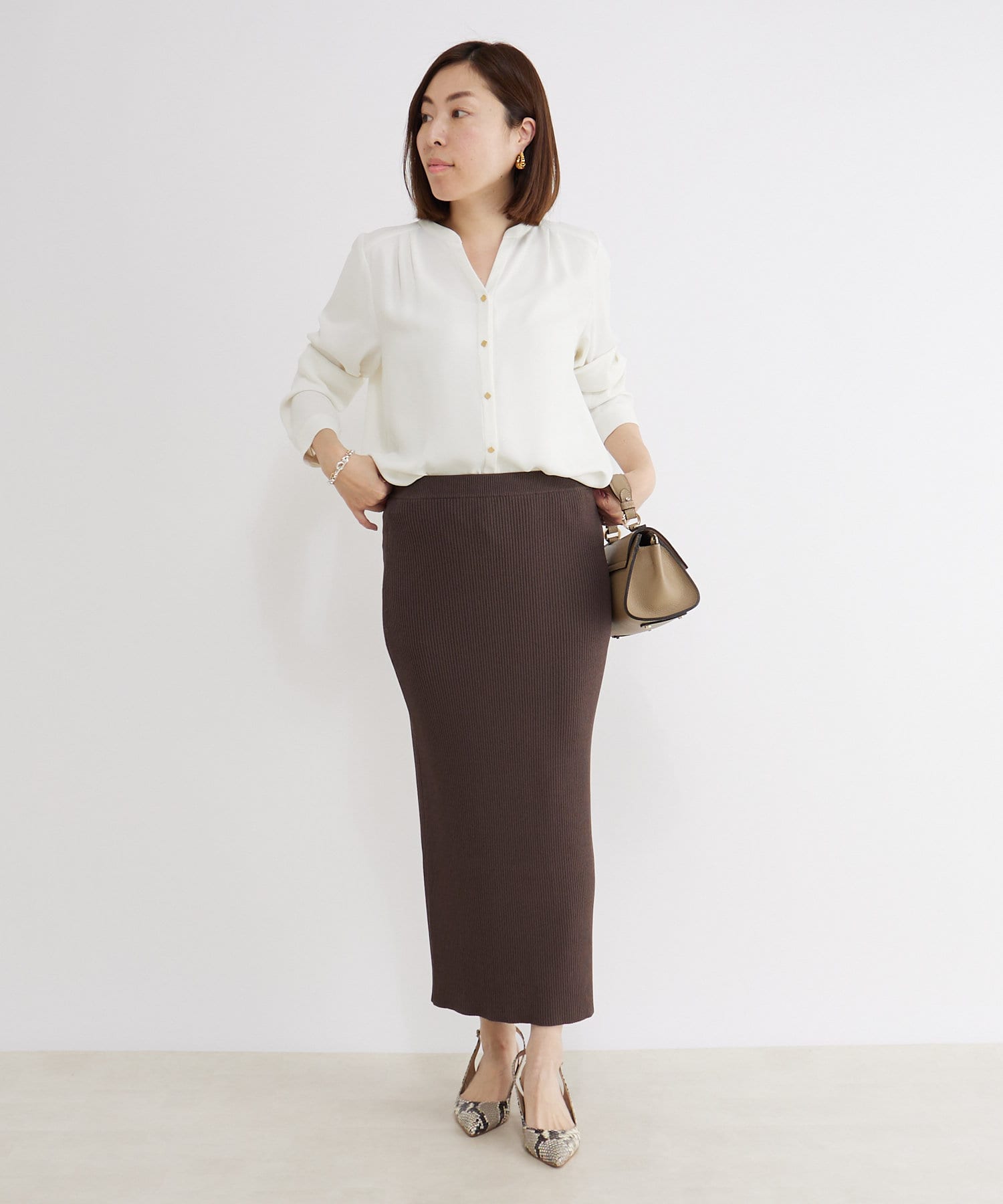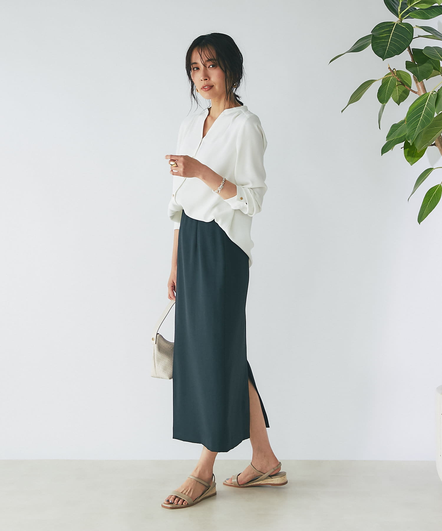 インしてもゴワつかないので、スカートスタイルにインして大人な雰囲気に。